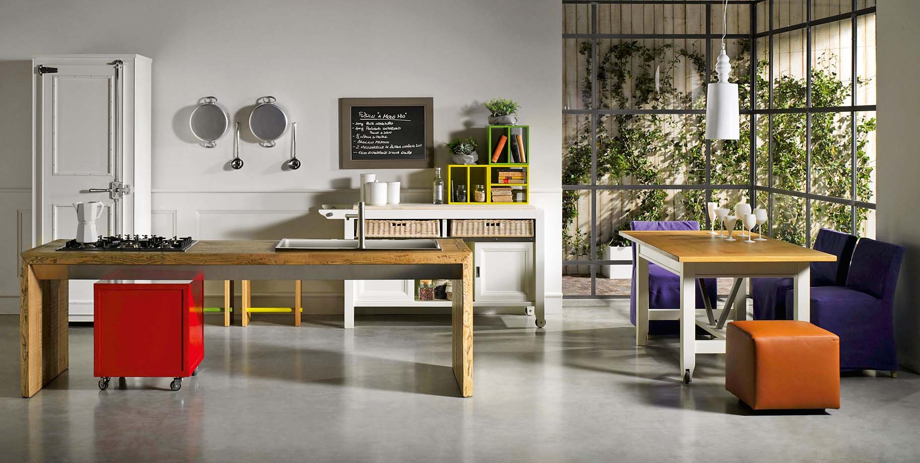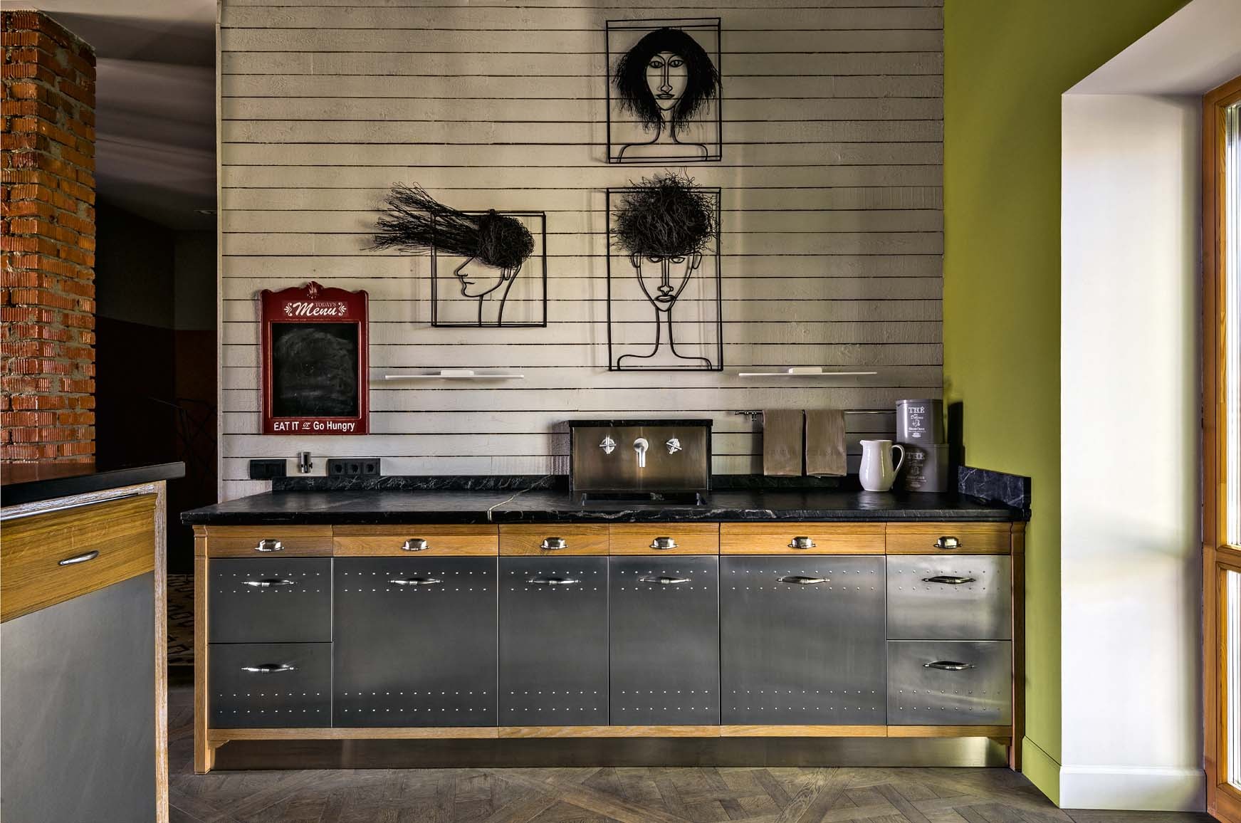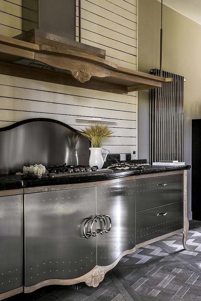 Автор проекта дизайнер СВЕТЛАНА ДИКУШИНА: Идея оформления интерьера родилась благодаря кухонной мебели с металлическими фасадами, увиденной мною на Миланской выставке. Идеальным фоном для неё стали грубые, необработанные доски, покрашенные в светлый цвет и немного состаренные. Всё это помогло создать вариацию стиля лофт, cмешанного с богемным андеграундом, предметами искусства и арт–объектами, что несколько смягчило брутальность лофтовой эстетики».