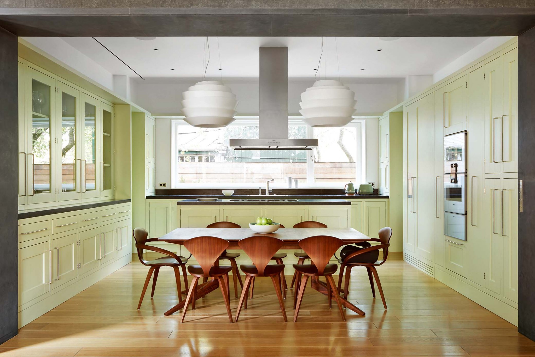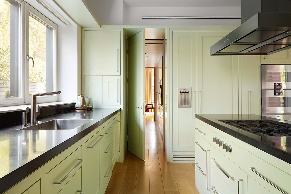 Автор проекта архитектор ДЖЕЙМС СОАНЕ: Этот подмосковный дом выполнен в европейской эстетике, но он не выбивается из российского контекста. Это гостеприимный дом, в котором хозяева живут постоянно, и нам важно было сделать его по-домашнему уютным, но современным. Весь интерьер решён в нейтральных тонах, для кухонной мебели был выбран нежный оттенок зелёного, который гармонирует с паркетом и деревянной мебелью».