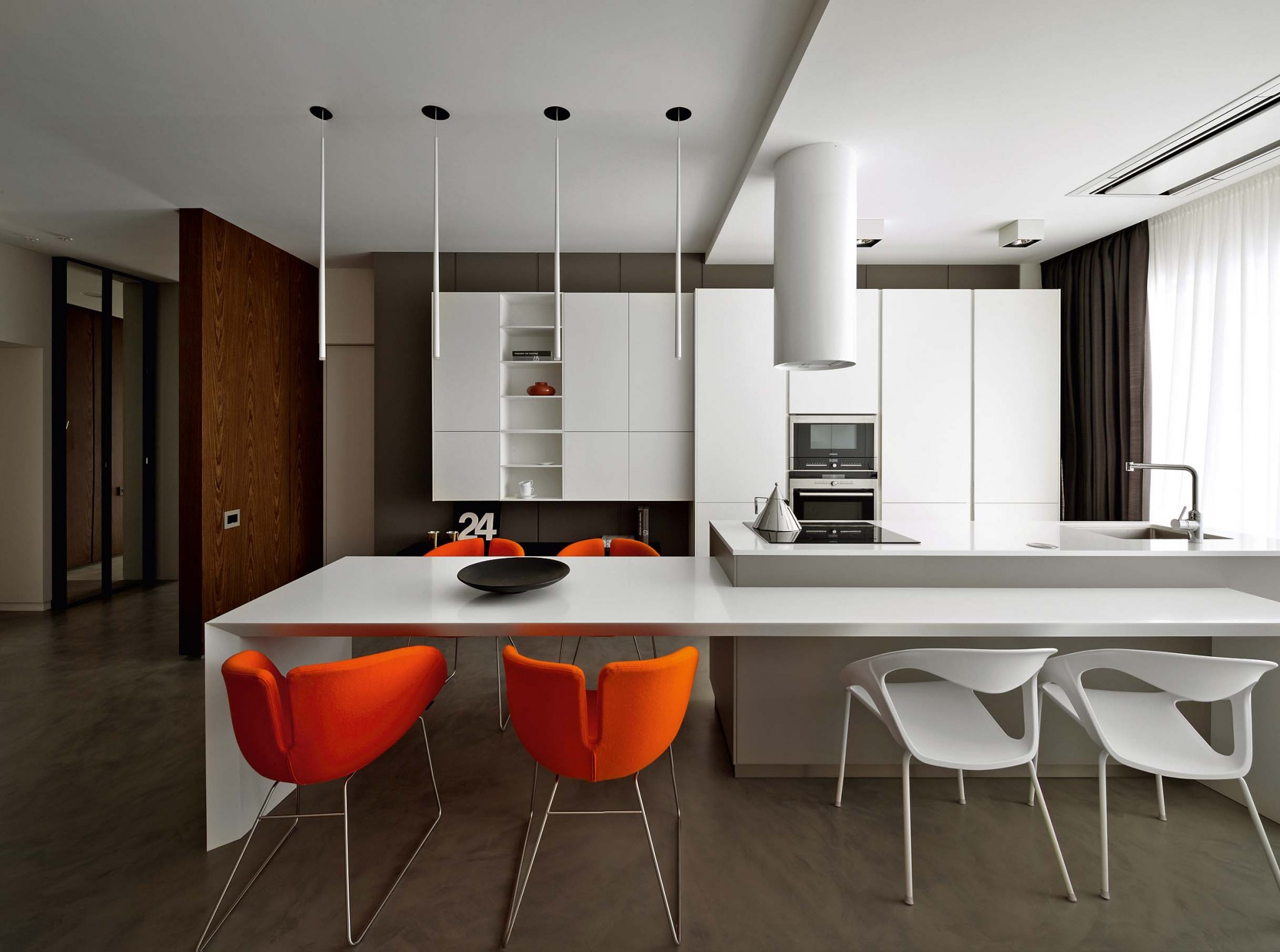 Архитектор АННА ПАХОМОВА: Для реализации этого интерьера мы применили как натуральные, так и промышленные, но экологически чистые материалы. Современные технологии позволяют реализовать самые смелые идеи даже в стиле минимализм. Из соображений практичности пол отделали микроцементом. Стены оформлены матовыми панелями светлого и тёмного оттенка. Монохромную гамму дополнил единственный яркий, акцентный цвет—оранжевый».