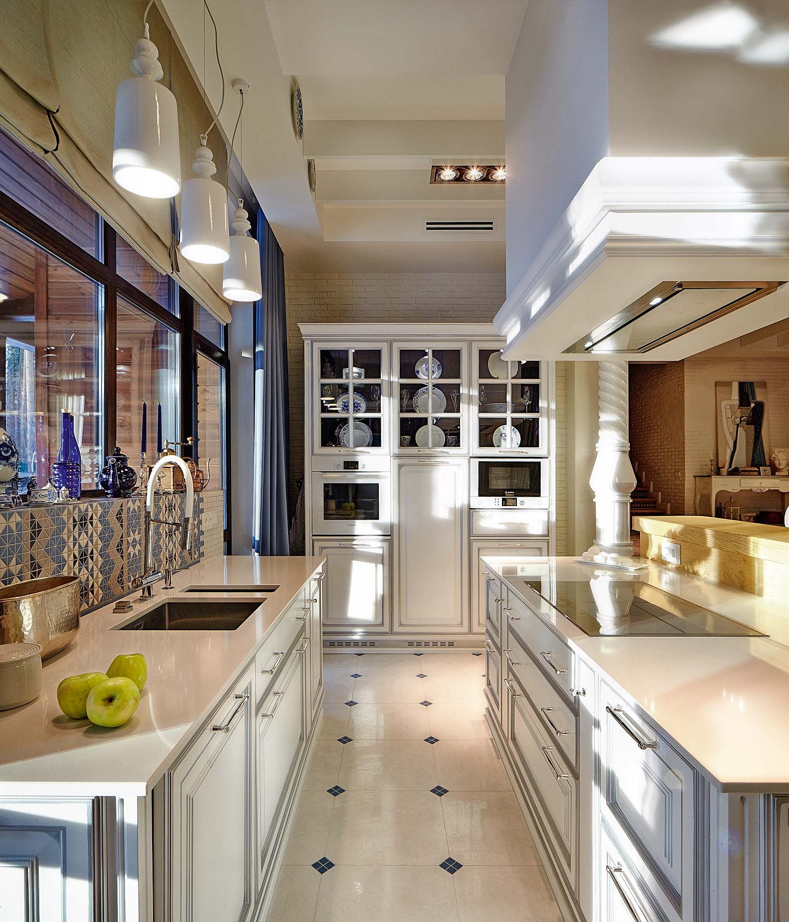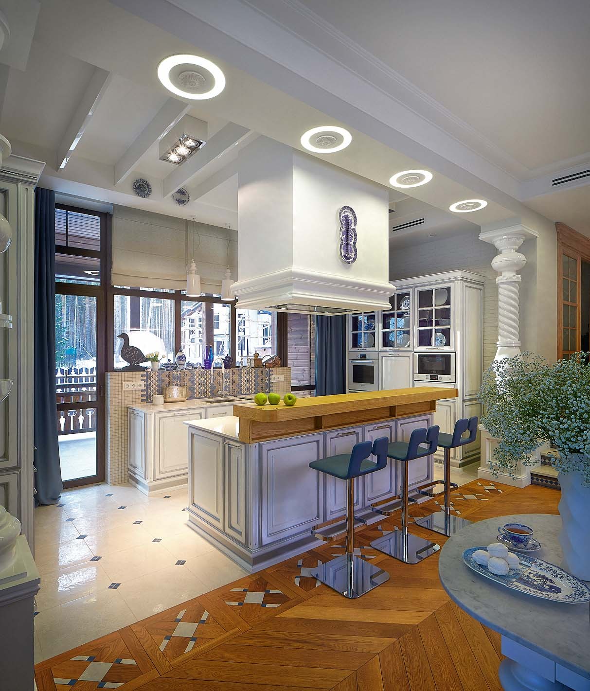 Автор проекта архитектор ОЛЬГА АРАПОВА: В этом загородном доме я представила свою версию традиционного классического интерьера, переосмысленного на современный манер и опирающегося на образы русского искусства и деревянного зодчества. На кухне самостоятельным декоративным мотивом стала цветовая гамма, построенная на сочетании голубого и белого оттенков, что немного напоминает русскую гжель».