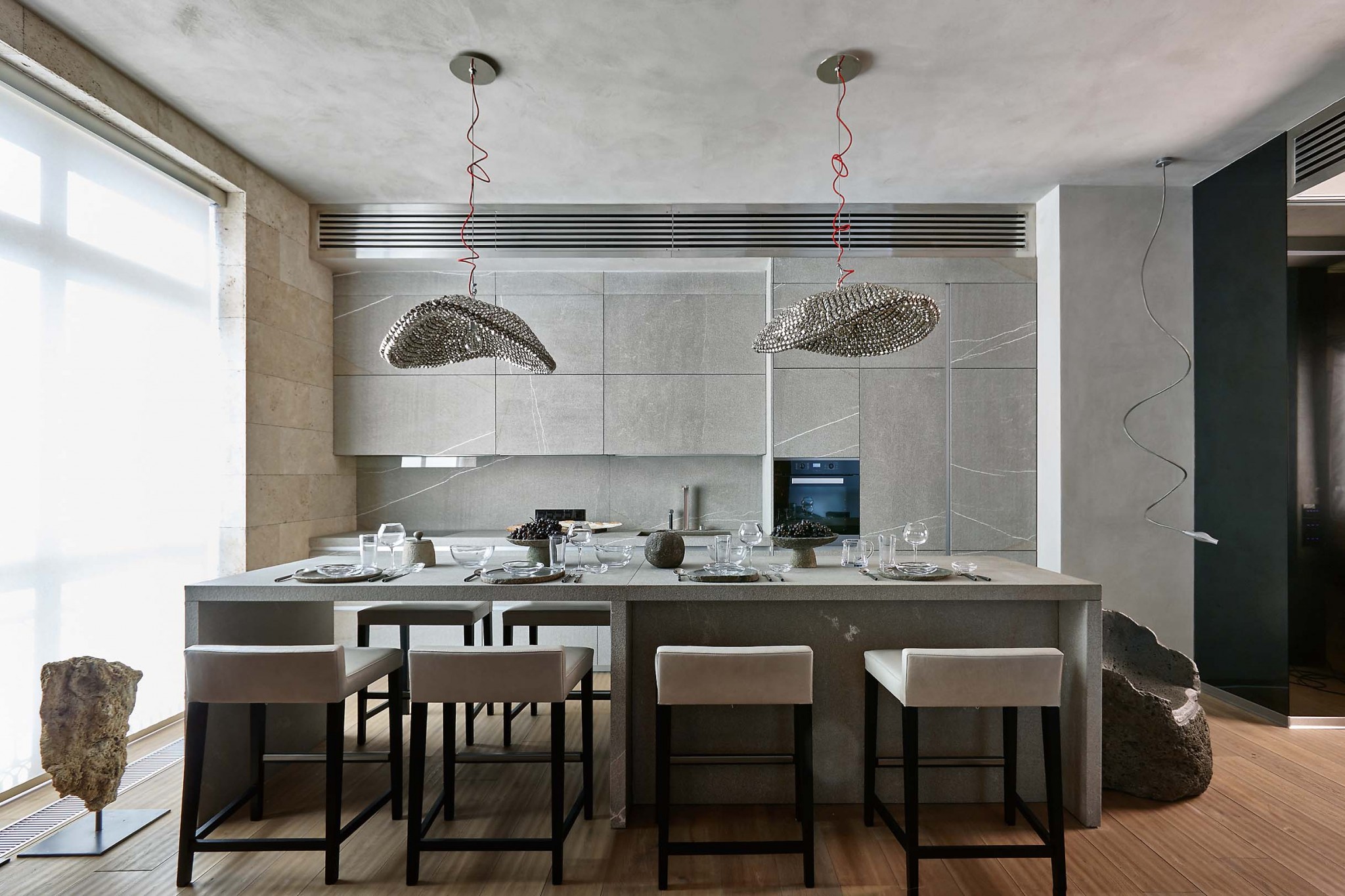 Автор проекта архитектор НИНА ЗАЙЦЕВА: Модная брутальная эстетика этого интерьера сочетается с предельной функциональностью пространства, которое проектировалось «на вырост», чтобы подстроиться сначала под нужды молодого человека, а потом и его семьи. Кухня объединена с гостиной. Для отделки кухонных фасадов использован натуральный камень. А от столовой как таковой мы отказались, в роли обеденного стола выступает кухонный остров».
