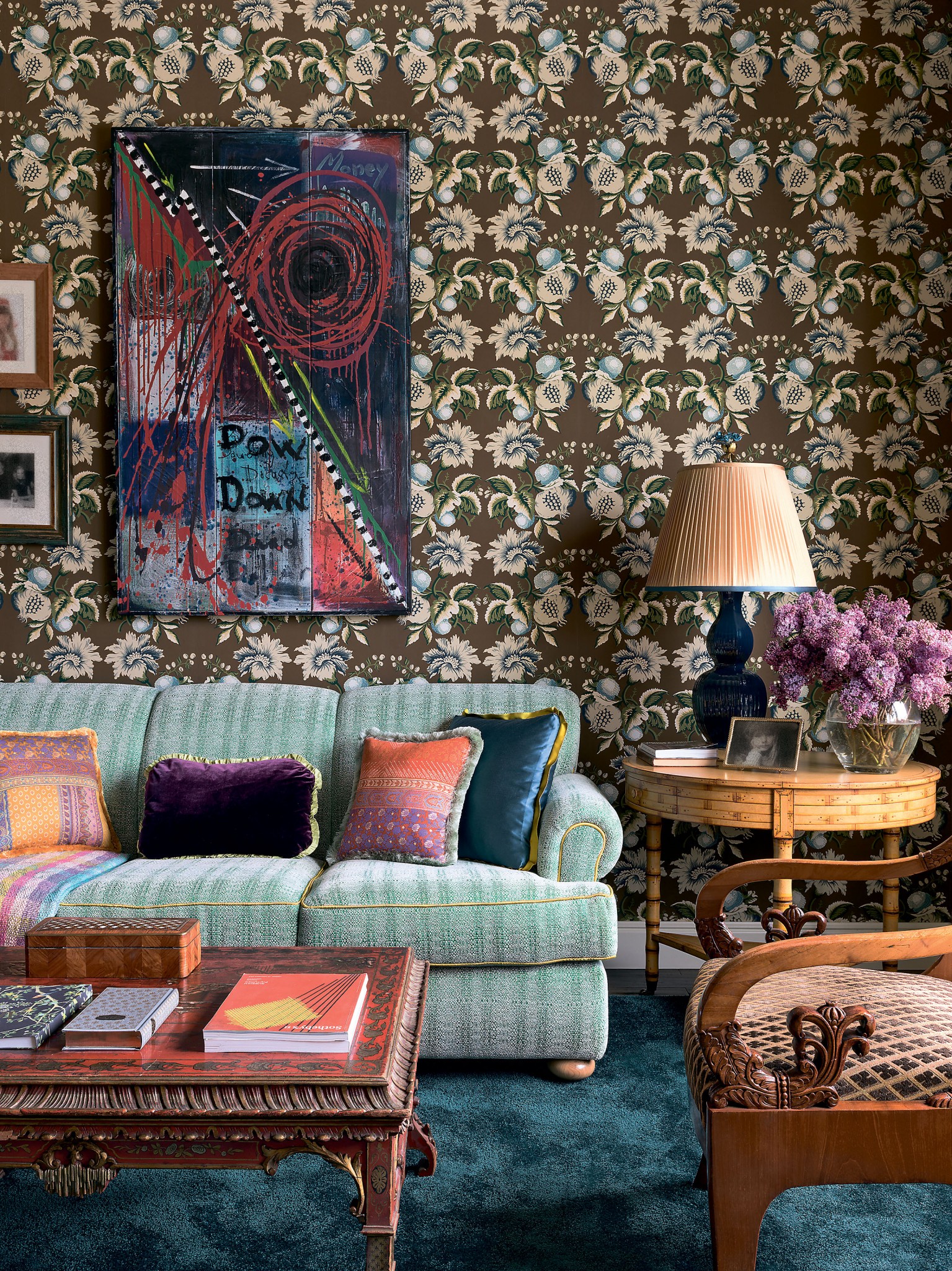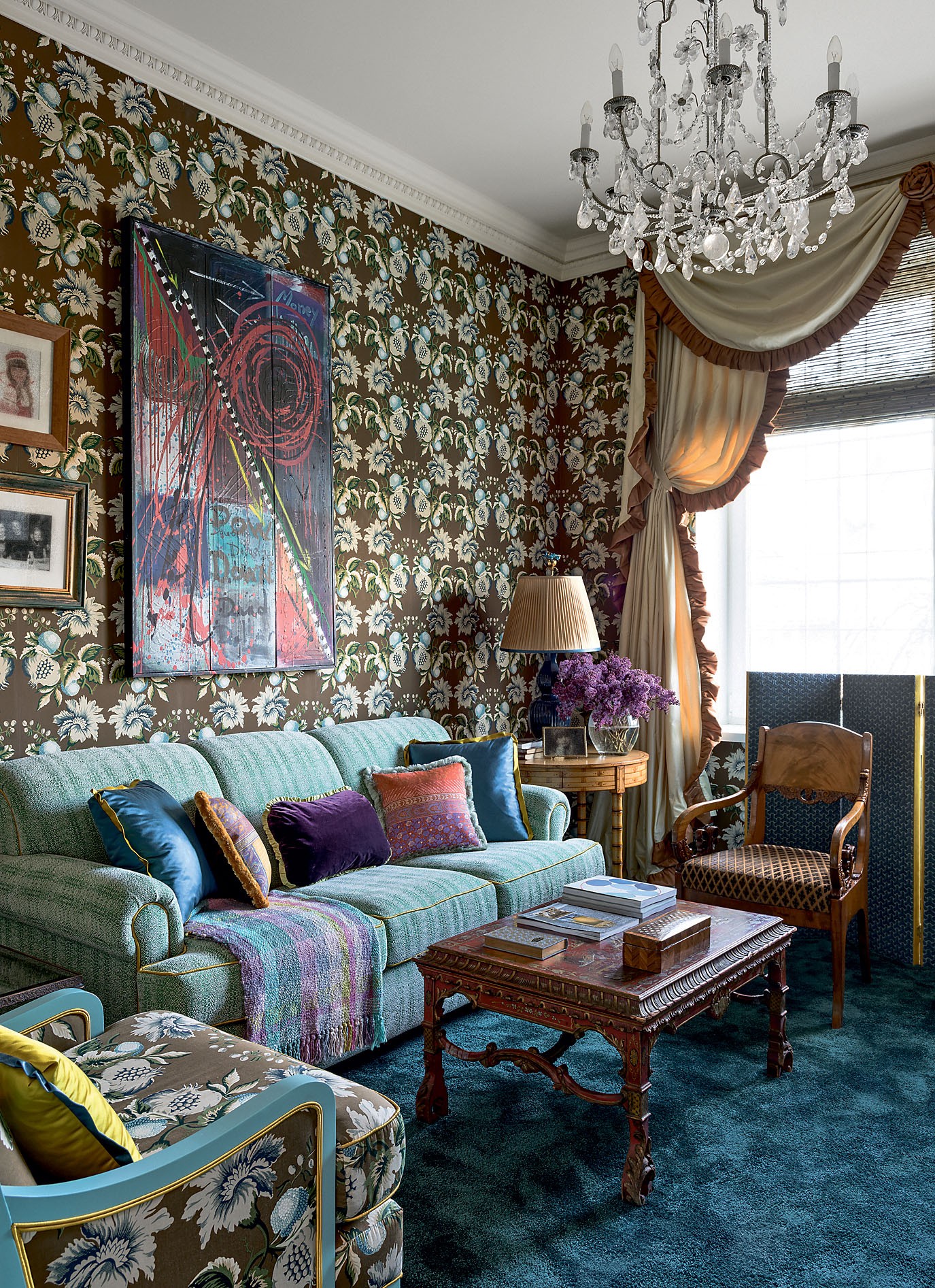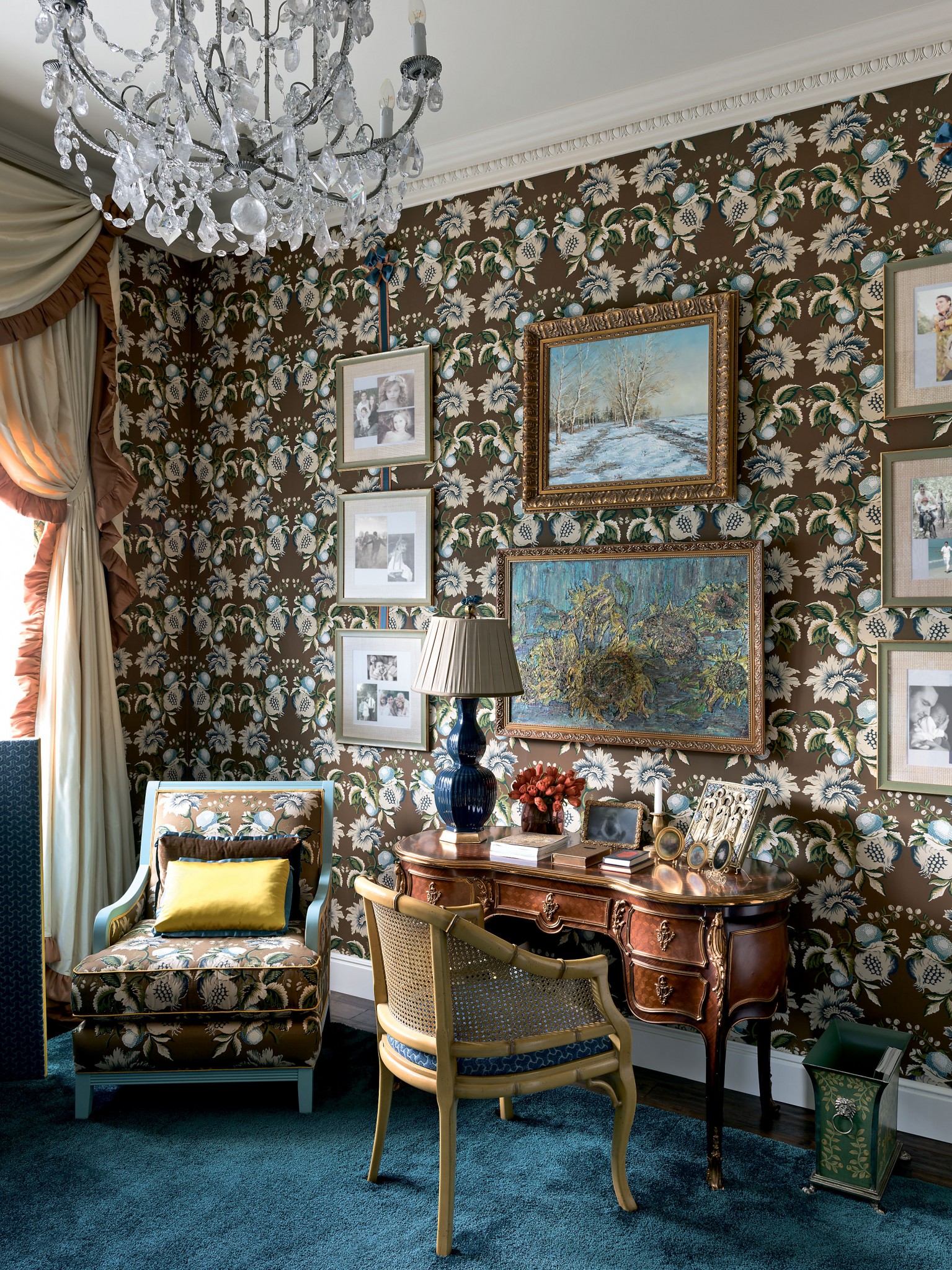 — Это гостиная-кабинет хозяйки дома, её комната, не парадная гостиная. Она очень женская и достаточно небольшая. Всё началось с обоев по дизайну Оскара де ла Ренты — они стали отправной точкой. С одной стороны, они выступают как сдержанный, почти строгий шоколадный фон, но цветочный принт добавляет им игривости.