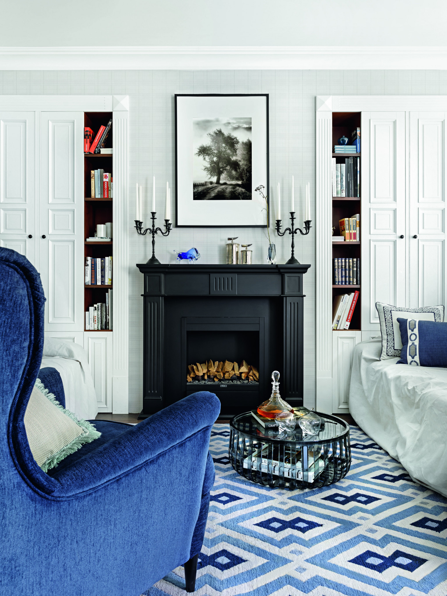 Одно из самых удачных решений — то, как удалось скрыть несущие колонны, которые мешали организовать гармоничное пространство. Так, в гостиной колонна скрыта за фальш–дверцами библиотеки справа. Кроме того, хозяева хотели, чтобы в гостиной был камин и два дивана, расположенные друг напротив друга,—для вечерних бесед, и такую уютную зону у камина сделали. Шторы в гостиной стали отправной точкой