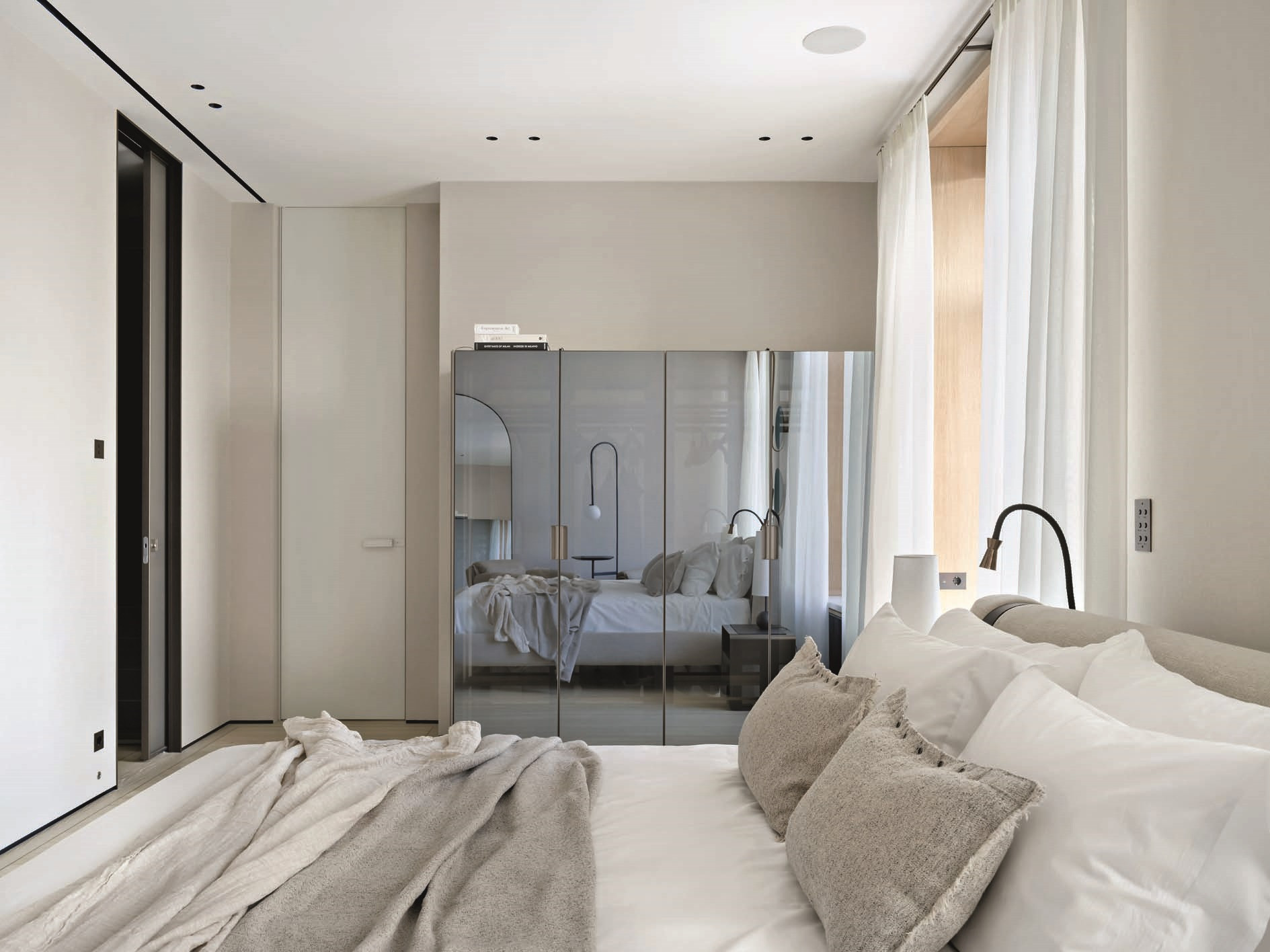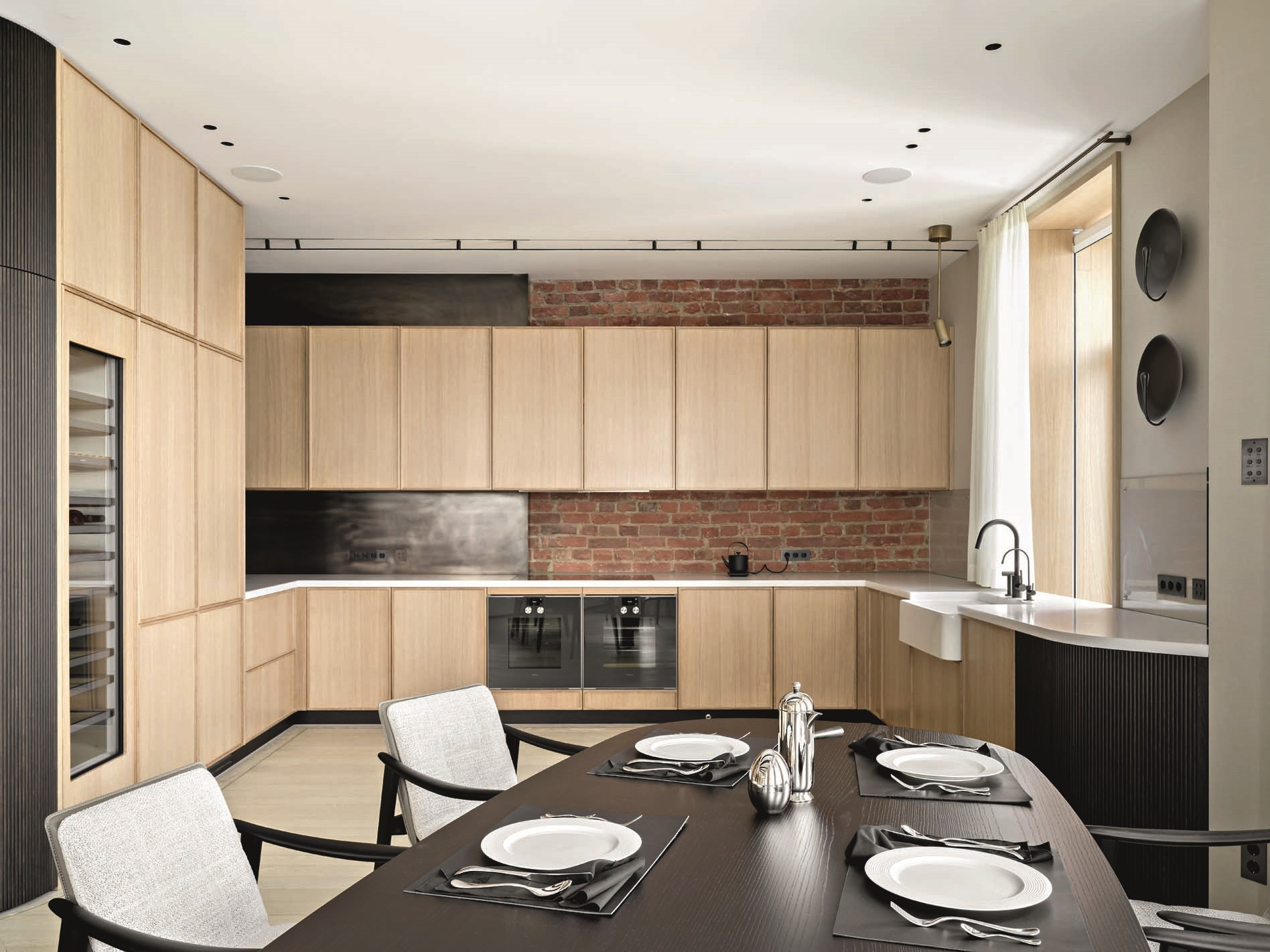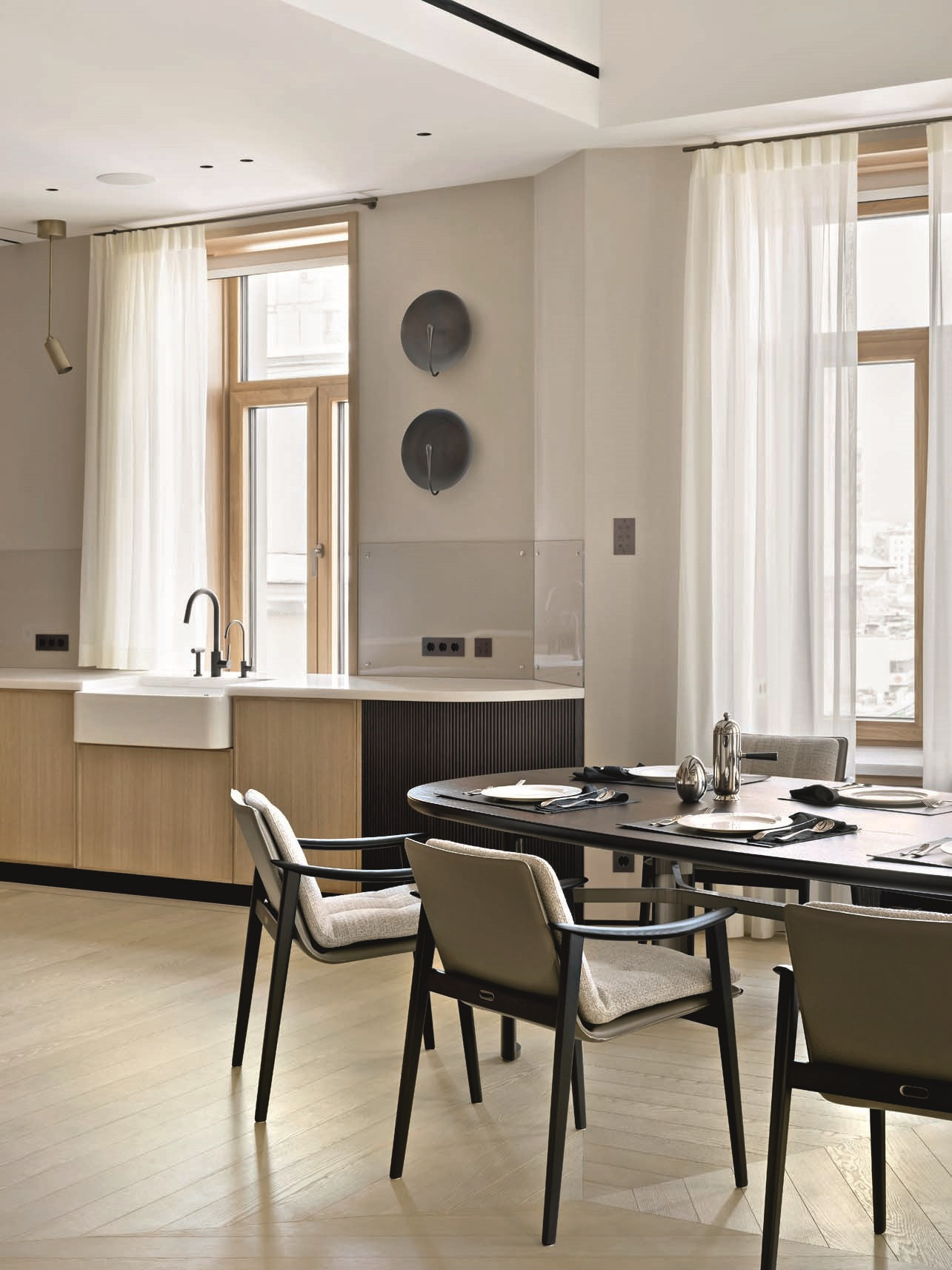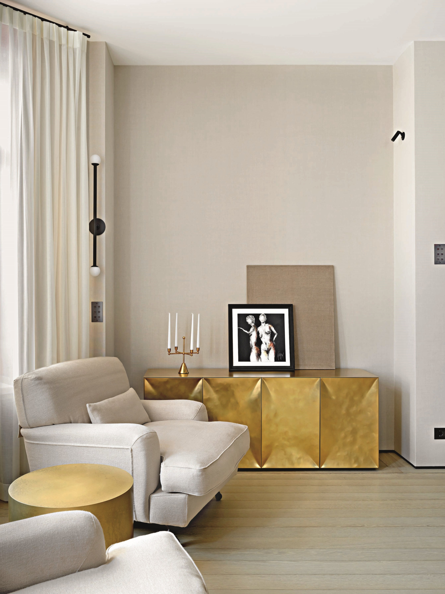 В противовес темным и тяжелым по ощущению объектам из латуни (и в поддержку светлому полу) подоконники и столешницы — из массива белого мрамора кристаллической структуры. Тему природных, натуральных материалов развивает и текстильное оформление в светлых тонах — в частности, льняные обои. Со вкусом выбраны предметы мебели: не просто «высокие» бренды, а вещи дизайнерские, от фабрик со своей глубокой философией, таких как Baxter, Studio Piet Boon, Atelier001, Flou или, допустим, De Castelli — ее авторы, кажется, умеют увидеть «душу металла». Здесь они — в поддержку главных архитектурных акцентов. Общее ощущение от интерьера — тишина, покой, умиротворение.