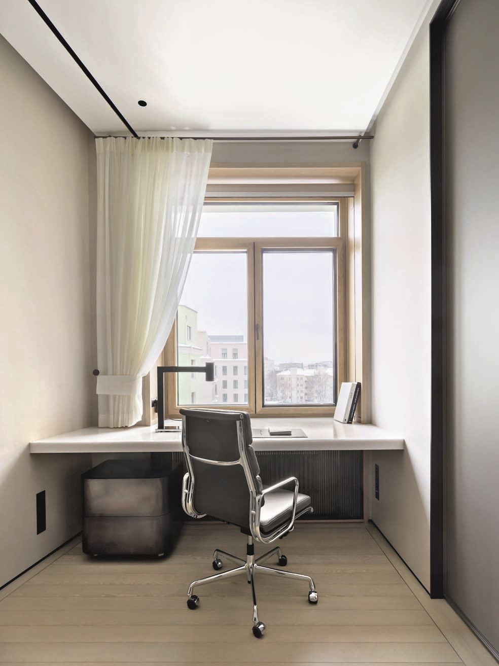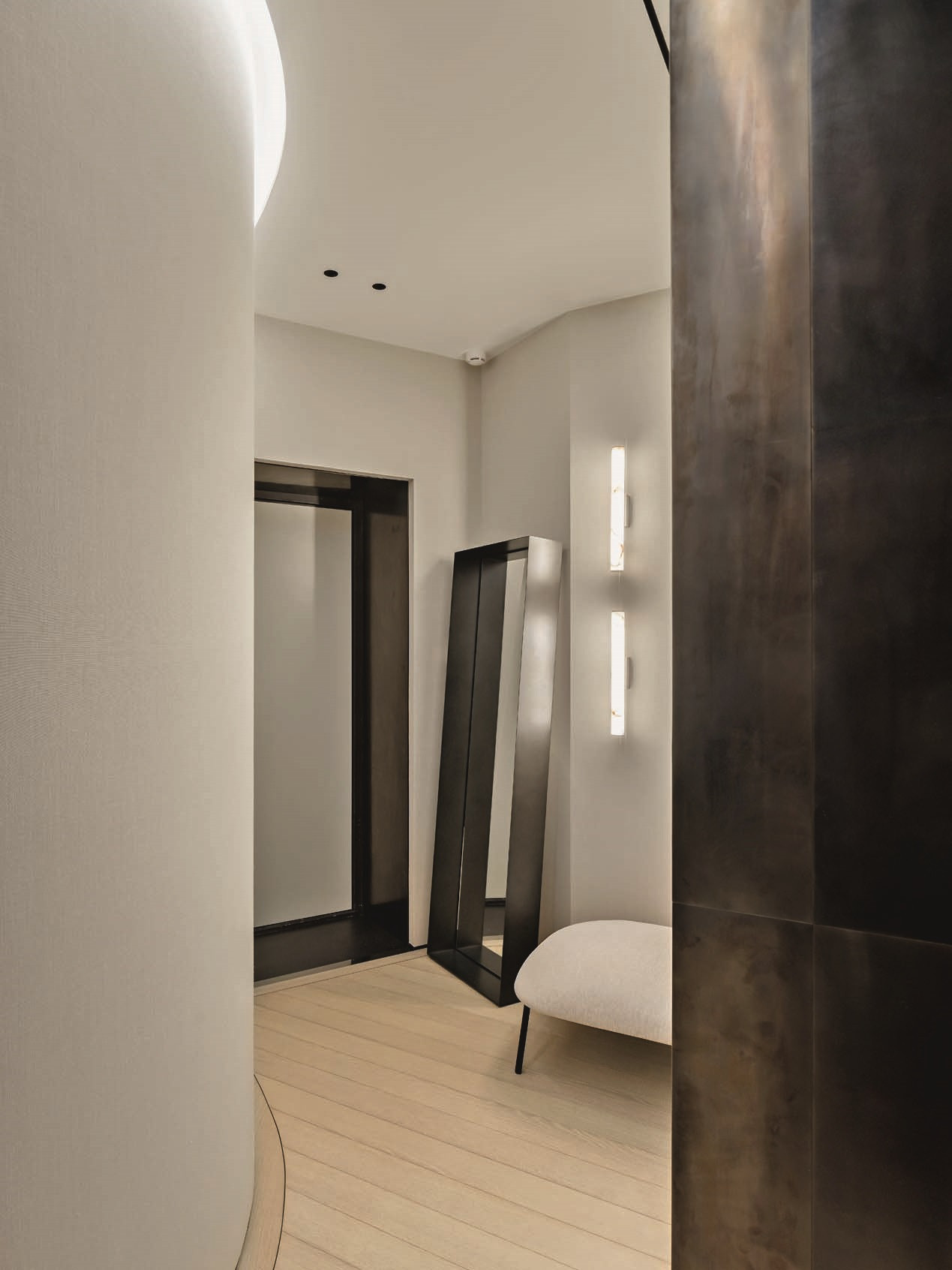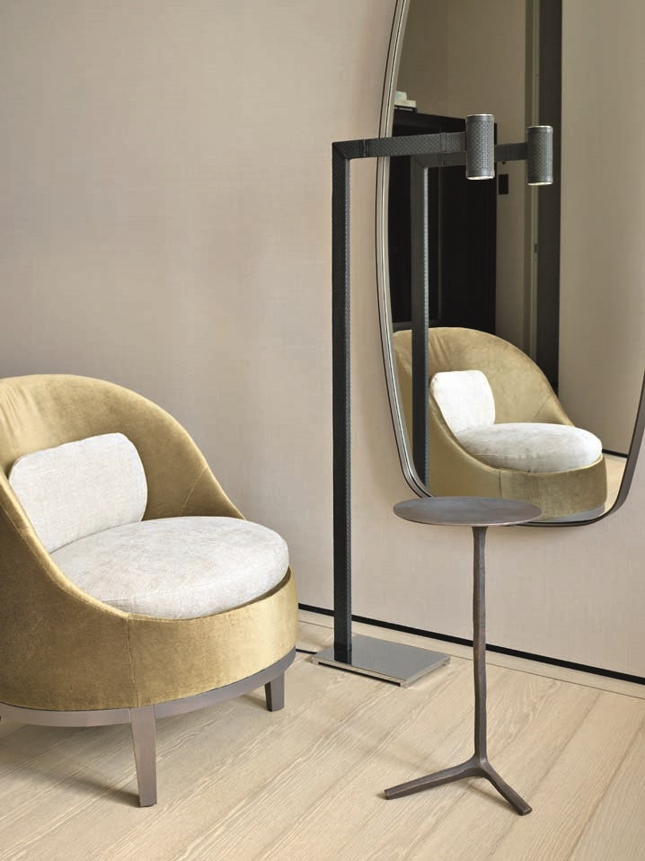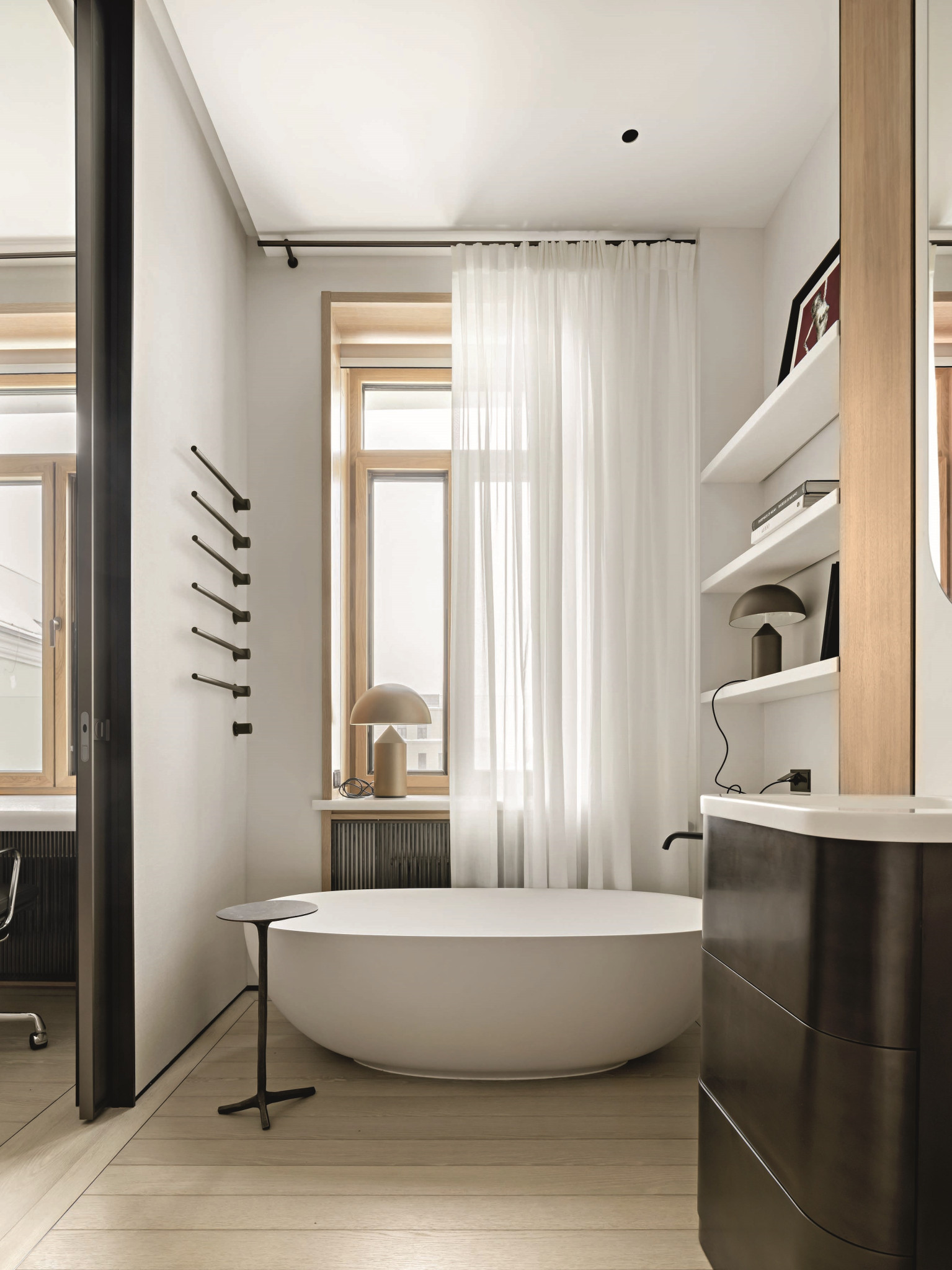 В противовес темным и тяжелым по ощущению объектам из латуни (и в поддержку светлому полу) подоконники и столешницы — из массива белого мрамора кристаллической структуры. Тему природных, натуральных материалов развивает и текстильное оформление в светлых тонах — в частности, льняные обои. Со вкусом выбраны предметы мебели: не просто «высокие» бренды, а вещи дизайнерские, от фабрик со своей глубокой философией, таких как Baxter, Studio Piet Boon, Atelier001, Flou или, допустим, De Castelli — ее авторы, кажется, умеют увидеть «душу металла». Здесь они — в поддержку главных архитектурных акцентов. Общее ощущение от интерьера — тишина, покой, умиротворение.