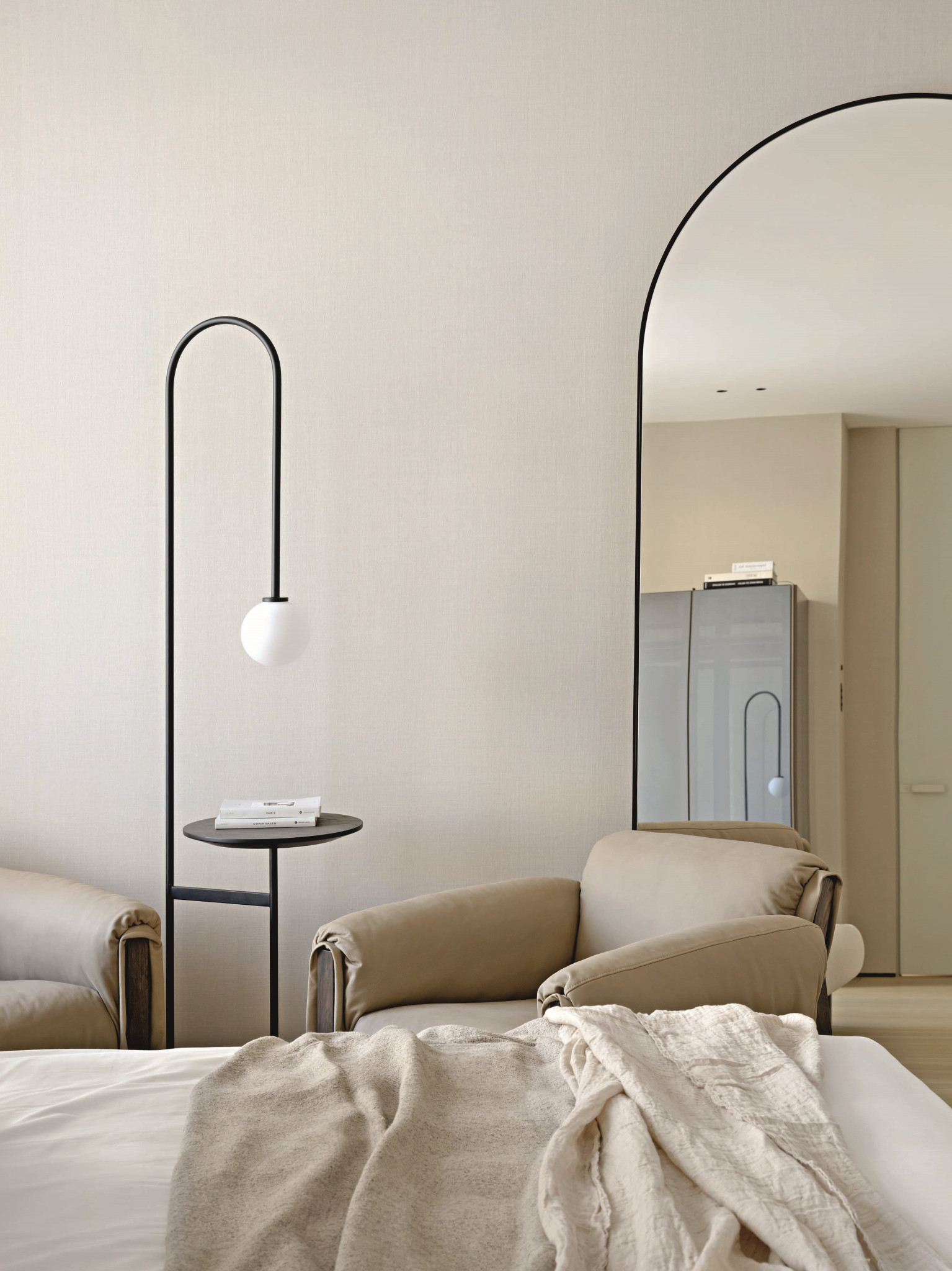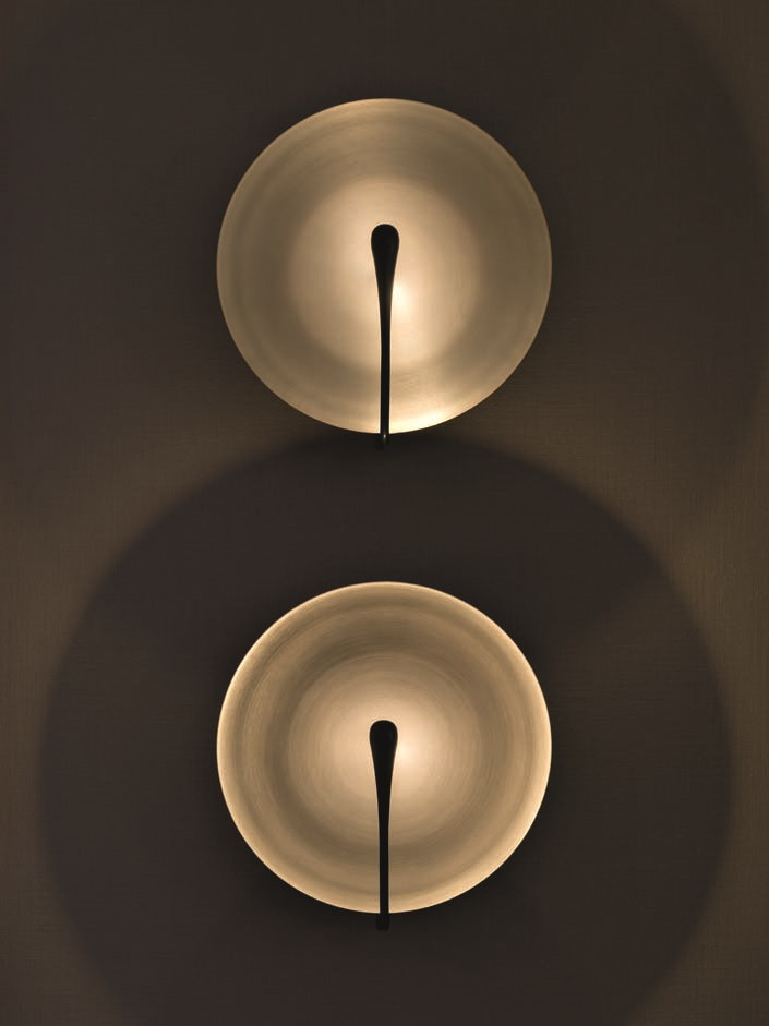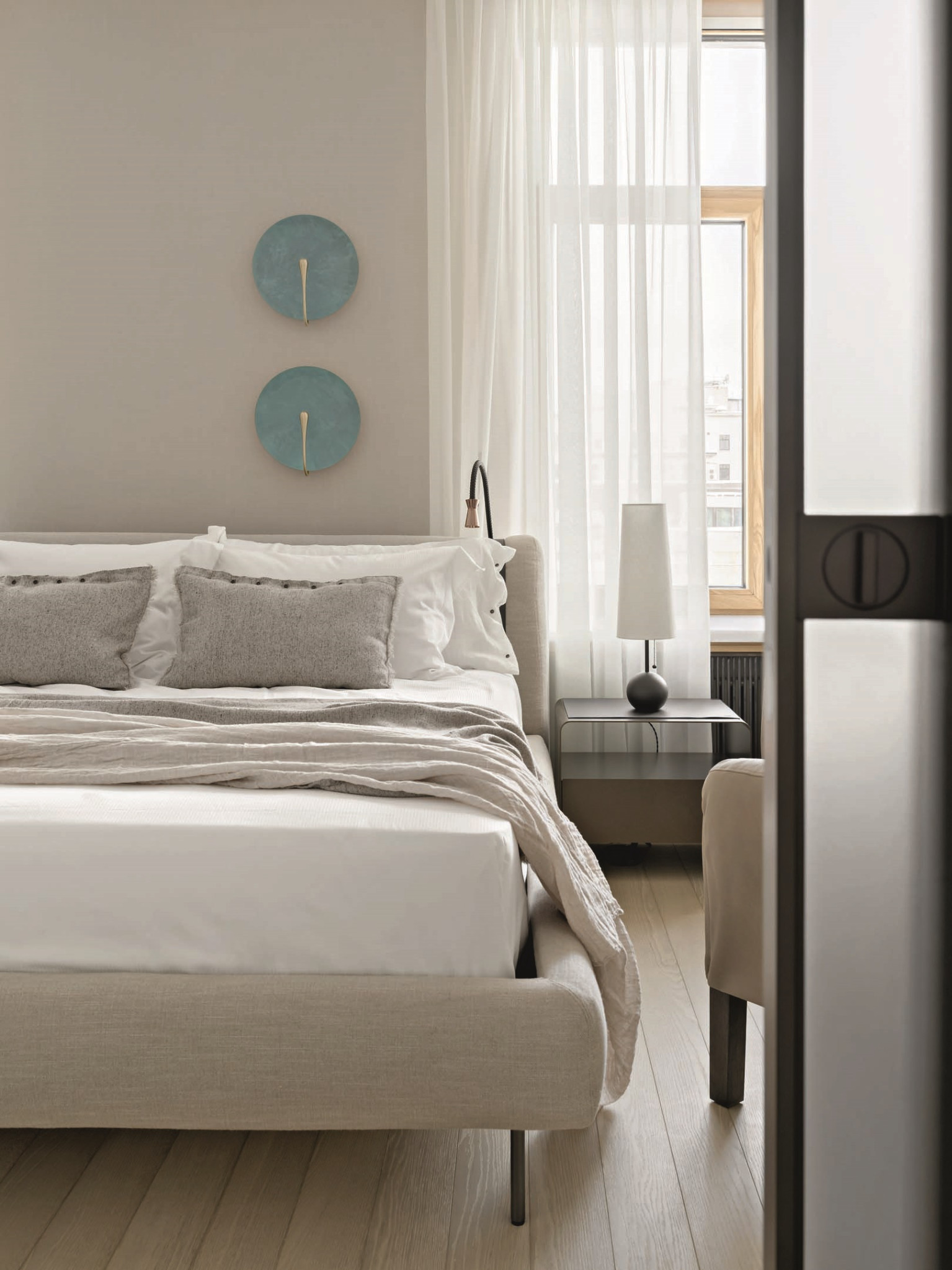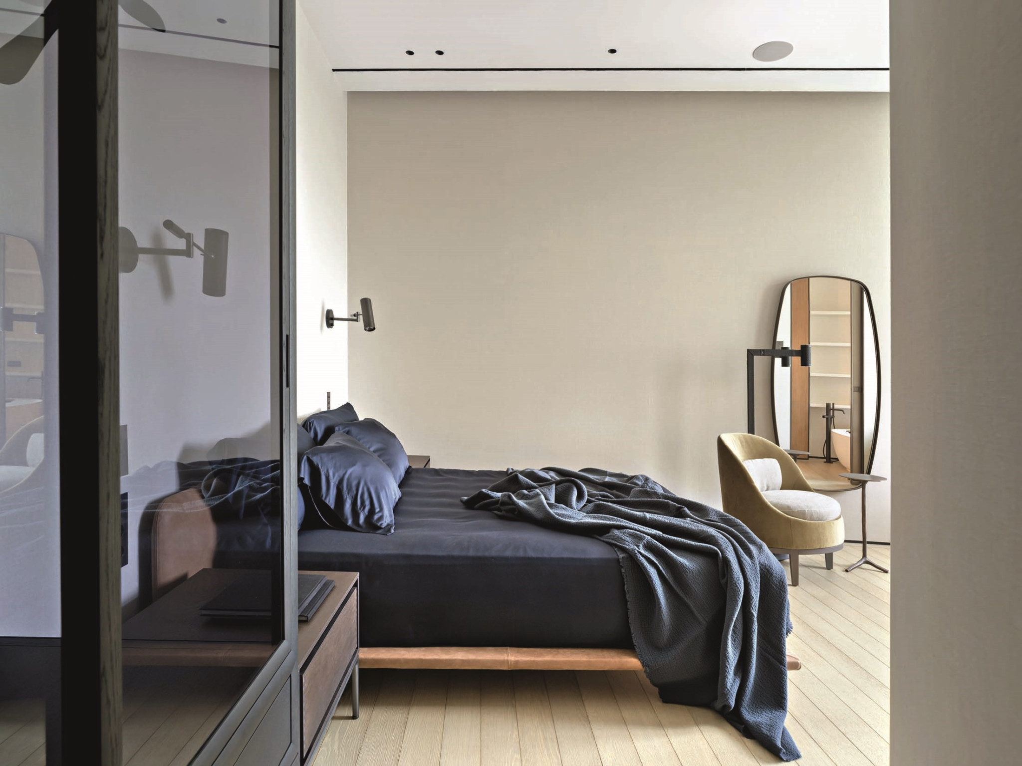 В противовес темным и тяжелым по ощущению объектам из латуни (и в поддержку светлому полу) подоконники и столешницы — из массива белого мрамора кристаллической структуры. Тему природных, натуральных материалов развивает и текстильное оформление в светлых тонах — в частности, льняные обои. Со вкусом выбраны предметы мебели: не просто «высокие» бренды, а вещи дизайнерские, от фабрик со своей глубокой философией, таких как Baxter, Studio Piet Boon, Atelier001, Flou или, допустим, De Castelli — ее авторы, кажется, умеют увидеть «душу металла». Здесь они — в поддержку главных архитектурных акцентов. Общее ощущение от интерьера — тишина, покой, умиротворение.