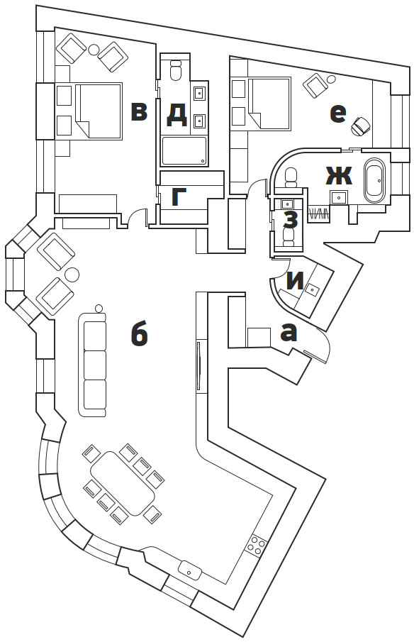 а) холл, б) гостиная-кухня столовая, в) спальня хозяев, г) гардеробная, д) ванная комната, е) гостевая комната, ж) санузел при гостевой комнате, з) гостевой санузел, и) постирочная.