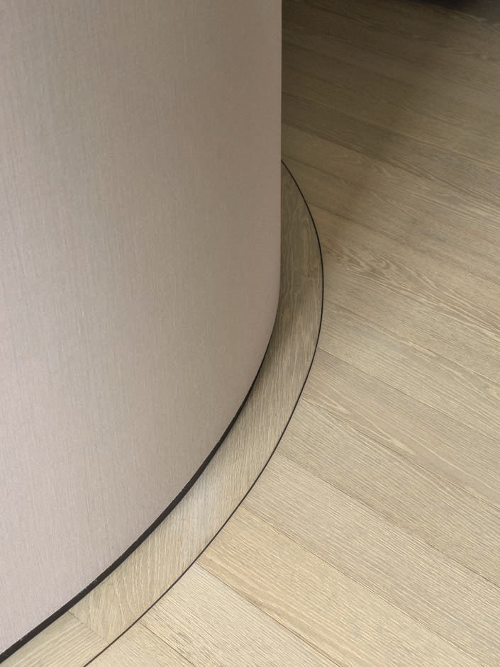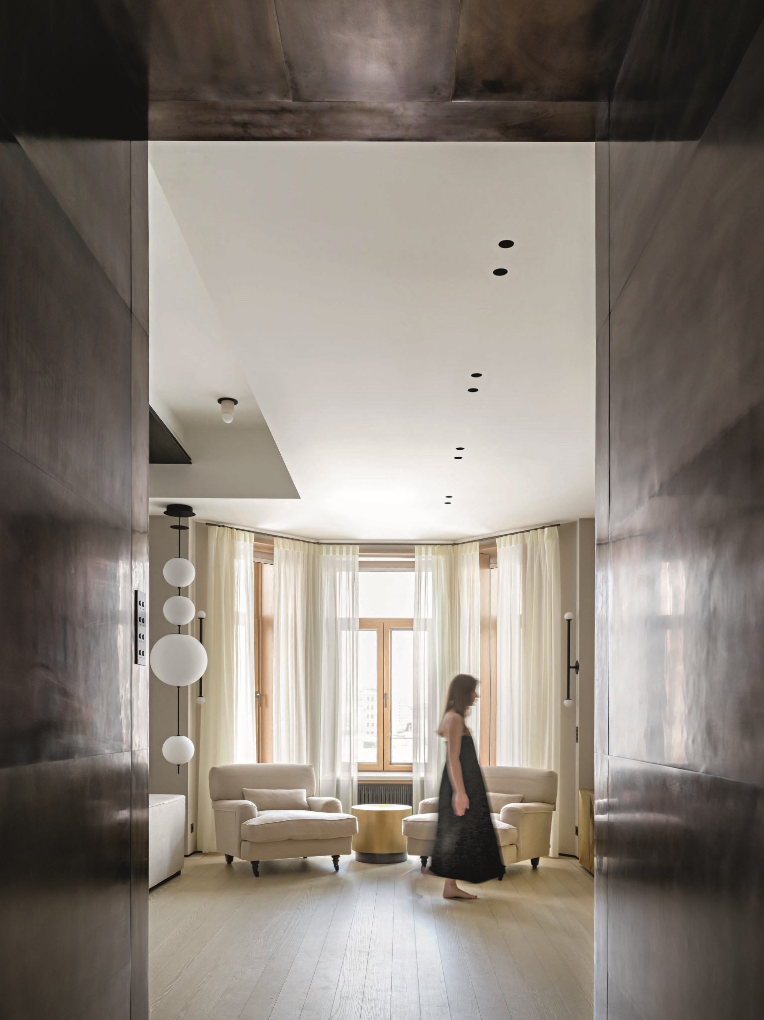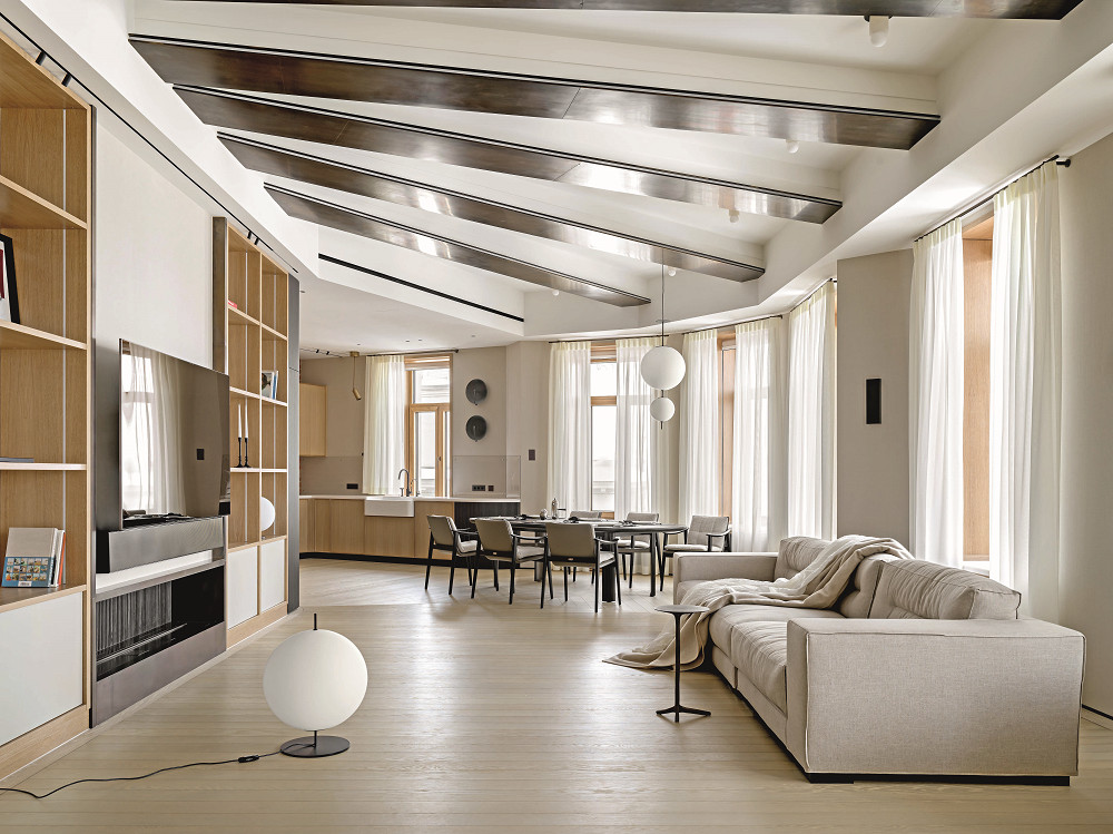 В основе стилистики — сдержанная среднеевропейская классика. Характера пространству прибавляют выразительные архитектурные детали — тяжелые латунные балки, которые появились здесь вместо старых деревянных. Это главный акцент интерьера. В качестве смыслового, архитектурного и стилистического рефрена выступают массивные латунные порталы парадной зоны, камина и вставки паркета из этого же материала. Металл намеренно не покрывали лаком: у оксидированной латуни «живой», постепенно меняющийся оттенок. Под стать масштабу, заданному балками и порталами, — пятиметровая паркетная доска Schotten & Hansen, напоминающая о палубе корабля. «Незабываемое событие — подъем и доставка через окна пятиметрового паркета альпинистами, — улыбается Анастасия. — В тот день с нами познакомились все соседи».