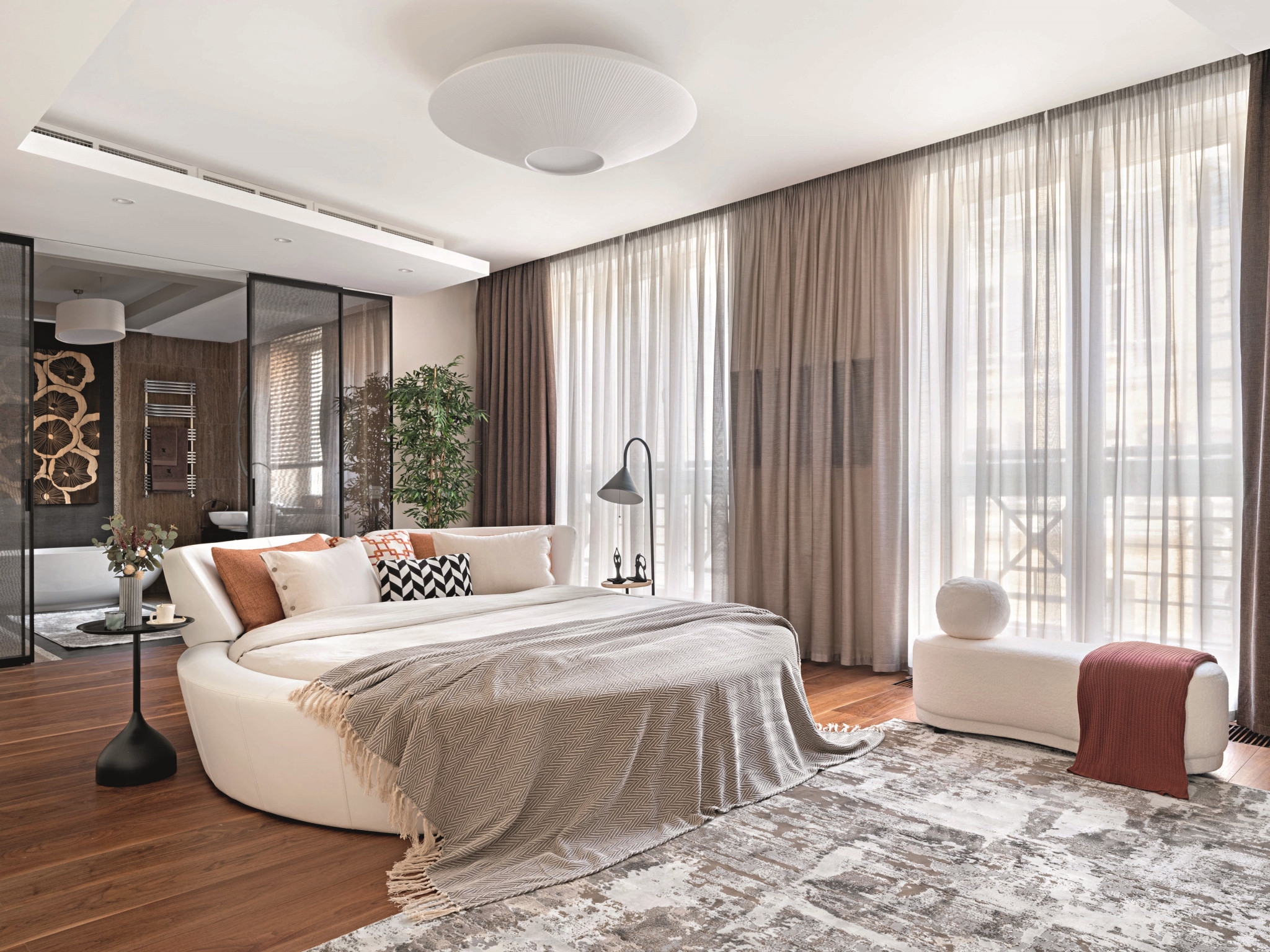 Эксперименты с зонированием продолжаются и в приватном блоке. В самом центре спальни — эффектная круглая кровать от Ivano Redaelli. Она визуально разделяет пространство и задает ритм другим элементам мебели — мотив круга повторяется и в форме светильников, и в авангардном рисунке комода. «Создавая интерьеры, я стараюсь опираться не на тренды, а на характер и пожелания заказчиков, их личные истории. В этом проекте мне удалось воплотить идею смешения стилей, но спокойного и гармоничного. Так хозяева квартиры смогут легко добавлять в интерьер детали, наполнять свой дом новыми смыслами, при этом общая концепция не нарушится», — заключает Алексия.