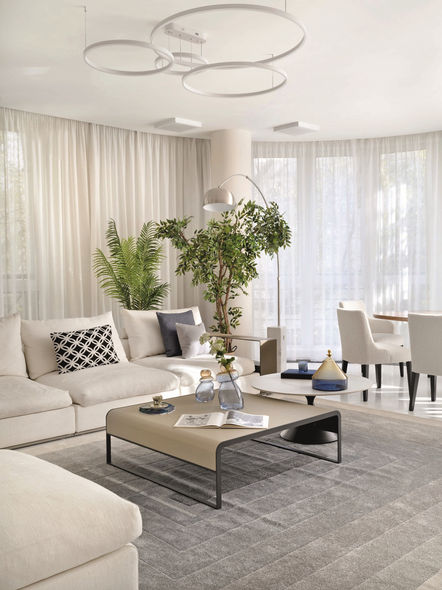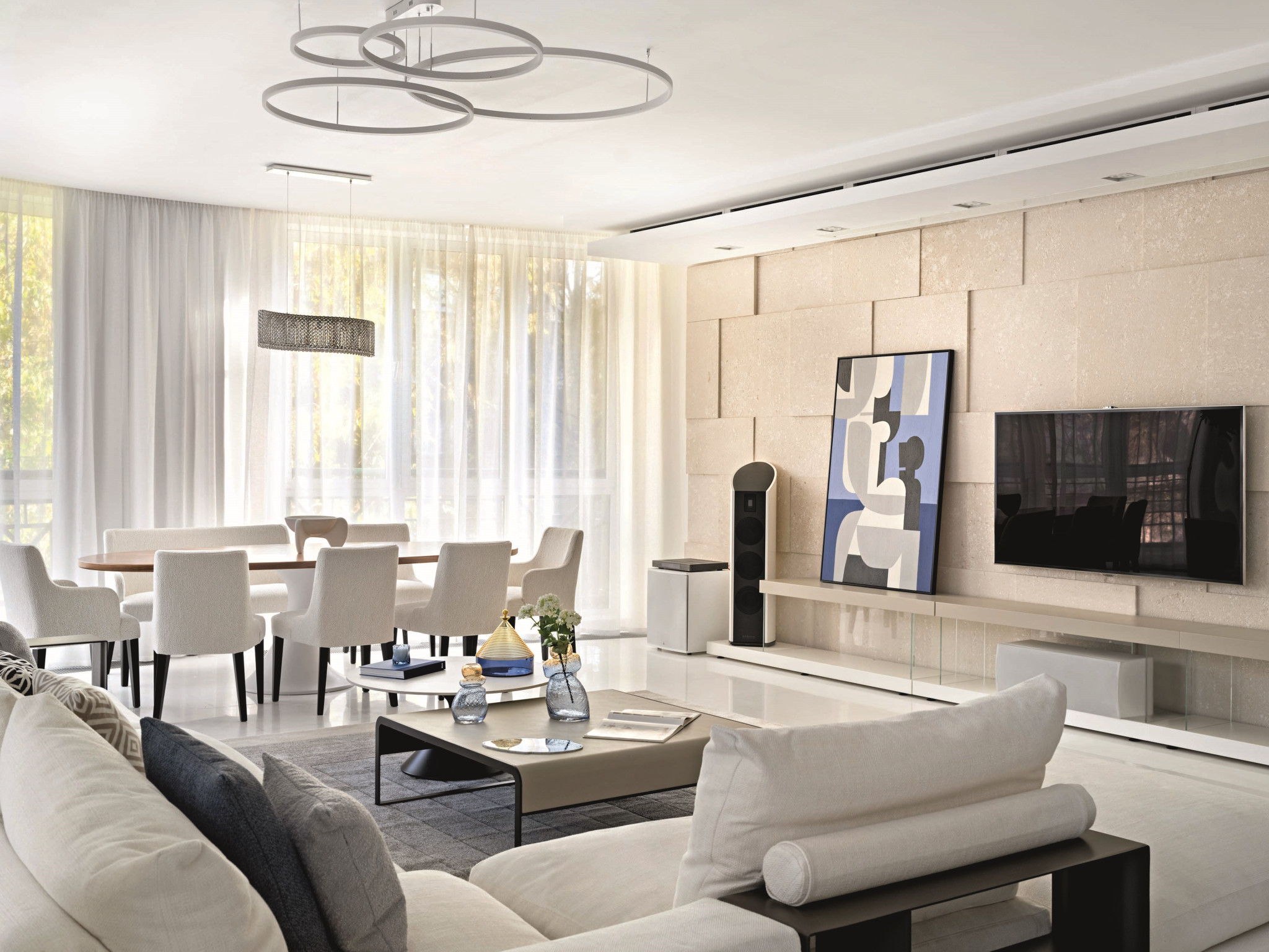 Гостиная — сердце всей квартиры. Благодаря панорамным окнам по всему периметру здесь много естественного света, а нежная молочно-белая гамма поддерживает эффект легкости и воздушности. Пространство удачно зонирует сама форма помещения — в центре скругленного эркера разместили обеденную зону с овальным столом, где хозяева могут собираться вместе с семьей и гостями. С другой стороны — небольшой остров отделяет зону кухни. Ритм всей общей зоне задает акцентная ТВ-стена из травертина с геометричным рисунком.