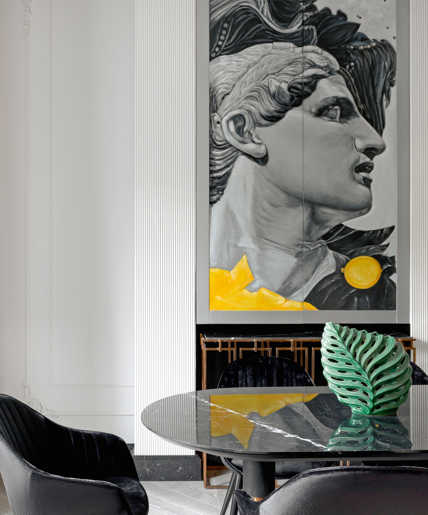 Работа над проектом началась с исправления ошибок, допущенных предшественниками Натальи Баркаловой. Самым серьёзным недостатком была неправильная, несуразная эргономика пространства. Дизайнер предложила заказчику своё видение, и начался новый этап преображения квартиры. Основное внимание сосредоточили на планировке. Дизайнер организовала пространство, исходя из того, что тут живёт один человек, и удобно должно быть в первую очередь ему. Помимо просторной гардеробной комнаты запроектировала большое количество скрытых систем хранения, а также выстроила логистику, отталкиваясь от привычного образа жизни заказчика. «Спортсмены очень много времени проводят в отелях, и за основу пространственного решения я взяла отельную историю, — рассказывает Наталья. — Но не эстетическую составляющую, а то, что отель, в моём понимании, это прежде всего уют, комфорт и эргономика. Даже в небольших номерах пространство выстроено очень логично, всё организовано предельно функционально. И в этой квартире я сделала так, чтобы человеку было максимально удобно в его повседневной жизни. Куда он идёт, после того как вошёл в дом, что он обычно делает после этого — логистика учитывает все передвижения хозяина, как ему привычно — всё подстроено под него». Заказчик — молодой человек, профессиональный футболист, и большую часть времени он проводит вне дома. Поэтому квартира выполняет в основном представительские функции. Сюда приятно вернуться после сборов, отдохнуть, провести время с друзьями. Поэтому в оформлении дизайнер сделала акцент на эффектные решения. «Я всегда исхожу из предпочтений конкретного человека, — улыбается Наталья. —Заказчику нравятся классические элементы, и, конечно же, я использовала их в качестве декоративных акцентов». Гипсовая лепнина, панно с головой Давида, светильники в стиле ар–деко задают классическое настроение, но ненавязчиво,
