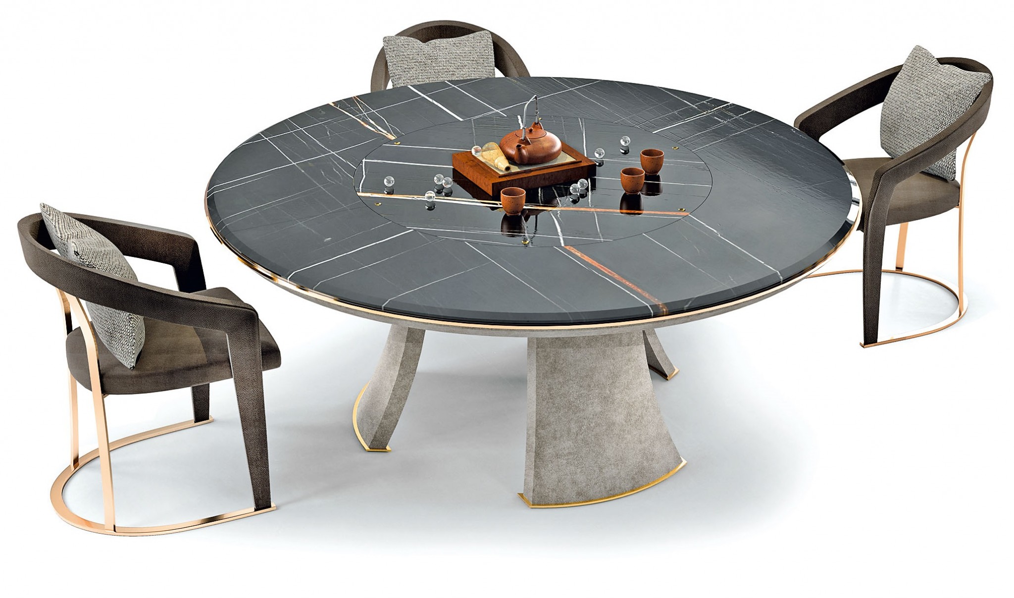 Украшением стола Charisma от Giorgio Collection служат серый мрамор столешницы, ножки, отделанные шпоном Black Bubinga под защитным слоем из глянцевого полиэстера, и детали из хромированной нержавеющей стали. Флагманский салон в Casa Ricсa EXPO.