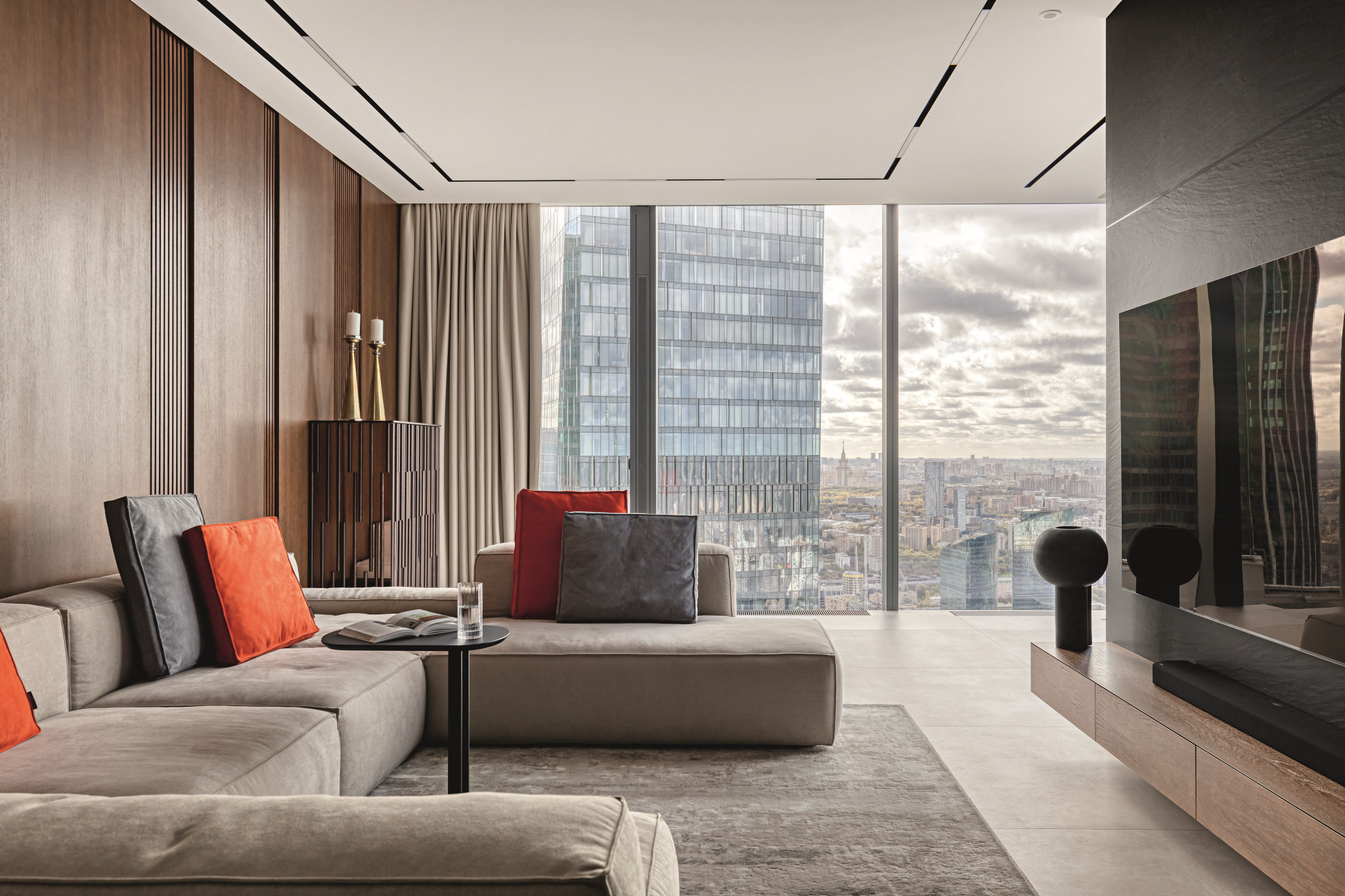 Площадь квартиры с панорамными окнами довольно большая, 215 кв. м. «Мы не хотели «мельчить», — объясняет автор проекта. — Целью было сохранить максимум воздуха, пространства, сделать так, чтобы панорамные окна и городской пейзаж за ними стали неотъемлемой частью интерьера. Заказчики выбрали это место, потому что хотели жить в ритме большого города. Соответственно, стилистику интерьера так же выбирали ритмичную, лаконичную, не перенасыщенную деталями. Это история «мегаполиса внутри мегаполиса». Примерно по центру квартиры находится общая зона кухни-гостиной, в нее словно перетекает пространство прихожей. Слева от парадной зоны — блок «взрослых» помещений, справа — детских. Каждый — со своими гардеробной и ванной комнатой, а в детской зоне, спроектированной для девочки-подростка, есть еще и кабинет. Когда к хозяевам приезжает их старшая дочь, он выполняет функции гостевой комнаты. Что касается стиля и атмосферы квартиры, Алена Тоцкая вспоминает, что у заказчиков был такой запрос: «стильный дорогой интерьер, но без китча».