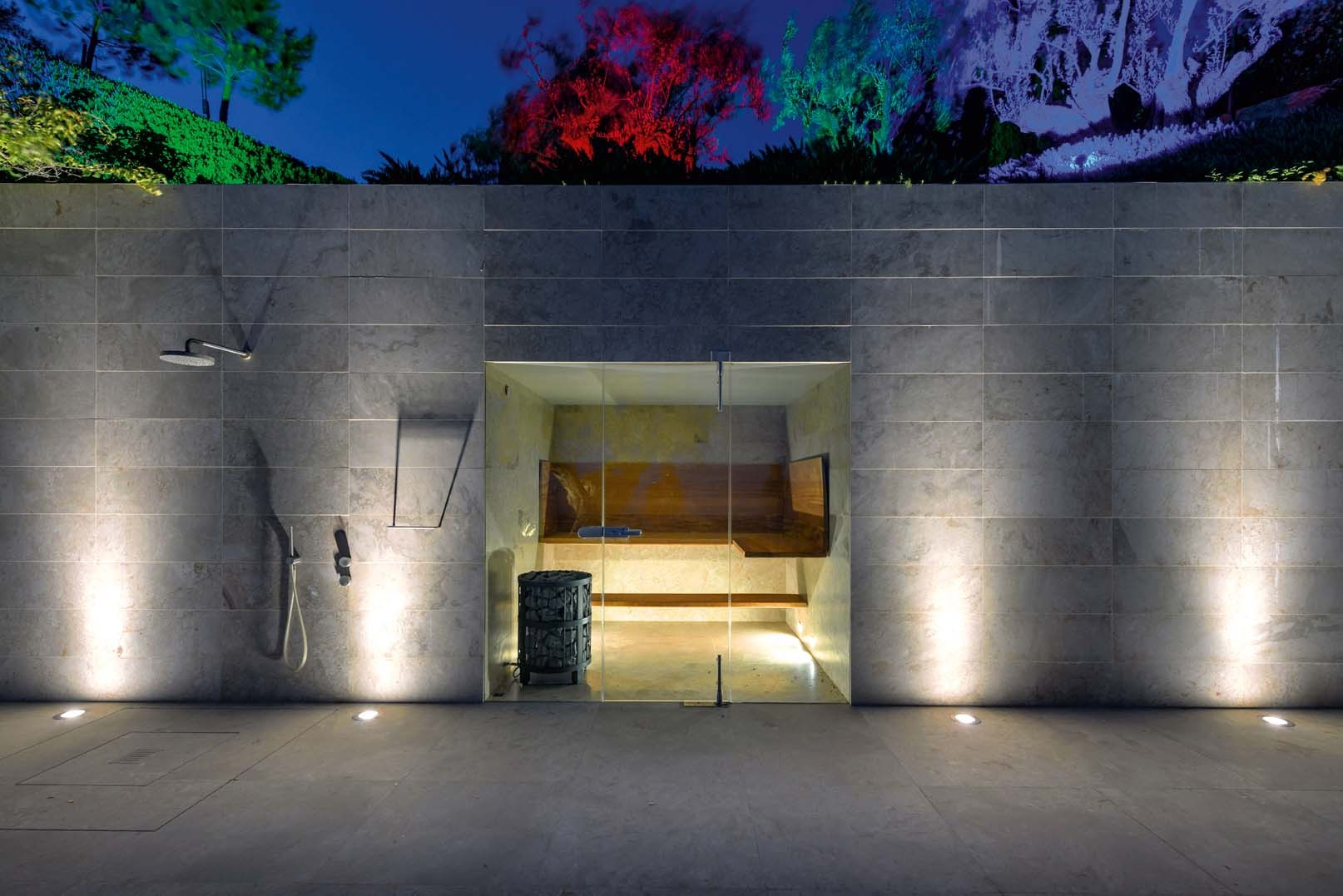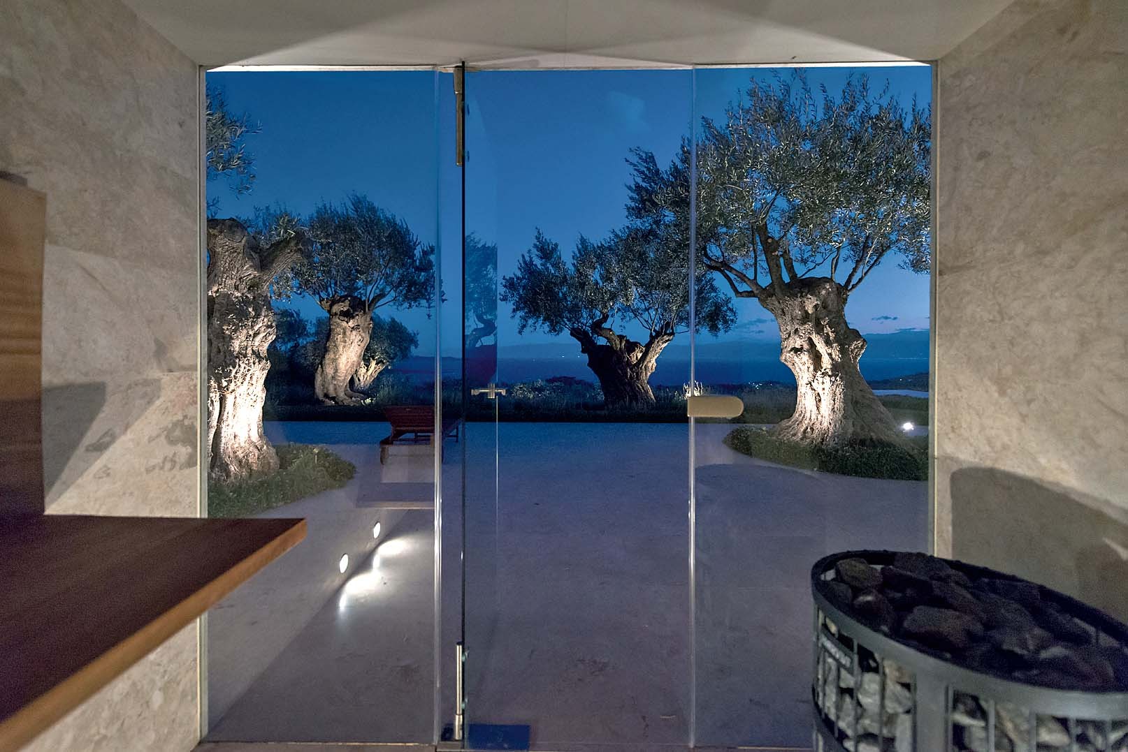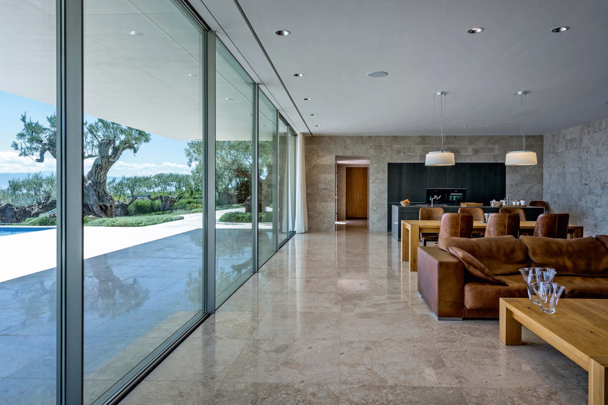 Месторасположение этой летней резиденции в одном из самых живописных мест Греции определило как планировку, так и характер интерьера — минимализм в сочетании с функциональностью и натуральными материалами. Ранее заказчики проживали в деревянном загородном доме, поэтому в этот раз архитектор Сергей Федотов, заручившись их согласием, разработал проект в современном ключе: основным материалом послужили стекло и бетон. Второй этаж вынесен над первым на четыре метра, что позволило создать большое затенённое пространство между домом и бассейном, а также предотвратить попадание прямых солнечных лучей в гостиную. «С холма открывается великолепный вид на море, горы, соседние деревни, — рассказывает автор проекта. — Мы решили застеклить фронтальные стены здания, чтобы максимально сблизить внутреннее пространство дома с окружающим пейзажем, размыть границу между природой и интерьером». Идея единения с природой также подчёркнута в выборе материалов. Заказчики — приверженцы экодизайна, и в интерьере решено было использовать только материалы, встречающиеся в природе: камень, натуральную кожу, дерево.