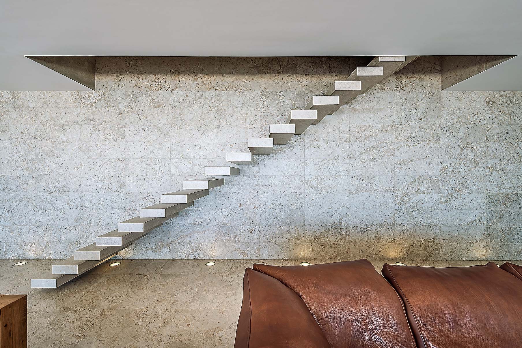 Интерьер изначально задумывался как подчёркнуто нейтральный с уклоном в современность. Автору проекта важно было сделать упор на красоту пейзажа, открывающегося из панорамных окон, и ничто в интерьере не должно было отвлекать на себя внимание — отсюда отсутствие ярких элементов декора. Мягкие фактуры и тёплая цветовая палитра из естественных природных тонов уравновешивают строгую геометричность линий: внешние и внутренние стены дома отделаны светлым мрамором медового оттенка, напоминающего цвет сухой травы, а мрамор в спальнях и ванных комнатах отсылает к оттенку земли, характерному для данной местности.