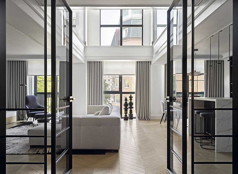 Место действия — клубный комплекс «Рассвет Loft Studio», пространство в лучших традициях лофтовой архитектуры. Клиенты, молодая семья с ребенком, сформулировали свой запрос так: светлый современный интерьер, не перегруженное предметами пространство, в котором много воздуха, обязательно — две спальни, кабинет, объединенная зона кухни, столовой и гостиной, большие гардеробные комнаты, а также «умный дом». «Не каждый объект имеет два этажа, потолки порядка шести метров, не каждый находится в историческом здании, — говорит Ярослав Ряжский, отвечавший за реализацию проекта. — Пусть мы и получили некоторые сложности в решениях от застройщика из‑за его экономии на инженерии, но все это оказалось исправимо. Был еще нюанс: заказчики переезжали в квартиру из загородного дома и беспокоились, что в московском жилье им не хватит одной-двух комнат. Но мы нашли способ организации нужного клиентам пространства, проработали различные сценарии жизни и предусмотрели большое количество систем хранения».