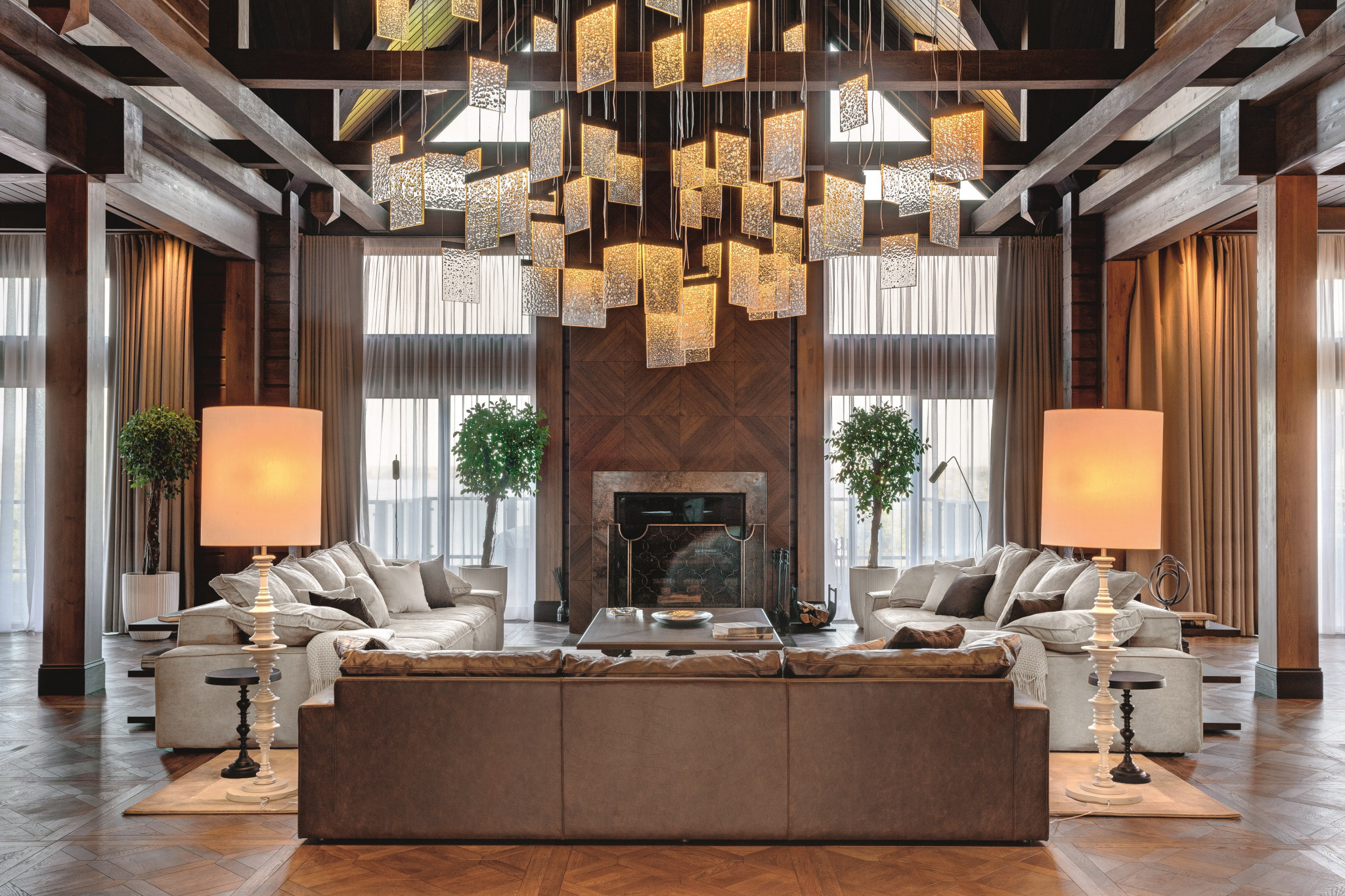 Первым на участке был построен банный комплекс с бассейном и хаммамом, следом за ним появились основной дом общей площадью чуть меньше 1000 кв. м и далее — беседка. Весь первый этаж в главном доме заняла просторная общественная зона, включающая гостиную, столовую, кухню, парадный холл и спортзал. Второй этаж — приватный, здесь находятся спальни с ванными комнатами и малая гостиная. «Хотя это и не дом для постоянного проживания, а лишь дача, тут есть всё, как для отдыха, так и для работы: тренажёрный зал, спа–комплекс с бассейном, домашний кинотеатр, рабочий кабинет и большое количество спален для домочадцев и гостей. Так что усадьба в этом смысле полностью автономна», — замечает Елена Потёмкина.
