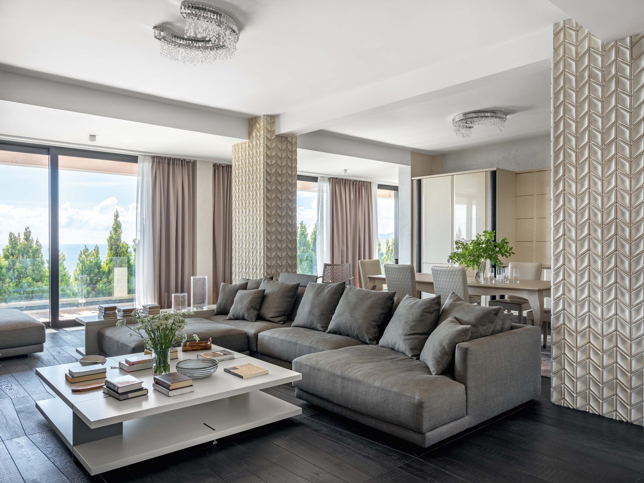 Хозяйка квартиры приняла решение о покупке апартаментов в Черногории за несколько минут, вдохновившись уединённостью месторасположения и панорамным видом на море. Перепланировку делать не стали, так как она полностью удовлетворяла потребностям: панорамное окно в каждом помещении, размер комнат, наличие при каждой спальне санузла и вместительная гардеробная. Помимо этого, в цокольном этаже есть спа–зона с бассейном, хаммамом, сауной и подсобными помещениями. В общем, идеальное пространство для проведения отпуска. Интерьер выдержан в тёплых серых оттенках: нежно–песочных, горчичных, сливочно–шоколадных, айвори. «Палитра выбрана неслучайно, — замечает Анна Макайкина.— Мне хотелось, чтобы внутреннее пространство стало продолжением умопомрачительного морского пейзажа за окном и не отвлекало от его созерцания. Морскую тему, в свою очередь, поддерживают предметы в синей гамме в цокольном этаже». Отделочные материалы выбирались максимально натуральные. Камин и ванные комнаты выполнены полностью из травертина, как и весь нижний спа–этаж. Две колонны в гостиной декорированы гипсовыми 3D–панелями с геометрическим рисунком. Для придания объёма дополнительно «состарили» их края. Форма панелей повторяет рисунок спинок стульев FENDI CASA. Этот же рисунок прослеживается в орнаменте обоев JAB, которыми отделана центральная стена. Ещё один акцентный элемент — панно от SMANIA. На фоне практически монохромного интерьера они дают пищу для воображения. «Основным пожеланием хозяев было «никакого старья и лишней мебели», —вспоминает Анна.— Мне нужно было приблизиться к минимализму, но при этом остаться в русле уютного и презентабельного интерьера. После того как была завезена вся мебель, стали добавлять аксессуары, которые находили в галереях искусства и на блошиных рынках. Заказчик очень любит нестандартные произведения искусства, антиквариат. Специально для него мы подобрали серию автолитографий «Конь» Л. Курзенкова, линогравюры И. Егоровой, С. Холодкова, офорты В. Алимова, В. Клеруа и других советских художников 50–80-х годов прошлого века. По характеру