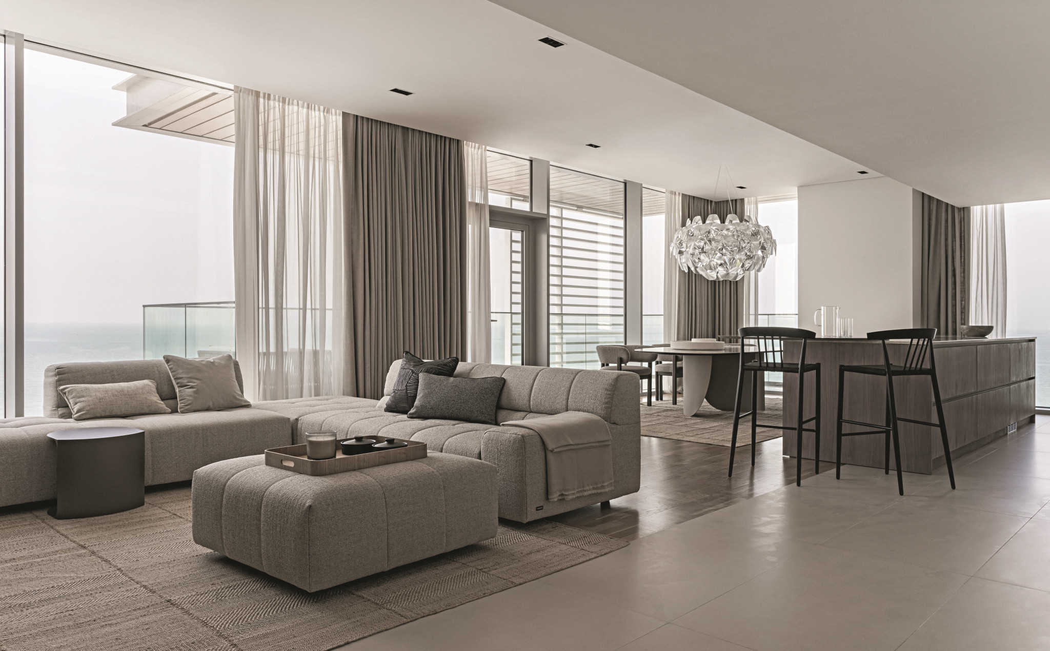 Квартира для семьи из пяти человек, оформленная бюро Simple Interiors, находится в знаковом для Дубая месте — искусственном острове, с великолепными пляжами и инфраструктурой. Панорамные виды на Персидский залив напрямую повлияли на выбор стилистики и цветовой концепции квартиры. «Увидев бескрайнее море из окон апартаментов, возникла идея продолжить морское умиротворение и спокойствие в интерьере, — рассказывает Леся Печенкина. — Нам хотелось создать островок безопасности и комфорта, максимально соприкасающийся с экстерьером. На наш взгляд, интерьер квартиры у моря призван располагать к расслаблению, восполнению ресурса и возможности наслаждаться видами этого места — в дизайне это достигается путем спокойных мягких форм, приятных тактильных фигур и натуральных материалов».