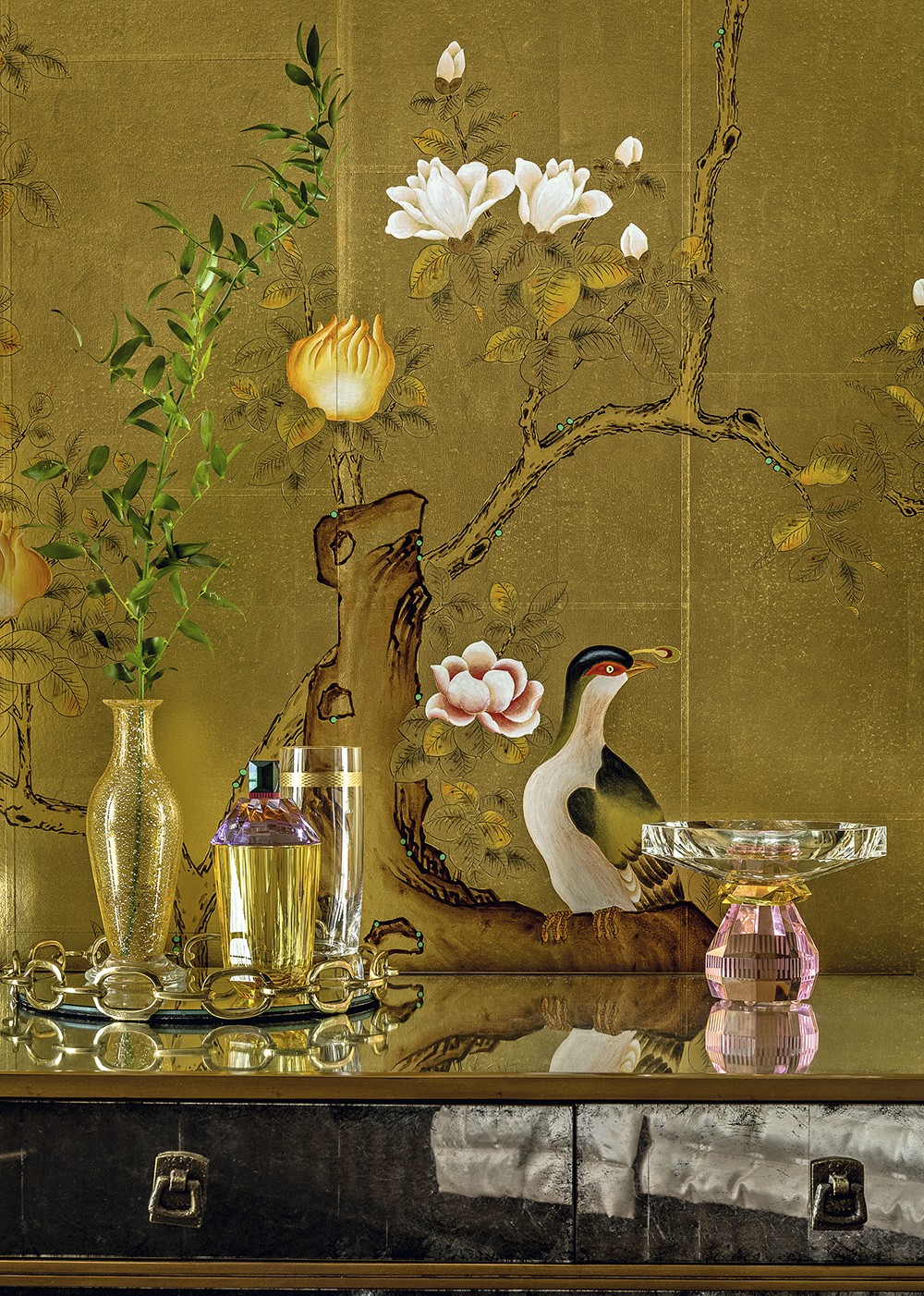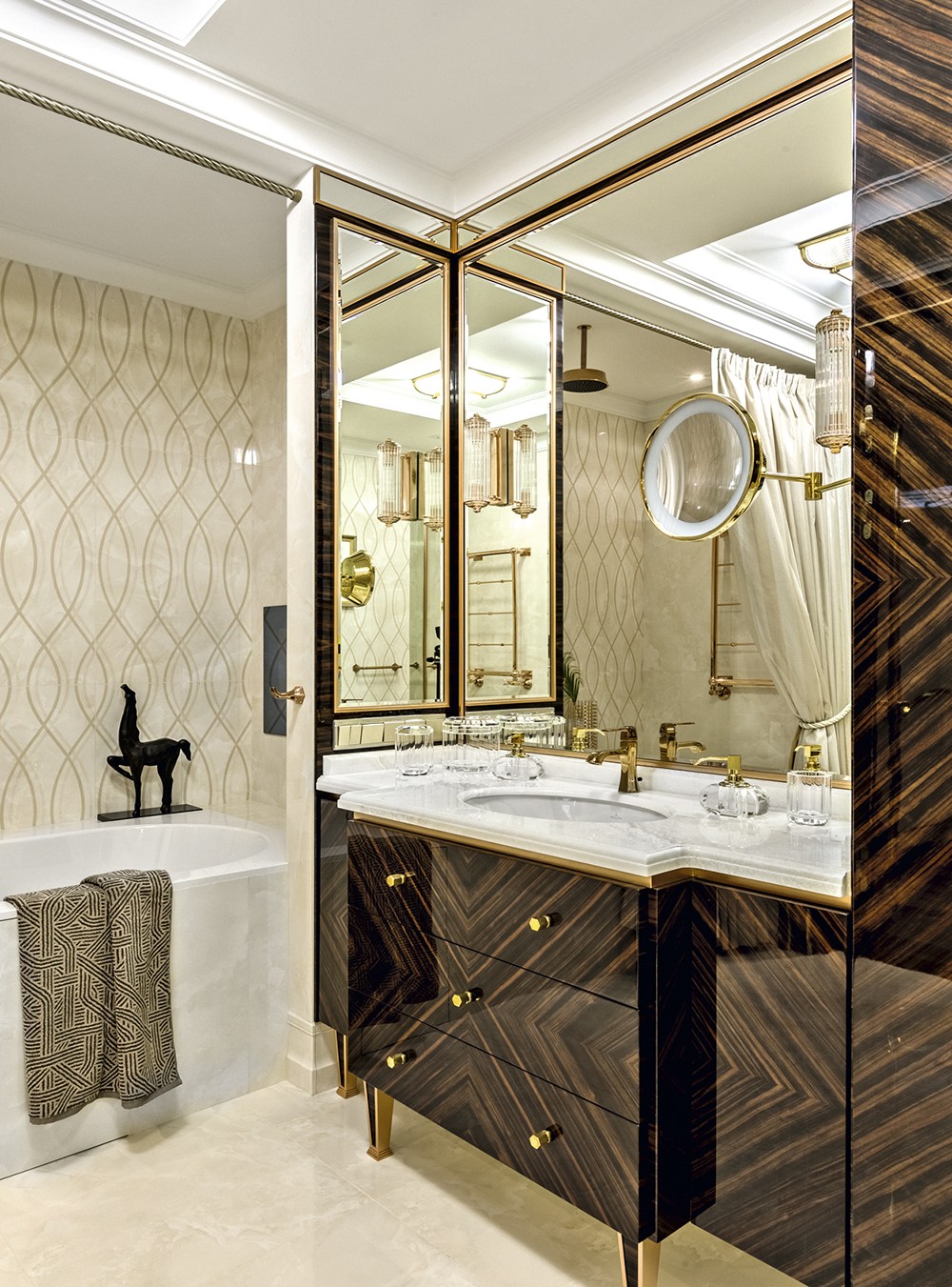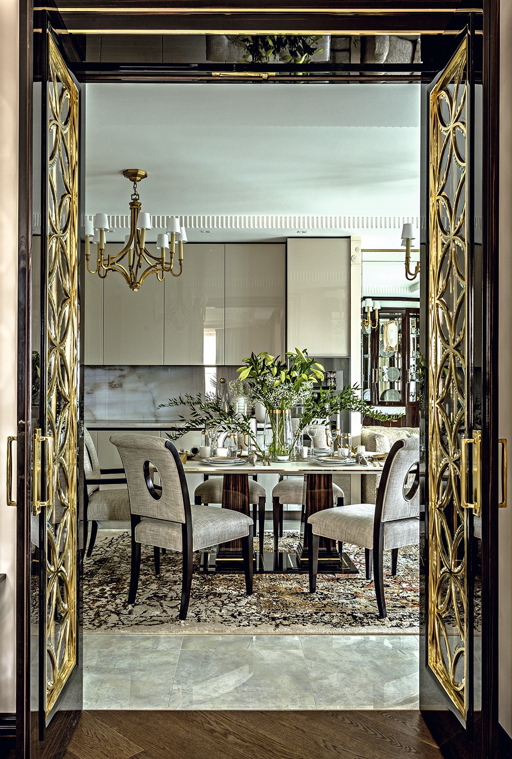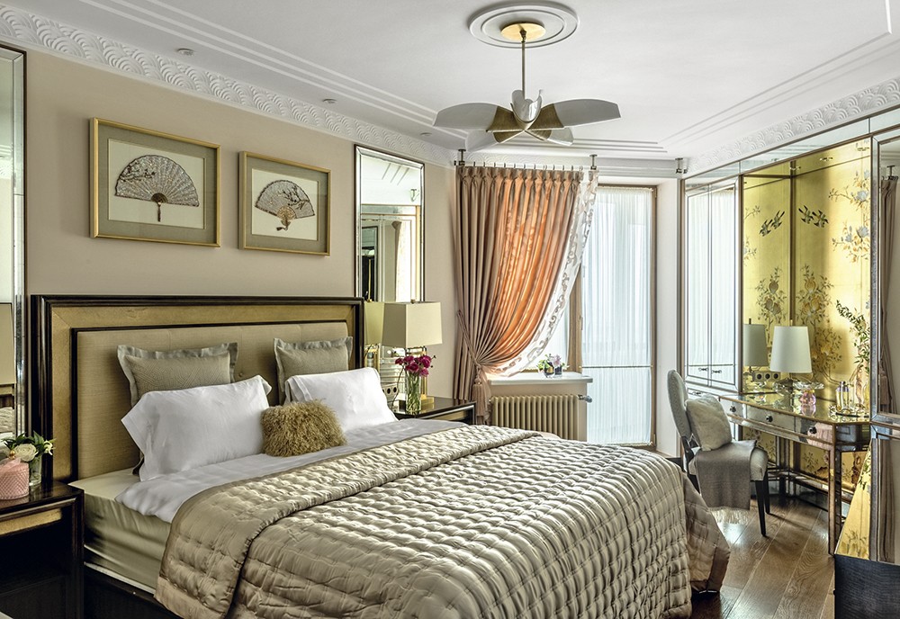 Одно из них — библиотека в гостиной, которая представляет собой неправильный пятиугольник. «Ядро гостиной — книжный шкаф, вокруг которого разворачивается интерьер, — рассказывает Екатерина Лебедева. — Я спроектировала его боковые стороны в виде пирамиды: она ступенями спускается к стенам. Это позволило визуально связать объём шкафа с пространством гостиной». Шкаф из шпона макасара и сикомора и с отделкой латунью перекликается по стилю с ТВ–зоной, межкомнатными дверями, потолочным витражом и корпусной мебелью в прихожей. Всё это и многое другое, включая витрины в гостиной и корпусную мебель в спальне, сделано по чертежам Екатерины Лебедевой на российском производстве «СОФИЯ ДЕКОР». «Это в буквальном смысле ювелирная работа, — говорит дизайнер. — Так, в межкомнатных дверях стекло с радиусным фацетом вставлено в раму из латуни, а фацет двойной, то есть срезана кромка с каждой стороны». На солнце фацетированные стёкла сверкают, как бриллианты. Геометрический узор латунной рамы символизирует экзотический цветок. Аналогичный узор также встречается в потолочном витраже прихожей и в рисунке пола. Витраж сделан из литого, проработанного вручную стекла с мотивами в духе знаменитой ширмы Эдгара Брандта — с цветами пассифлоры и розами. Эти же мотивы в декоре встроенных шкафов. Технологически непросто было установить огромные полотнища литого узорного стекла в рамы из латуни, но мастера с этим справились. Столь же непростой путь прошли витрины в гостиной — из стекла, декорированного в технике пике, и латуни. Макасар, сикомор, оникс, литое обработанное вручную стекло — дорогие материалы абсолютно отвечают стилю респектабельного шика, в котором оформлена квартира. Завершающим штрихом служит текстиль пудровых оттенков и тактильно приятных благородных текстур. Это целый ряд люксовых брендов: FABRICUT, JAMES HARE, HOULÈS, CHRISTIAN FISCHBACHER, JAB, NYA NORDISKA.