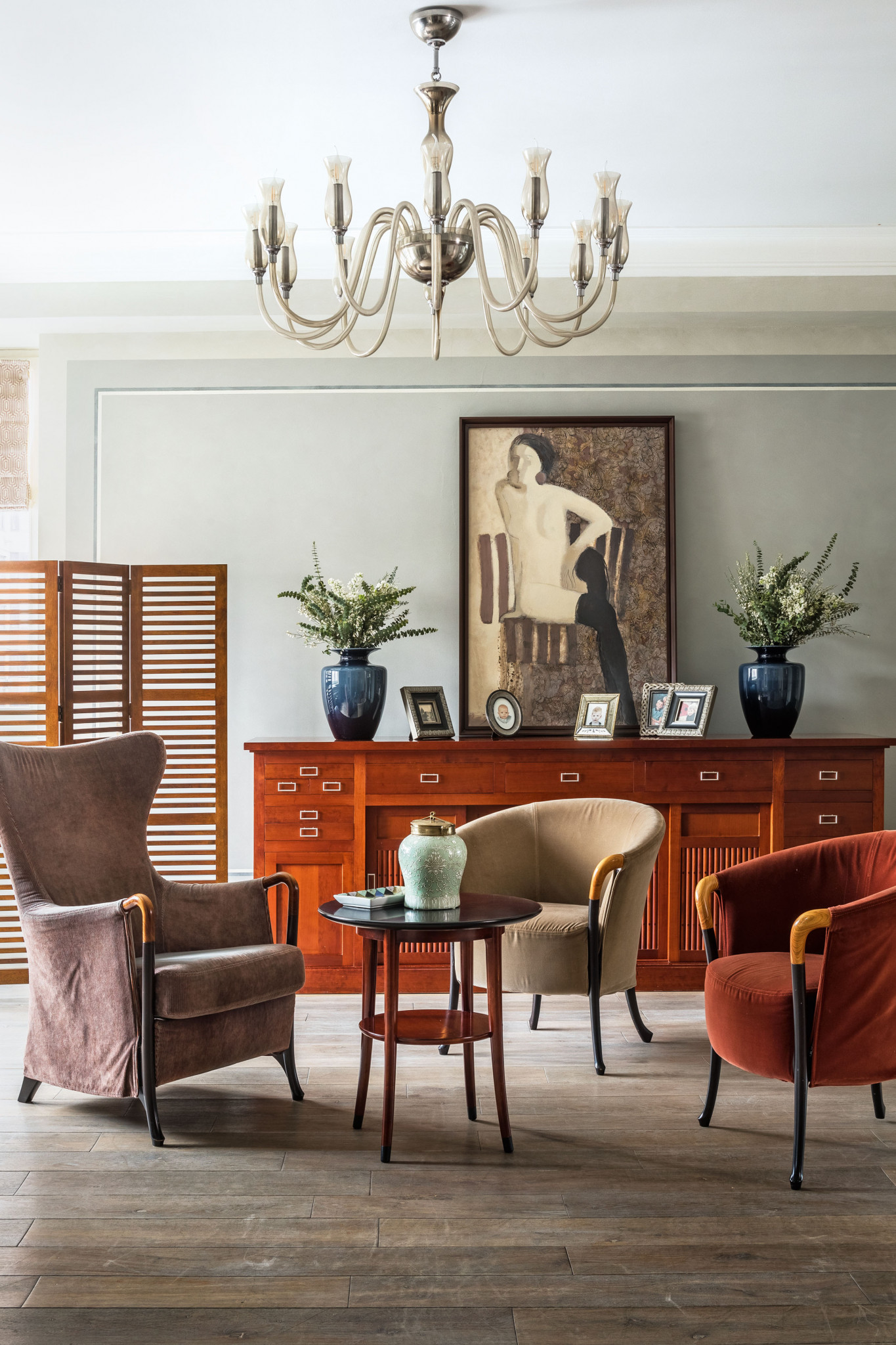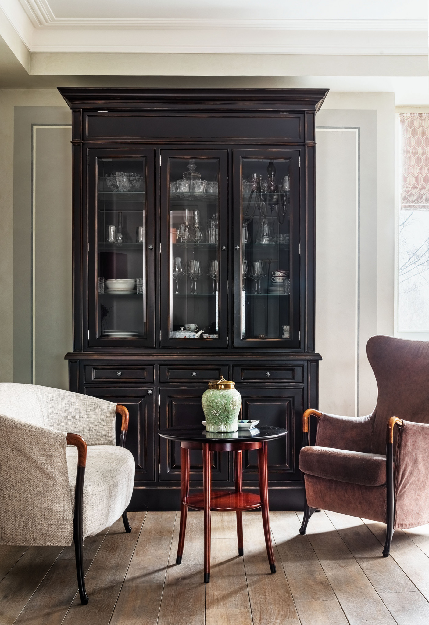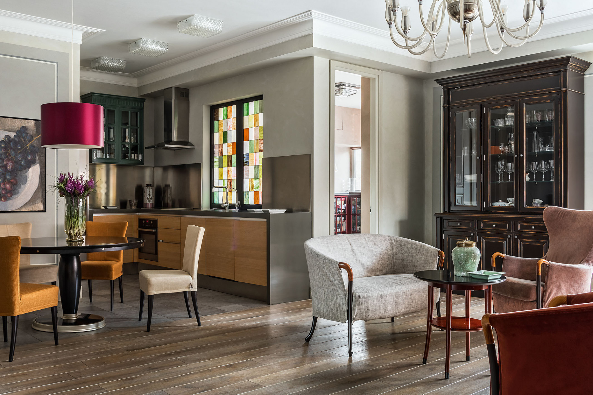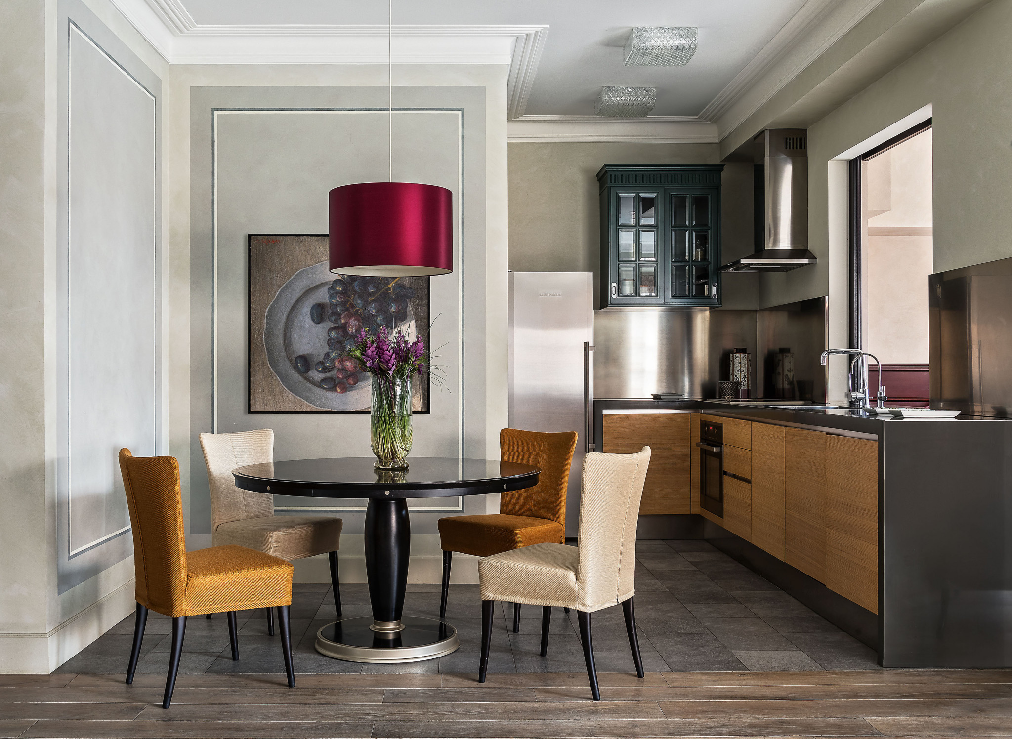 Квартира на Ленинском проспекте принадлежит супругам, которые — так сложилось — живут на две страны, и это их московская семейная резиденция. Хозяин родом из Риги, а хозяйка — из Москвы, и это обстоятельство повлияло на стилистику интерьера: здесь органично сочетаются уютная «старомосковская» классика и прохладный «нордический» стиль с его лаконизмом и сдержанной колористикой. Неоклассика, элементы mid–century, ар–деко, европейского функционализма — все эти составляющие эклектичного интерьера органично существуют вместе. Объединяющим моментом служит цвет — универсальные оттенки серого в декоре пола и стен, а также натуральные материалы. Приоритет отдали натуральному дереву.