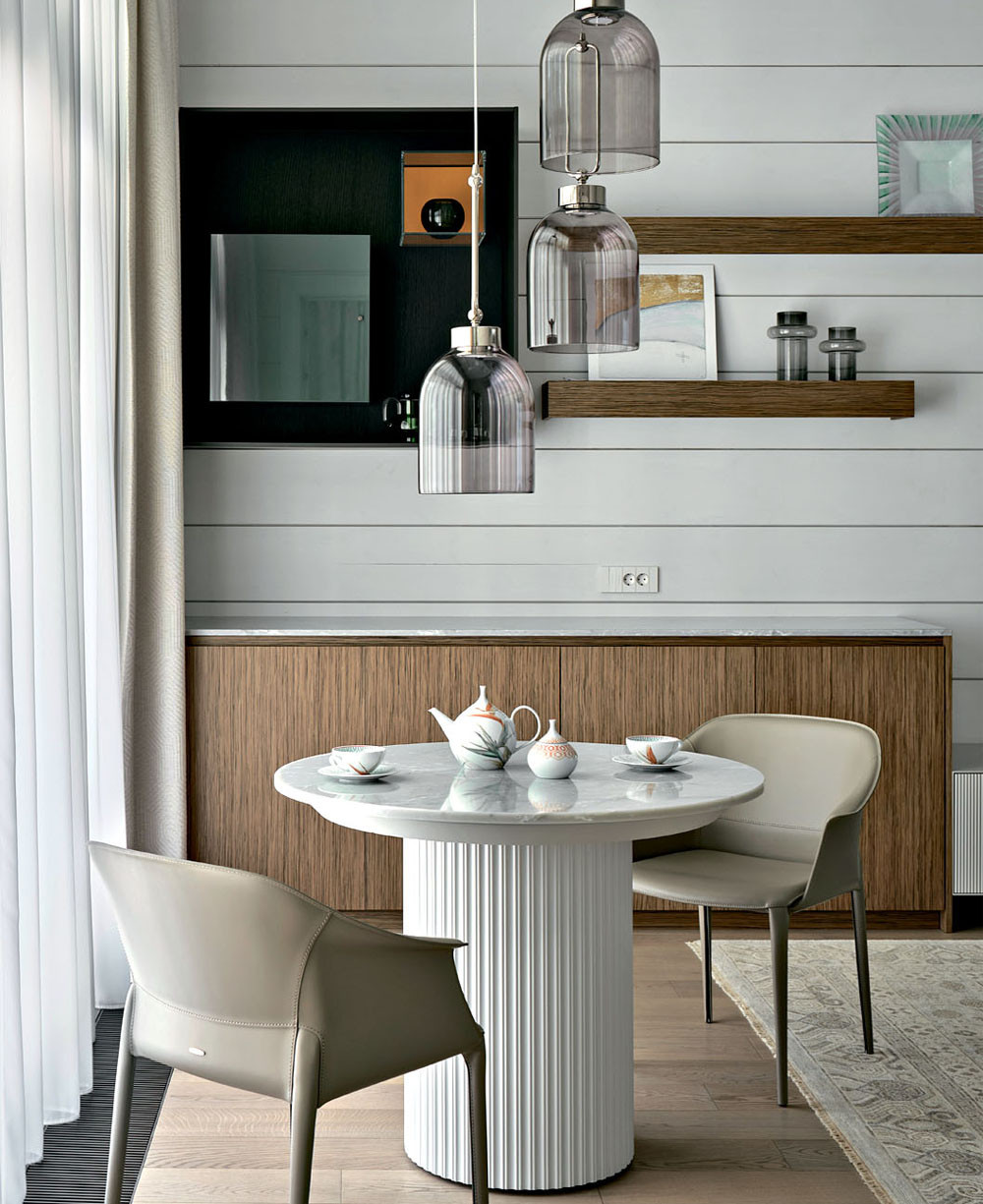 «Хозяйка много времени уделяет дому, — говорит автор проекта интерьера Елена Лукинская, — его декорированию, кулинарии и сервировке, поэтому с особым вниманием нами была проработана кухня, в частности предусмотрена специальная «гардеробная» для посуды, в которой хранятся сервизы, скатерти, столовые приборы. Заказчица принимала активное участие в подборе всех элементов мебели и декора, а в день сьемки активно помогала декорировать интерьер. Для нее важно, чтобы каждый артобъект имел глубокий смысл, а не просто был хорош визуально». Вот и ответ на вопрос, почему этот дом так тонко сочетает элегантность с домашним теплом и уютом.