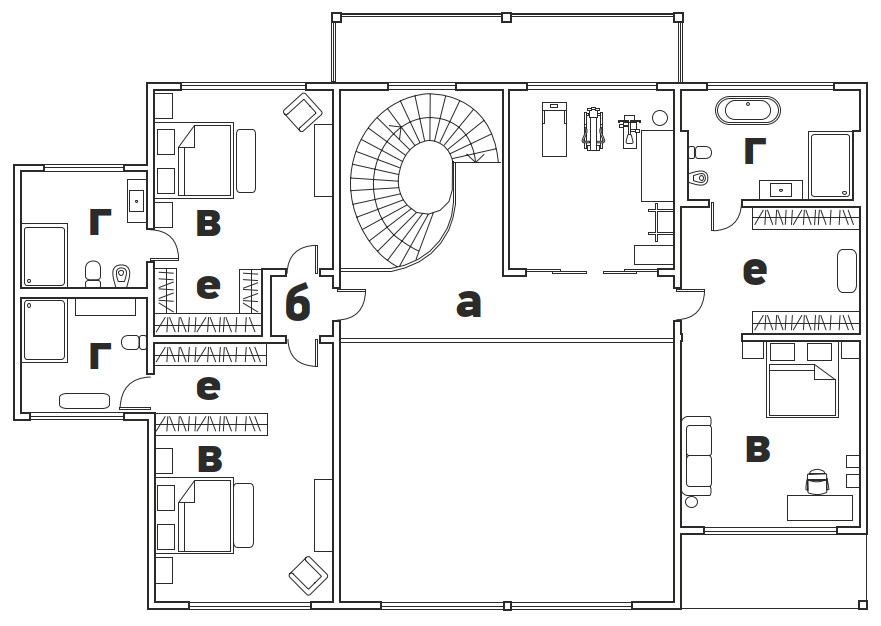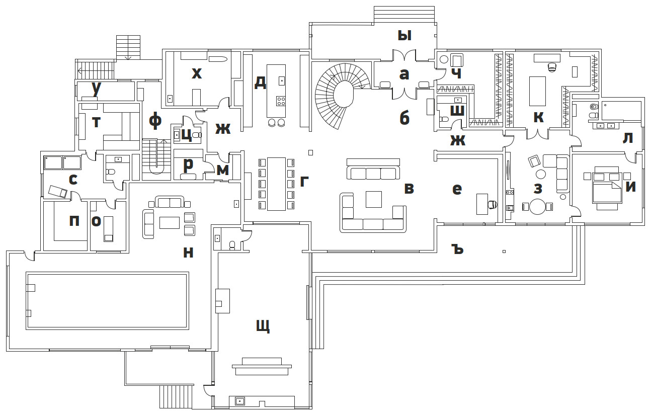 Дом просторный и светлый, в нем есть всё для комфортной жизни большой семьи — супругов и их троих взрослых сыновей. Центральное пространство дома — двусветная гостиная, вход в которую — через большой холл-прихожую с масштабной, при этом легкой и воздушной винтовой лестницей с ограждением из моллированного (гнутого) стекла. Панорамные окна стирают границу между интерьером и ландшафтом. Рядом с гостиной — столовая и просторная современная кухня с функциональным островом, спрятанная за объемом лестницы. На первом этаже по желанию заказчиков в отдельном крыле дома находится приватная хозяйская территория со своей спальней, мини-гостиной и кухней — такое решение усиливает ощущение уюта в большом доме. Отдельным блоком спроектирована спа-зона с бассейном, русской парной и хаммамом. Три блока помещений для сыновей расположены на втором этаже. Там же спортзал — в помещении с балконом. В просторном цокольном этаже — пространства для отдыха: бильярдная с барной зоной, кинотеатр, детская игровая зона. Первоначально задумали сделать большую крытую террасу с камином, объединяющую основные помещения первого этажа и помещения бассейна, а вблизи дома — зону барбекю. Но в процессе проектирования было решено включить эту террасу в теплый контур дома и переместить в нее барбекю. Так появилась еще одна гостиная — каминная. Роль стен здесь играют огромные стеклянные слайд-системы, визуально объединяющие это пространство с окружающей природой.
