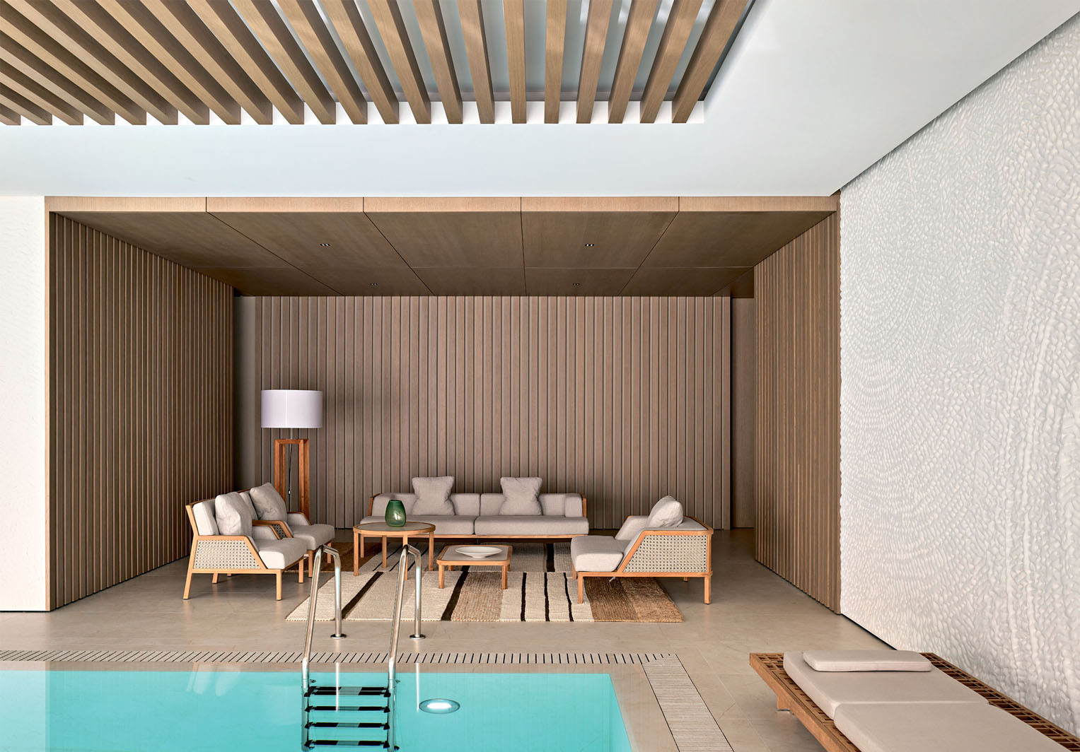 Зона отдыха при бассейне организована в уютной нише. Здесь уже использована отделка деревом, подчеркивающая связь пространства с природой. Диванная группа, Ethimo. Ковер, Decaro
