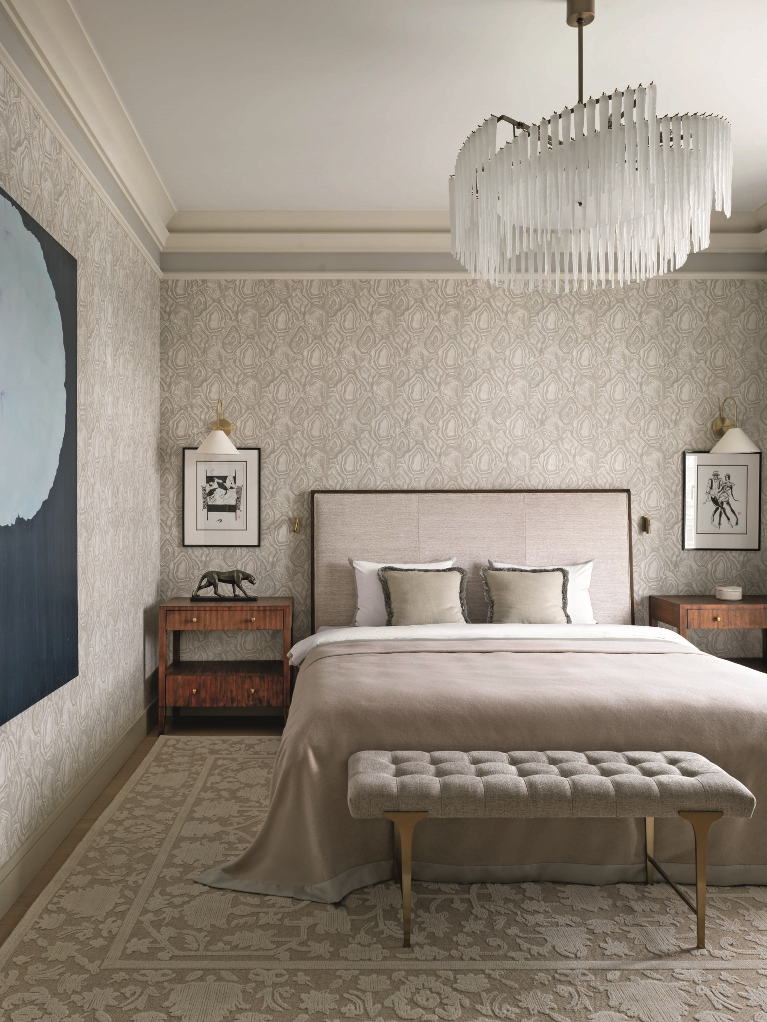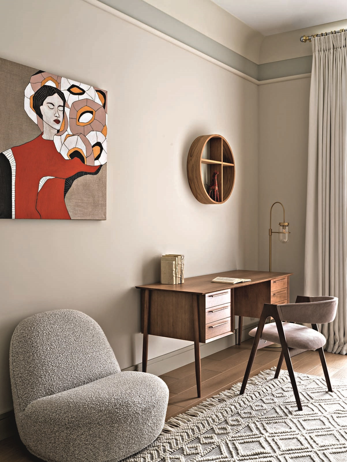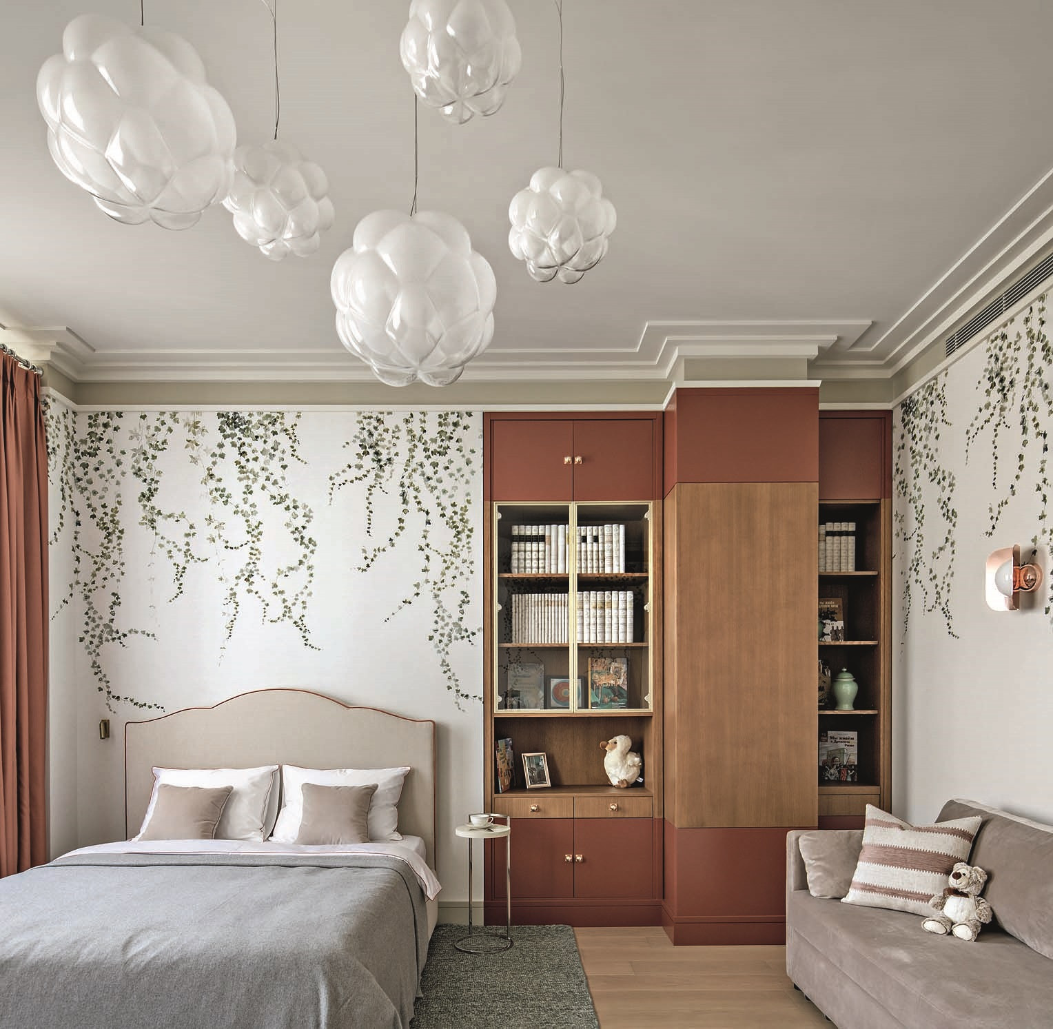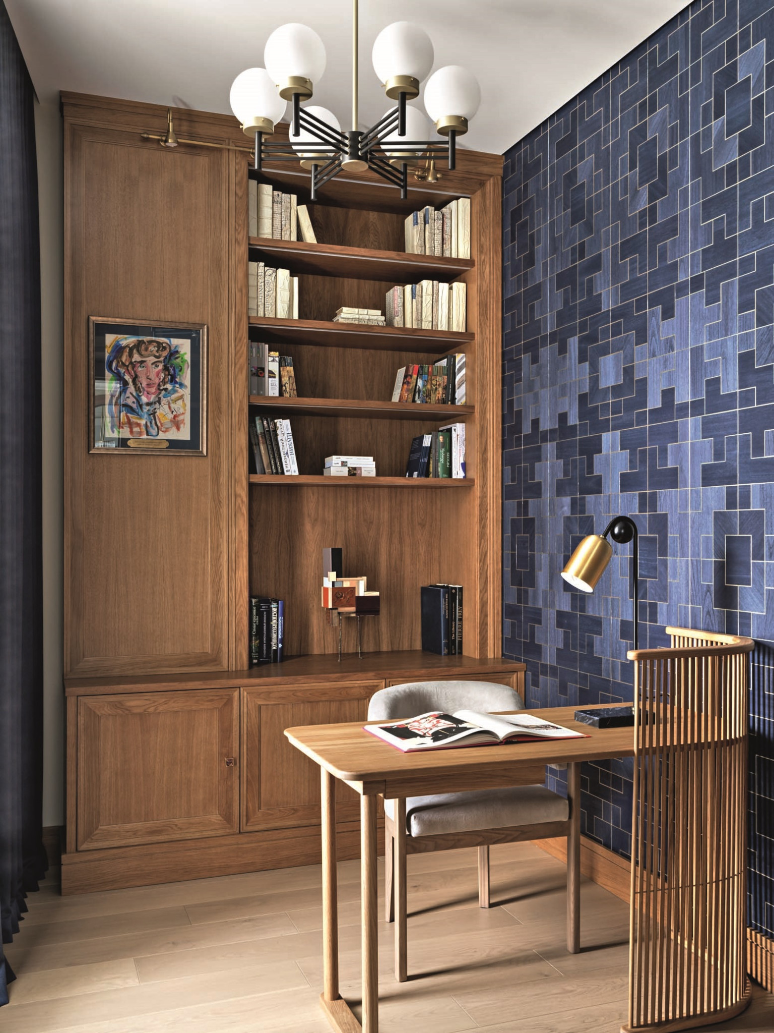 Родительский блок (спальня, гардеробная и ванная) имеет отдельный коридор и расположен в стороне от того крыла квартиры, где находятся детские, — ближе к гостиной. У гостиной в процессе проектирования наметился небольшой «аппендикс», который было решено превратить в кабинет хозяйки — и теперь это одно из самых красивых помещений в квартире. Ольга учла всё, включая системы хранения и постирочную, не забыла даже про домашнего питомца — морскую свинку, спроектировав для нее новый удобный домик. В этом году компании Ольги Кушнаревой-Леоне исполняется 20 лет. Этот интерьер — еще одна яркая история. Но можно ли назвать его модным? Отвечая на этот вопрос, Ольга признается, что во время работы над этим пространством ни разу не звучали слова «модный», «востребованный» — только фразы «подходящее нам», «отвечающее нашему вкусу», «удобное для жизни», «как мы любим». «Всё, что в нем собрано, нравится заказчикам и соответствует их пониманию прекрасного, — подытоживает архитектор. — И это лучше, чем модно — «попасть в настроение» заказчиков на 100%».