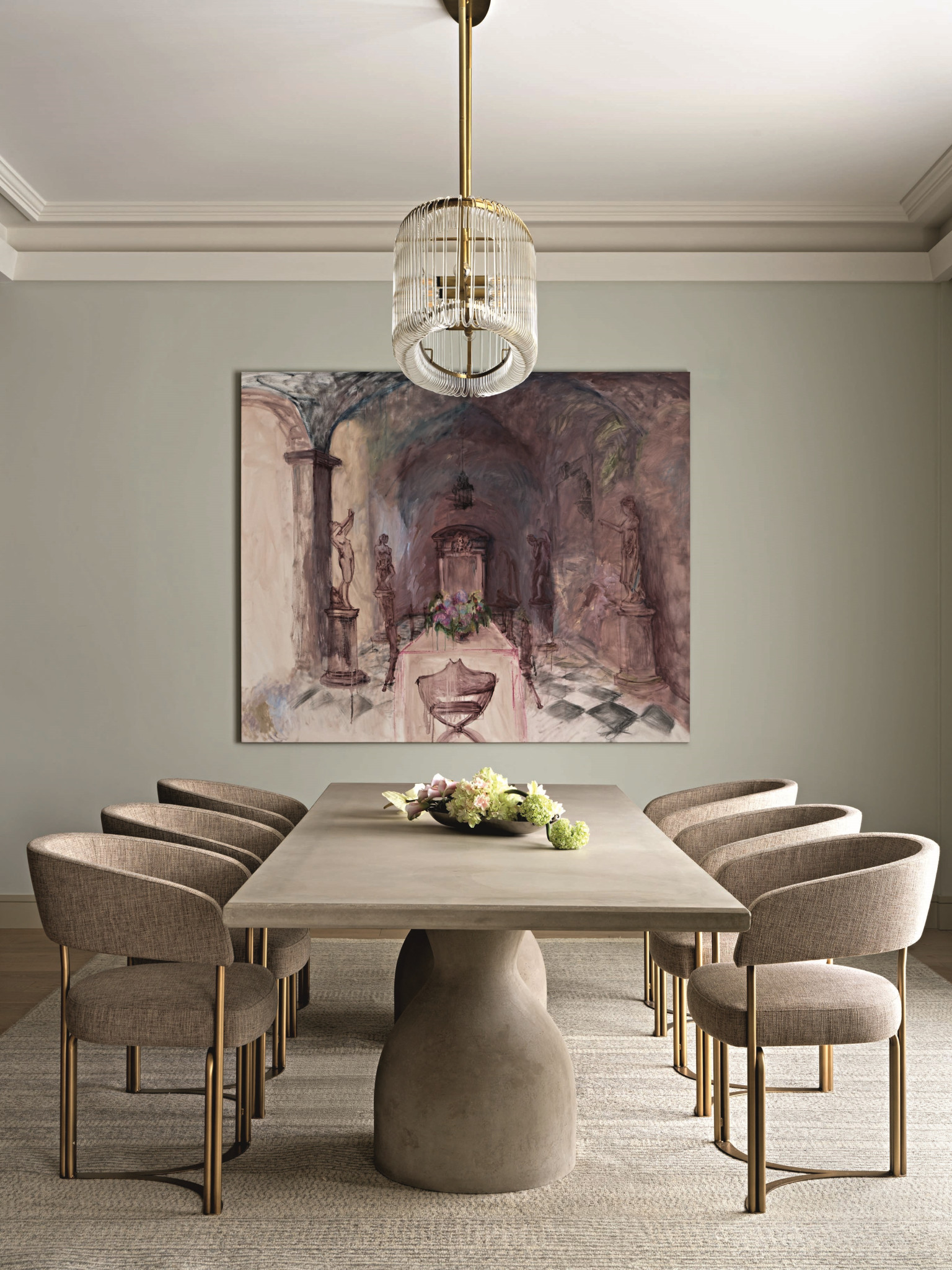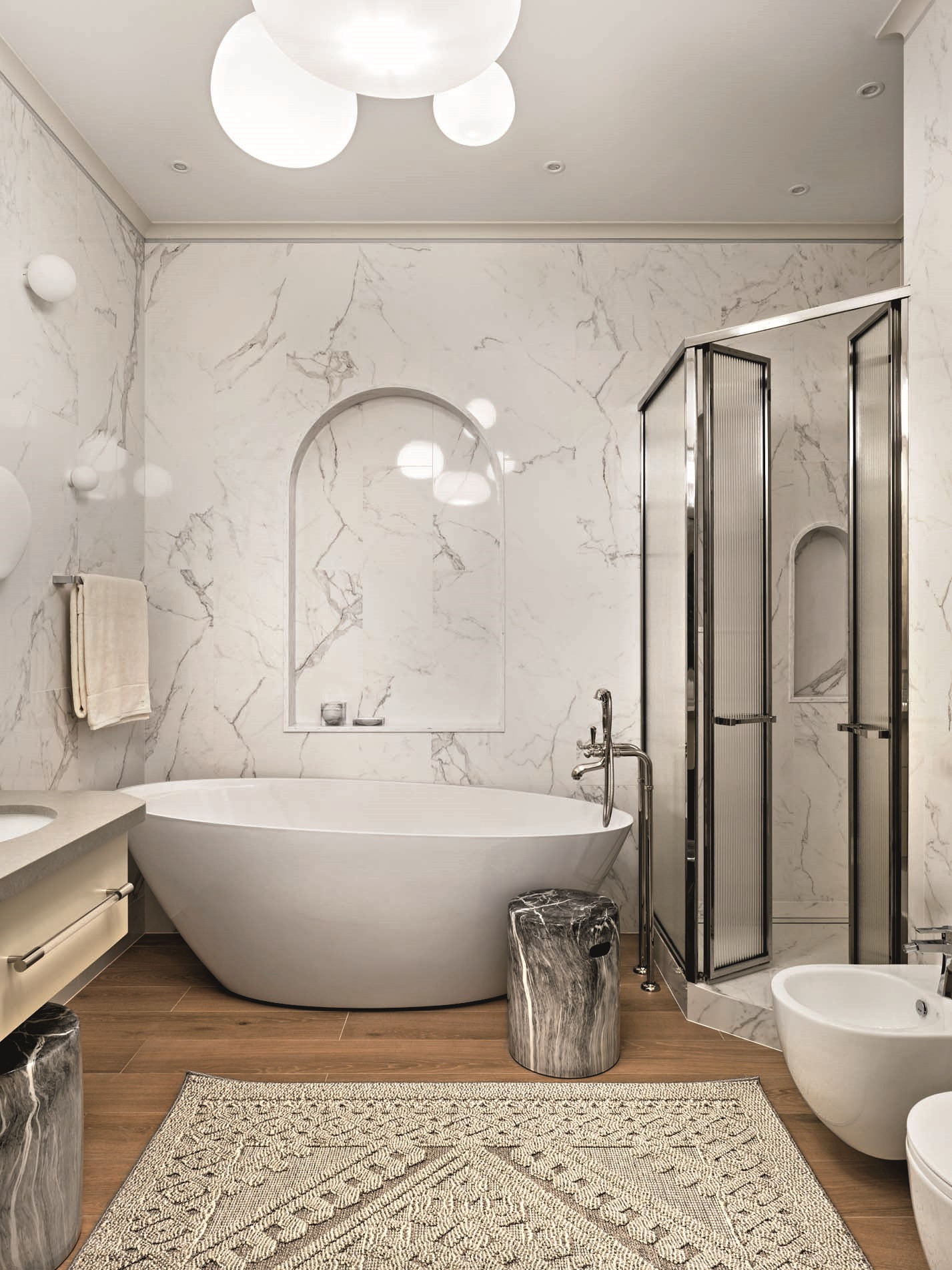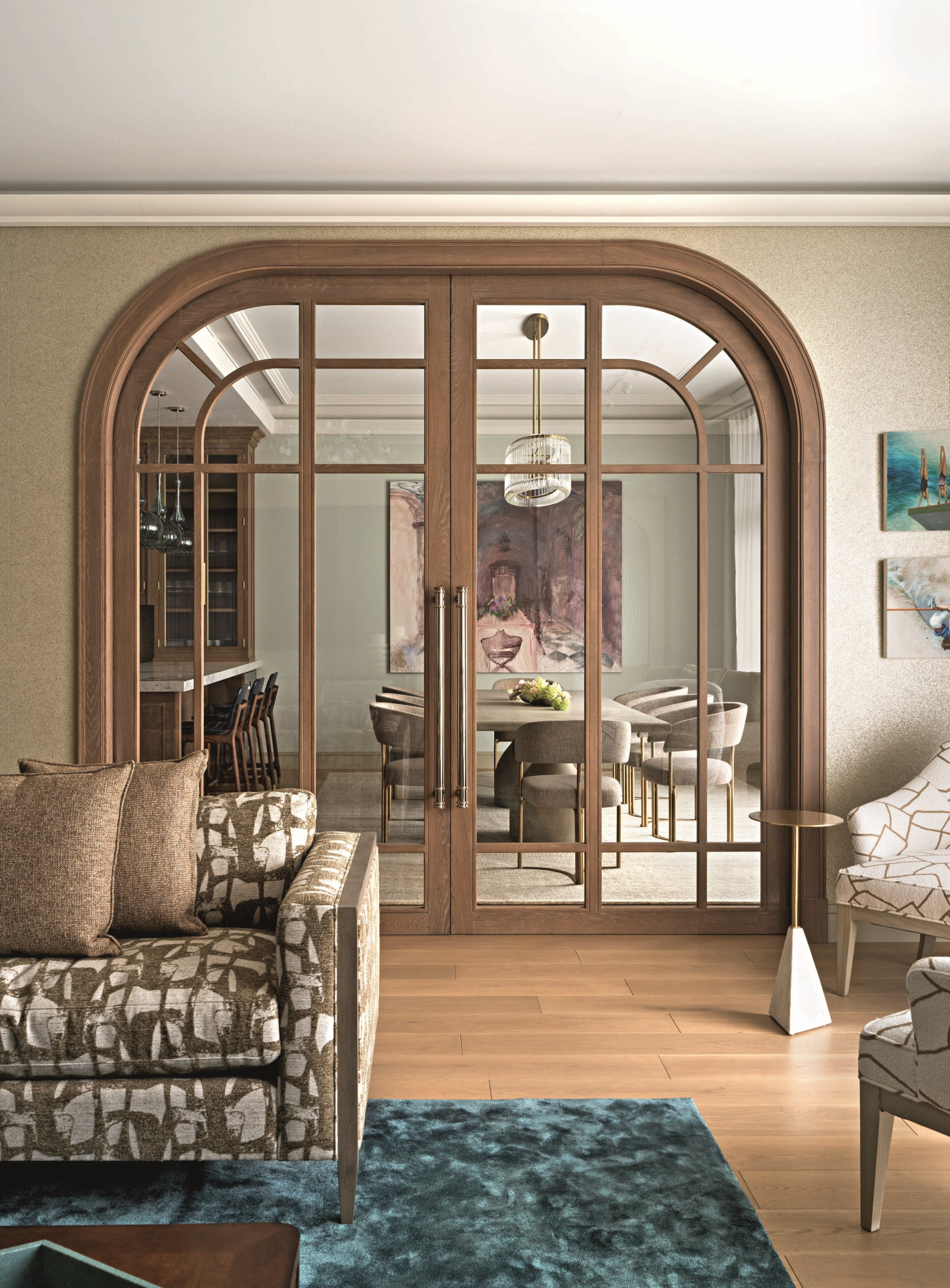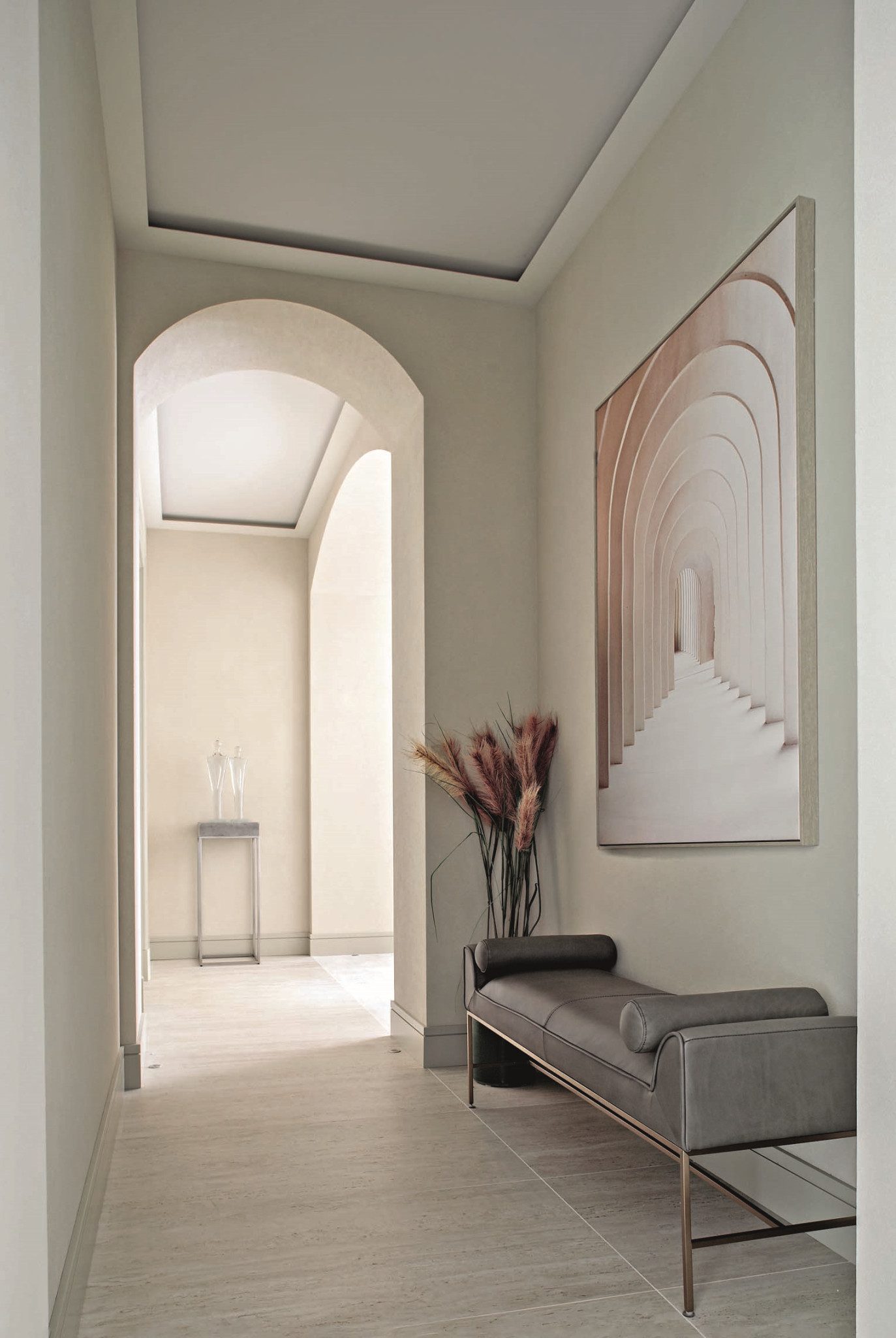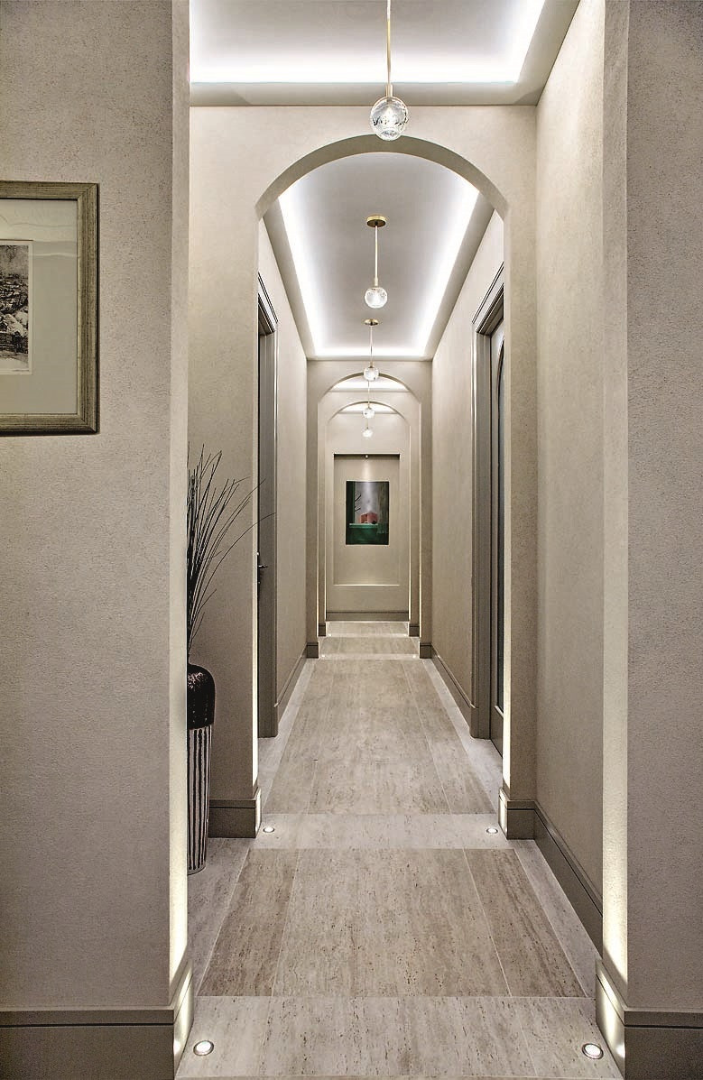 Молодая семейная пара, у которой теперь уже трое детей — две дочери и сын, не в первый раз обращается к Ольге Кушнаревой-Леоне: до этого архитектор уже делала для них загородный дом и квартиру. «За десятилетие нашего общения все мы сильно изменились, — говорит автор проекта. — И мы, и наши заказчики «выросли», у нас сменились приоритеты, изменились вкусы. Мы как будто работали с новыми заказчиками, незнакомыми нам людьми. И особенно приятно, что у нас с хозяевами вновь сложилось замечательное взаимопонимание, и мы получили благодарность за проделанную работу». Что касается стиля, то заказчики представляли себе не типичную старомосковскую квартиру, ассоциирующуюся со словом «Замоскворечье», а современную, легкую по ощущению, удобную и красивую, без лишнего декора и с использованием современных отделочных материалов: использовали, например, вместо мрамора керамогранит, а наряду с обоями — штукатурку. Предметы мебели, особенно для столовой и гостиной, подбирали дизайнерские, «с характером». Прекрасные арочные проемы, которые во многом формируют атмосферу интерьера, появились в процессе проектирования, когда автор проекта решала вроде бы чисто функциональную задачу: как создать места уединения для каждого члена семьи. Вот что сама Ольга рассказывает об этом: «Две квартиры достаточно сложно объединялись — такая планировка у дома. Задача изолировать личные пространства обязывала устроить множество коридоров и тамбуров. Увязать их с лаконичным современным интерьером, требующим пространства и «воздуха», было непросто. В связи с этим родилась идея оформить переходы арочными проемами. Кроме того, мы тщательно продумали все фокус-точки из основных локаций в квартире: они оформлены нишами для произведений искусства».