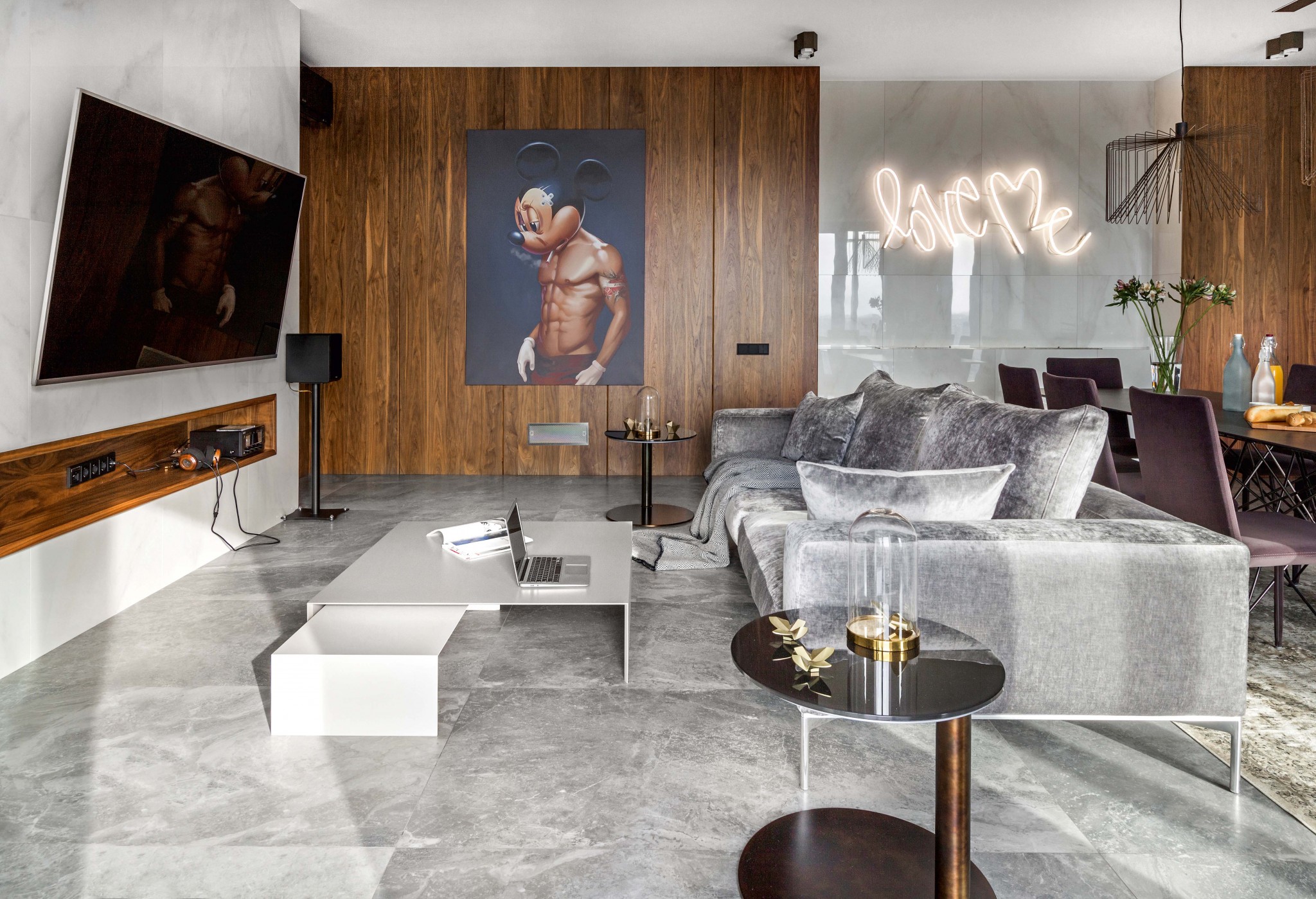 В гостиной пол выложен керамогранитной плиткой, что не типично для средней полосы. Автор проекта считает, что это создаёт в помещении колорит южного интерьера. На стене — цифровая вариация Айкута Айдогду на тему Микки Мауса, которому по просьбе хозяина дорисовали на руке татуировку. Диван, столики, Désirée
