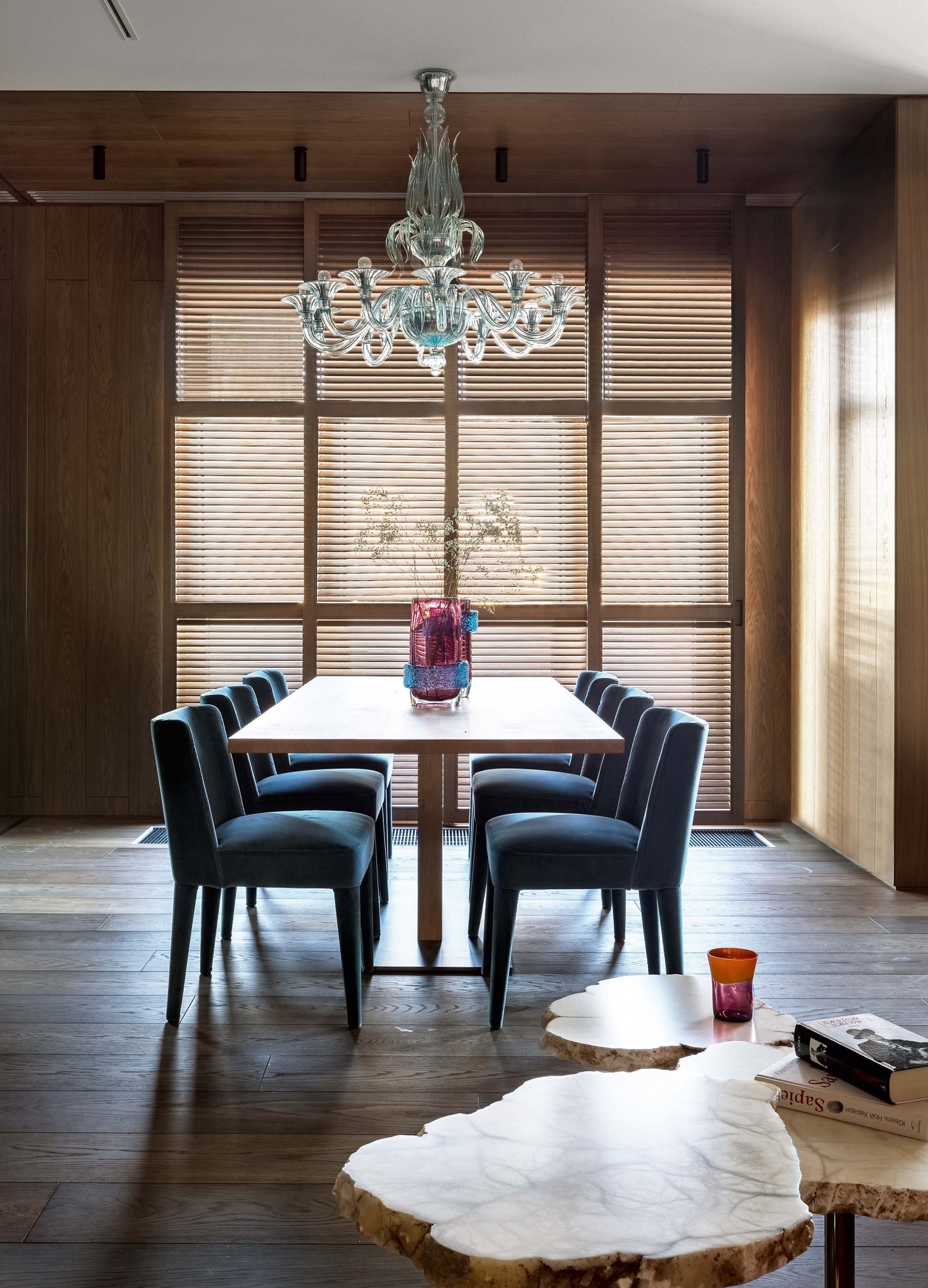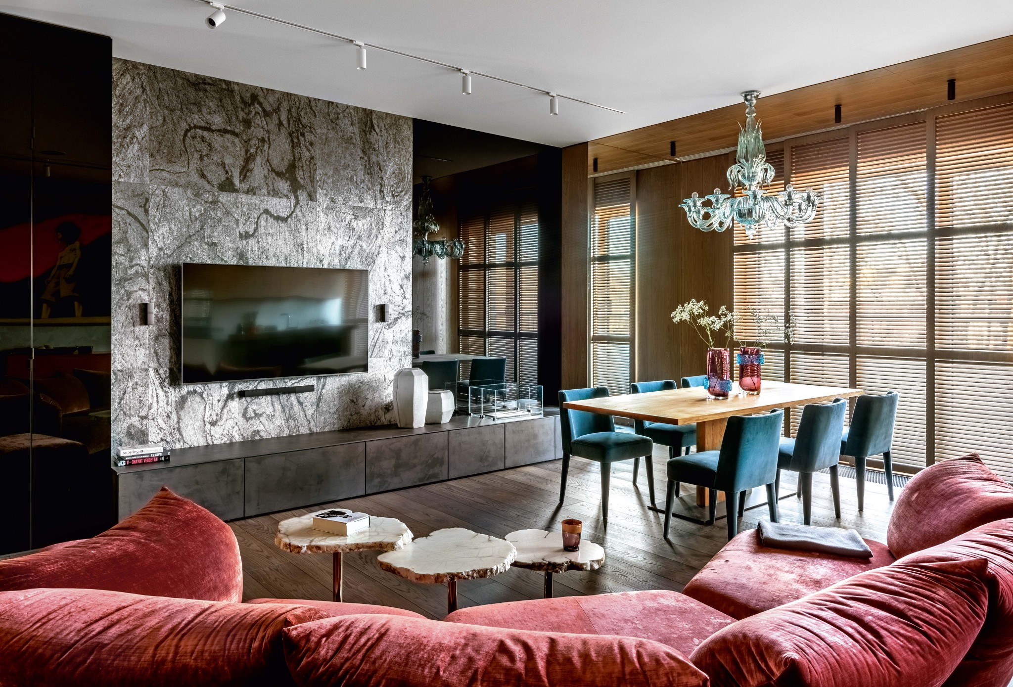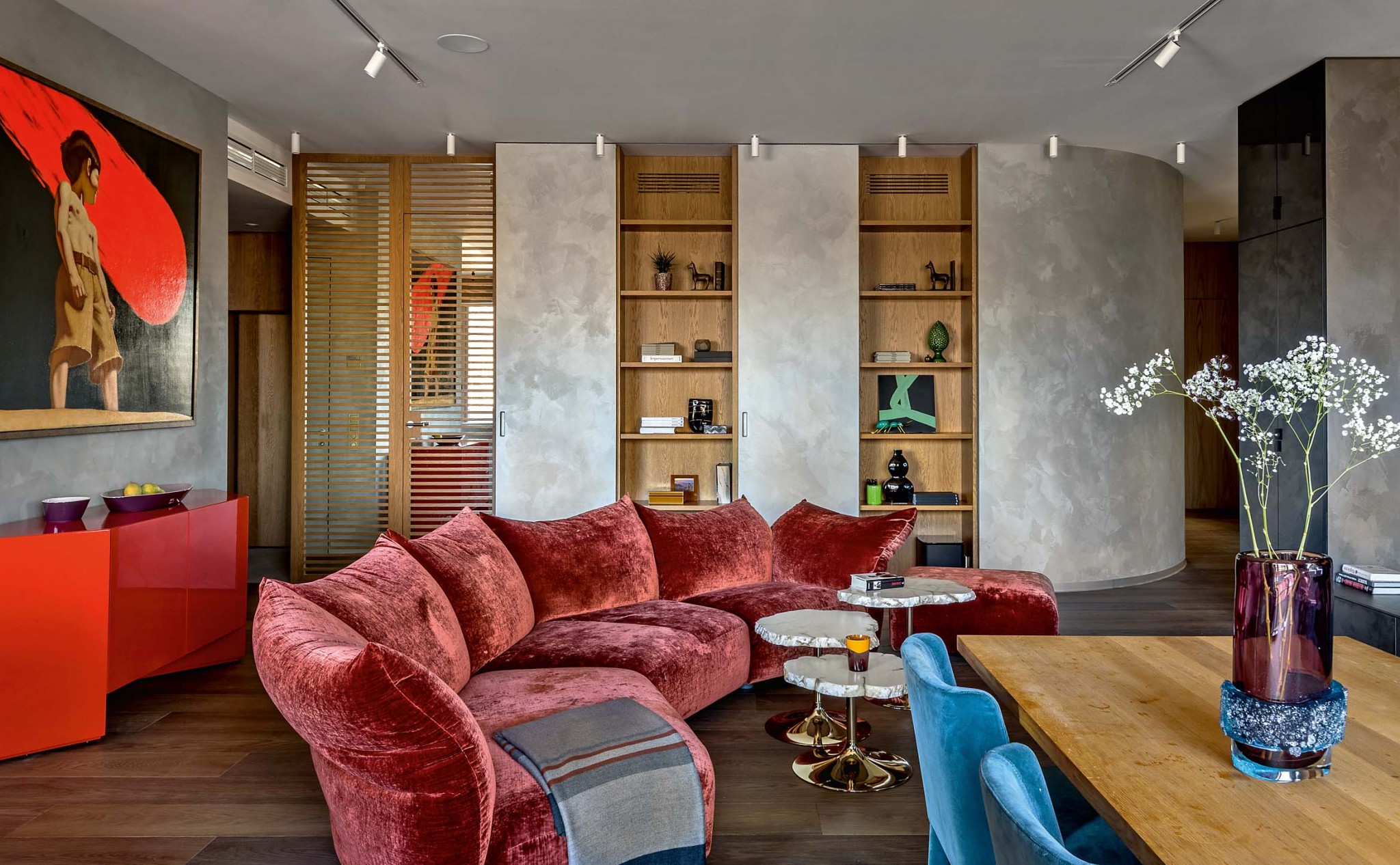 «При планировании пространства нам было важно расширить его визуально, сделать более открытым и свободным. Кроме того, мы всегда стараемся выстроить драматургию интерьера, найти эффектные ракурсы, с которых хозяева и будут воспринимать пространство», — говорит Мария Махонина. Ещё одним ключом к созданию нужной атмосферы стало колористическое решение. Для отделки стен и полов авторы проекта выбрали материалы в нежных оттенках серого и золотисто–бежевого. Благодаря большим окнам квартира не испытывала недостатка в солнечном свете, но свою роль сыграла ориентация окон в ключевых помещениях на северо–восток. Из-за этого дневное освещение получалось преимущественно холодным, а это противоречило «курортной» концепции проекта. Компенсировать это архитекторы решили разнообразными фактурами и тёплыми цветами аксессуаров и мебели. Александра Казаковцева вспоминает, как в самом начале проекта заказчица заметила образец терракотовой ткани на столе в мастерской и практически сразу его полюбила. Так в центре гостиной появился эффектный бархатный диван, а с фактурой его обивки выгодно контрастируют глянцевый натуральный камень и стекло в декоре стен, изящный столик со столешницей из мраморных слэбов, блеск парадной люстры из муранского стекла. Они стали ещё одним напоминанием о любимых путешествиях. В копилку таких предметов — источников воспоминаний можно смело занести шёлковые обои от DE GOURNAY в главной спальне или многочисленные аксессуары. Именно эти детали помогают переключить городской ритм на отпускной, курортный. «Комфорт современного городского жилища в принципе целиком и полностью зависит от проработки деталей, — поясняет Мария. — Пространство должно быть максимально экипировано удобными техническими помещениями, кладовыми и зонами для хранения. Скрыть их помогают декоративные приёмы: фальшжалюзи и зеркала. Благодаря этим уловкам и секретам квартира словно освобождается и становится своего рода выставочной площадью. На которой можно эффектно разместить яркие и неординарные предметы мебели, например яркий геометричный комод EMMEMOBILI или живопись современного художника Леонида Ротаря».
