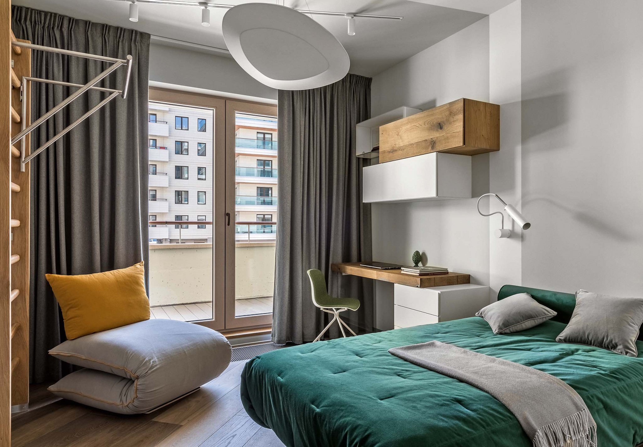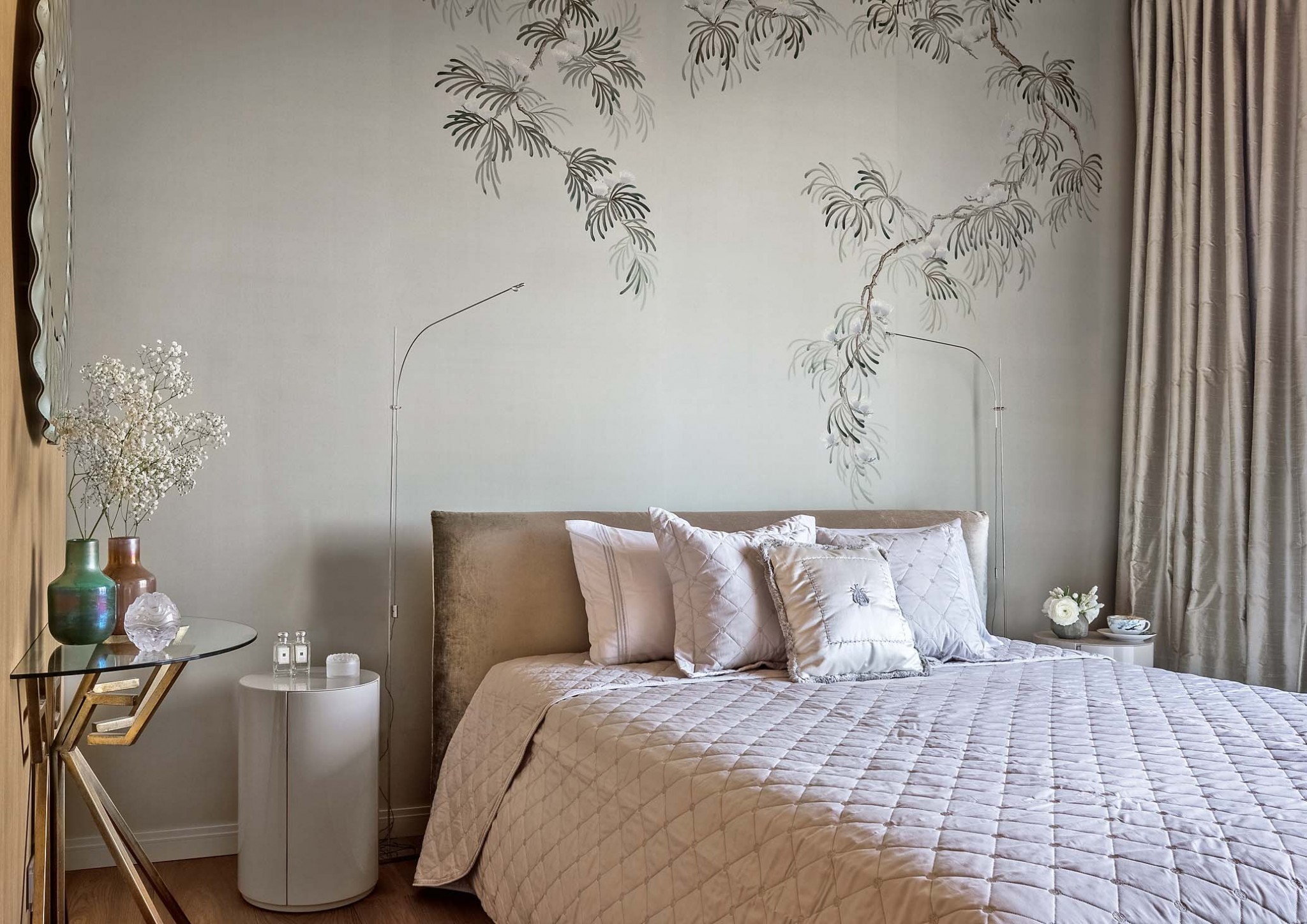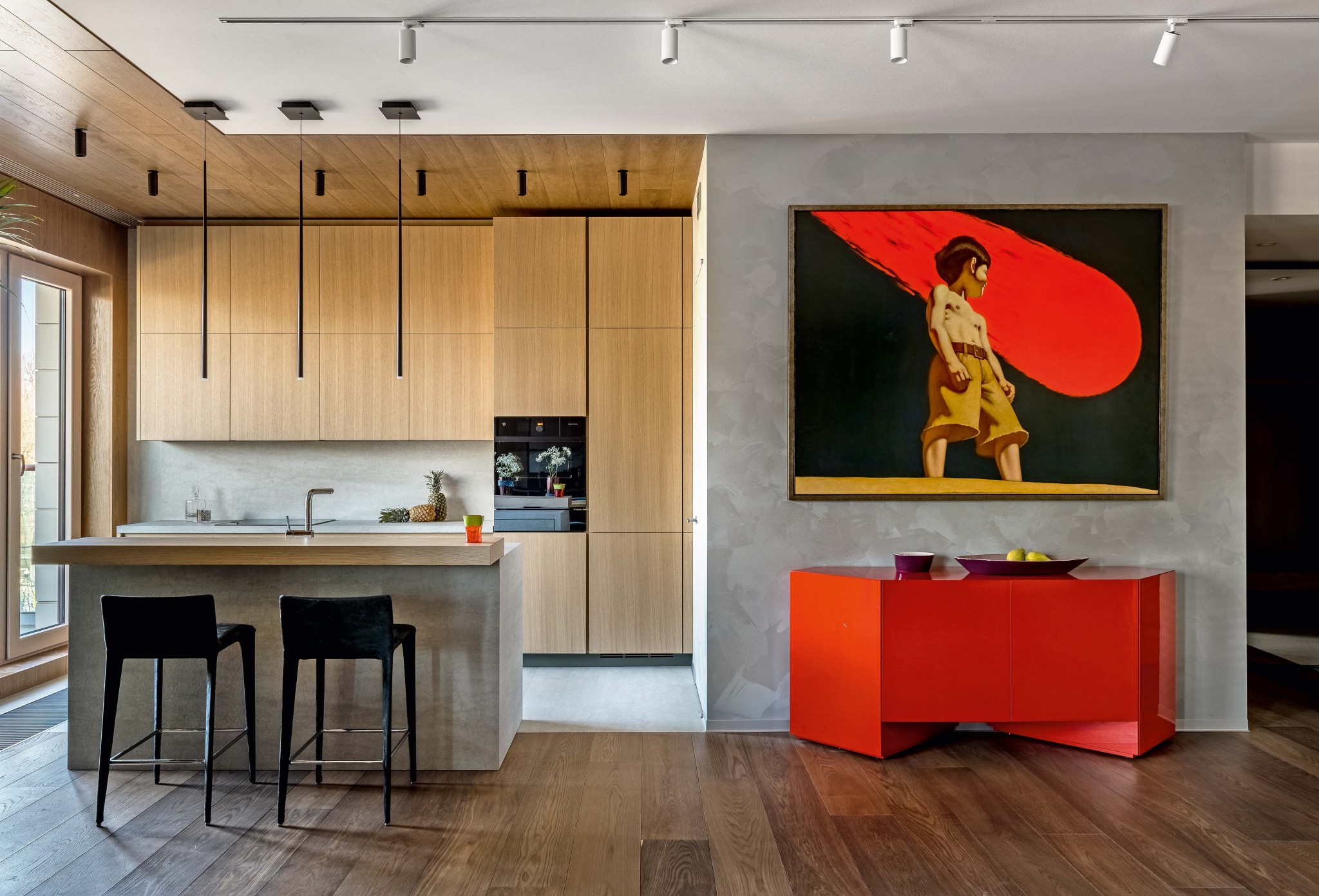 «При планировании пространства нам было важно расширить его визуально, сделать более открытым и свободным. Кроме того, мы всегда стараемся выстроить драматургию интерьера, найти эффектные ракурсы, с которых хозяева и будут воспринимать пространство», — говорит Мария Махонина. Ещё одним ключом к созданию нужной атмосферы стало колористическое решение. Для отделки стен и полов авторы проекта выбрали материалы в нежных оттенках серого и золотисто–бежевого. Благодаря большим окнам квартира не испытывала недостатка в солнечном свете, но свою роль сыграла ориентация окон в ключевых помещениях на северо–восток. Из-за этого дневное освещение получалось преимущественно холодным, а это противоречило «курортной» концепции проекта. Компенсировать это архитекторы решили разнообразными фактурами и тёплыми цветами аксессуаров и мебели. Александра Казаковцева вспоминает, как в самом начале проекта заказчица заметила образец терракотовой ткани на столе в мастерской и практически сразу его полюбила. Так в центре гостиной появился эффектный бархатный диван, а с фактурой его обивки выгодно контрастируют глянцевый натуральный камень и стекло в декоре стен, изящный столик со столешницей из мраморных слэбов, блеск парадной люстры из муранского стекла. Они стали ещё одним напоминанием о любимых путешествиях. В копилку таких предметов — источников воспоминаний можно смело занести шёлковые обои от DE GOURNAY в главной спальне или многочисленные аксессуары. Именно эти детали помогают переключить городской ритм на отпускной, курортный. «Комфорт современного городского жилища в принципе целиком и полностью зависит от проработки деталей, — поясняет Мария. — Пространство должно быть максимально экипировано удобными техническими помещениями, кладовыми и зонами для хранения. Скрыть их помогают декоративные приёмы: фальшжалюзи и зеркала. Благодаря этим уловкам и секретам квартира словно освобождается и становится своего рода выставочной площадью. На которой можно эффектно разместить яркие и неординарные предметы мебели, например яркий геометричный комод EMMEMOBILI или живопись современного художника Леонида Ротаря».