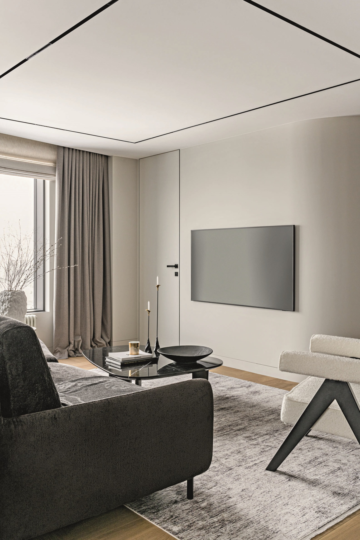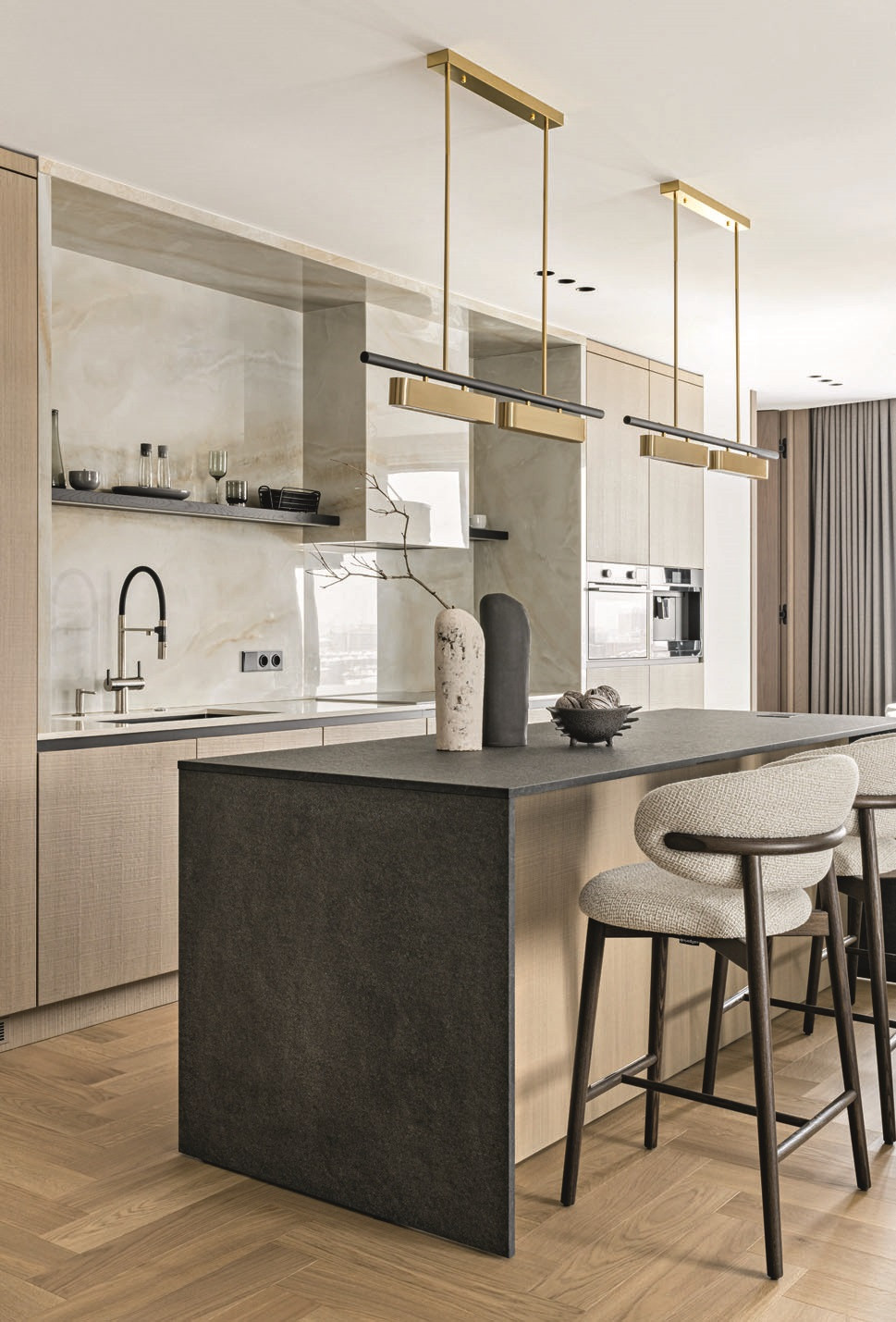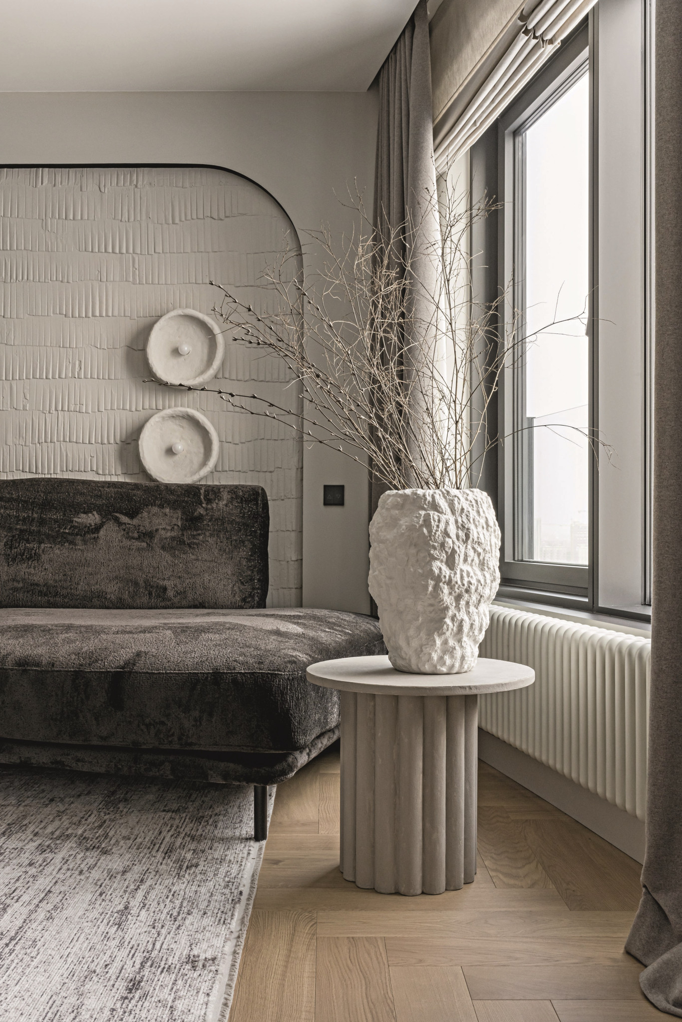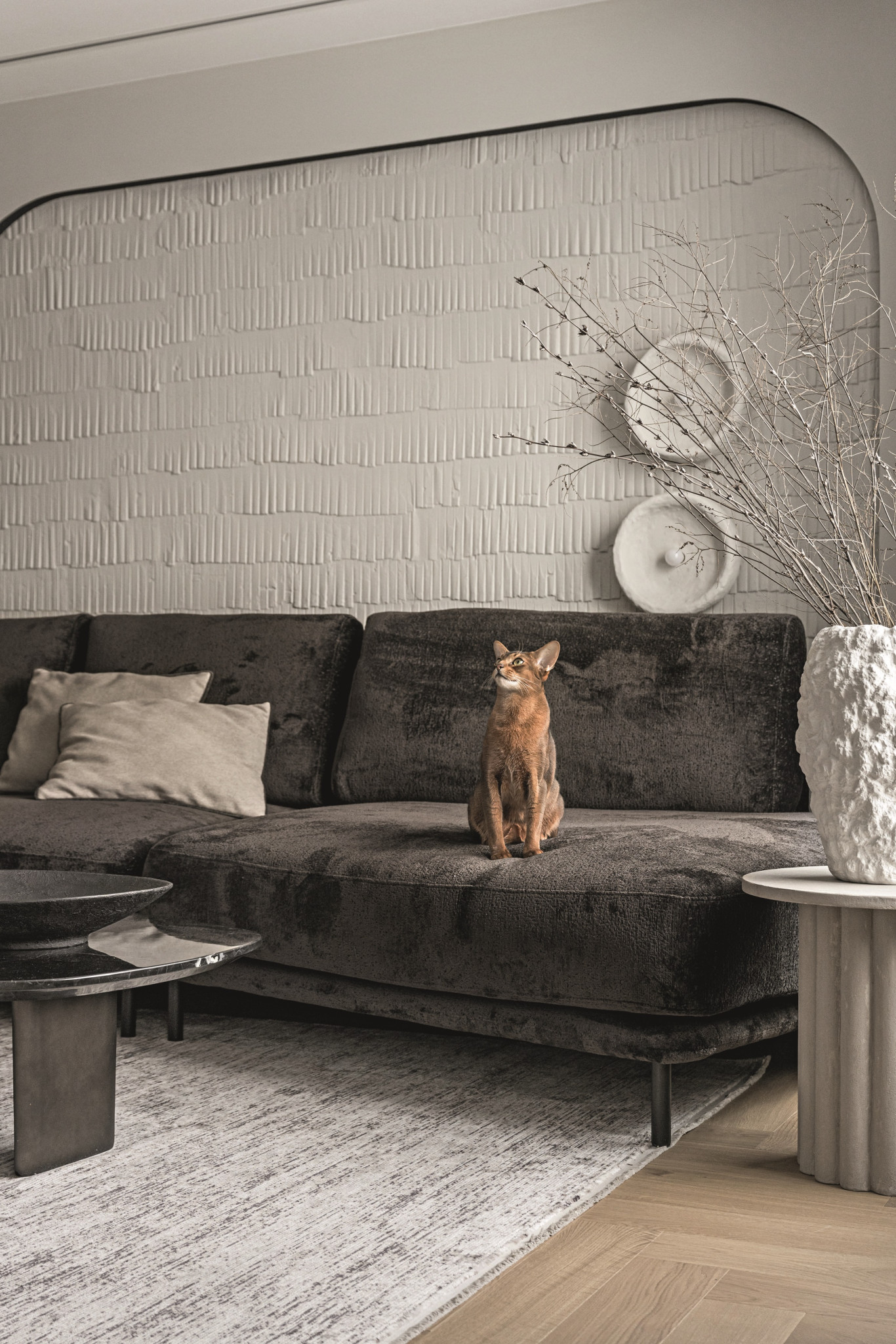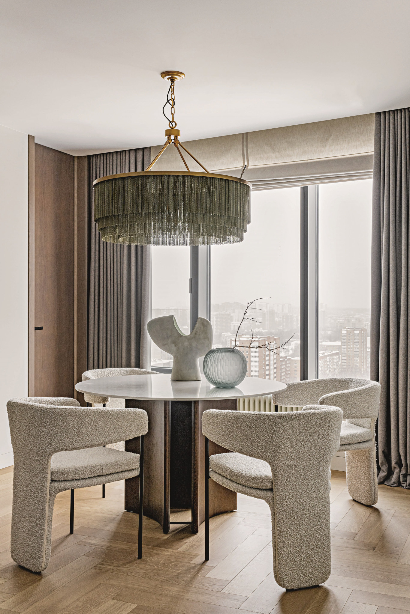 «В каждом проекте для нас важен продуманный функционал, удобство планировки и хранения. Мы всегда стремимся минимизировать площадь коридоров и оборудовать удобные пространства для стирки и глажки. Именно так получилось и в этом проекте», — рассказывает Маргарита. К зоне гостиной, которая стала сердцем дома, при мыкает комната дочери хозяйки, а также компактная постирочная и гостевой санузел. С противоположной стороны, рядом с обе денной зоной и курительной комнатой, находится вход в спальню хозяйки. Сложную форму всей квартиры формирует изо гнутая линия фасада здания, вдоль которой тянется галерея панорамных окон. Чтобы поддержать ее, в интерьере гостиной появилось декоративное панно со скругленными краями. «Главными акцентами интерьера стали объемные панно ручной работы в гостиной и в ванной комнате, — замечает Маргарита. — Природные мотивы подчеркивают идею квартиры как места для размеренного отдыха. Мы не стали выделять их цветом, чтобы сохранить общее спокойное настроение. Я очень люблю элементы ручного труда, они привлекают своей неидеальностью исполнения, выглядят слегка пожившими. Они привнесли ощущение монументальности и дали нам возможность избежать дробности». Вторят форме фасада здания и скругленные стены внутри квартиры, а также предметы мебели: масштабный обеденный стол и журнальный столик в диванной зоне. Сам диван, как и большая часть мягкой мебели, был сделан специально для этого интерьера на фабрике Cloud. Это позволило не только сделать его единственным в своем роде, но и превратить функциональный объект в визуальный якорь для интерьера. Его обивка насыщенного антрацитового оттенка перекликается с цветом натурального дерева, которым изобилует пространство: все двери, фасады шкафов и стеновые панели выполнены из шпона дуба, а полы обшиты дубовым паркетом от Coswick. Завершенность интерьеру придает текстильное оформление, которое команде Маргариты Мельниковой помогала делать компания Indigo во главе с Эльмирой Копосовой. Главным ориентиром стали натуральные оттенки и фактура природных материалов — льна и шерсти. «В оформлении окон мы стремились к чистой и свободной эстетике, поэтому отказались от использования тюля, а благодаря драпировке портьер образ интерьера получился элегантным», — подчеркивает автор проекта. В итоге городская квартира, оборудованная станциями голосовых помощников «Алиса» и оснащенная современными системами вентиляции и бытовой техники, стала идеальным пространством для отдыха. Мебель по индивидуальному проекту дизайнера в сочетании с аксессуарами и светильниками мировых брендов придала интерьеру статусность и выразительную элегантность.