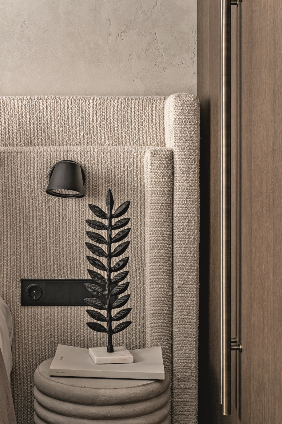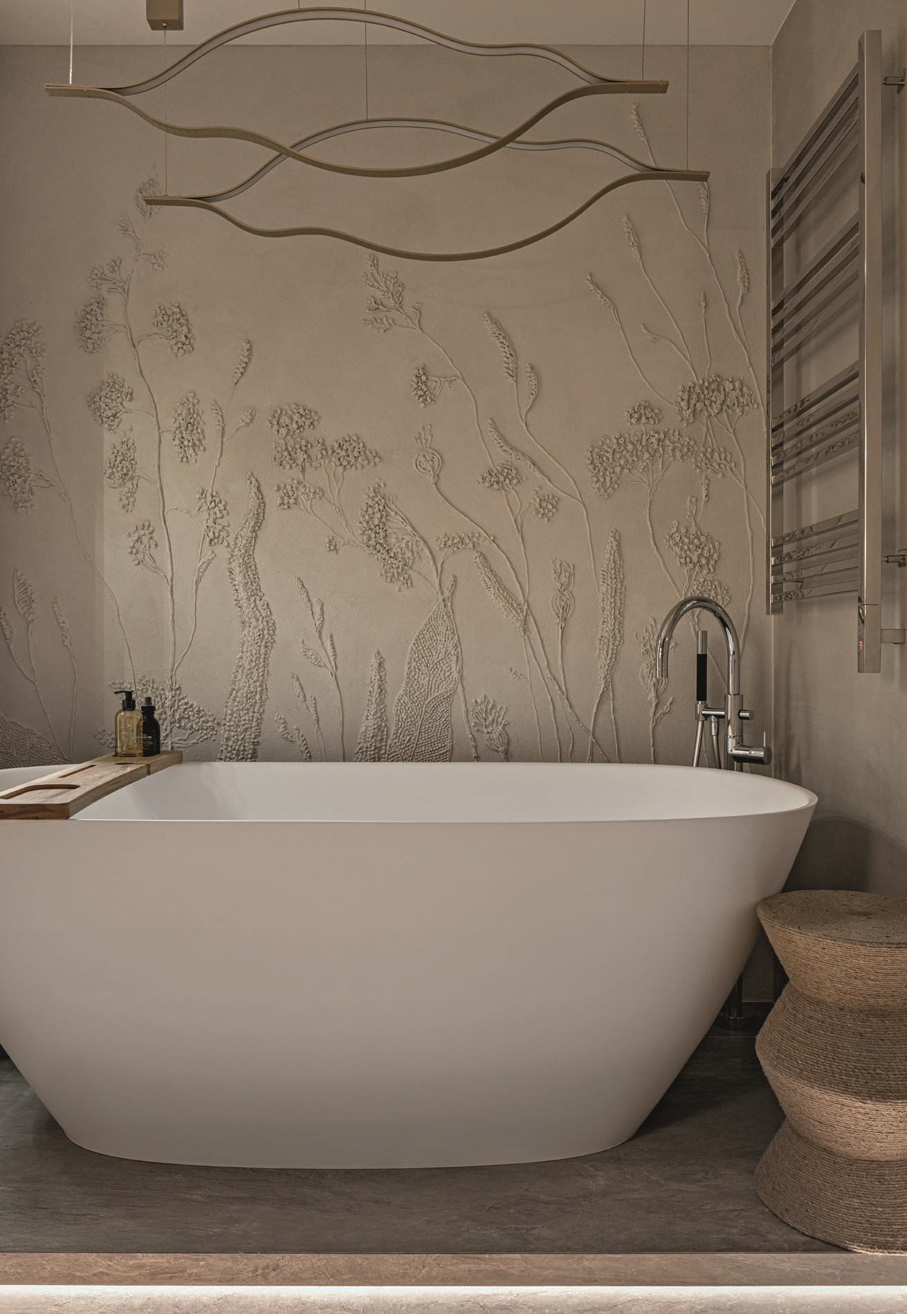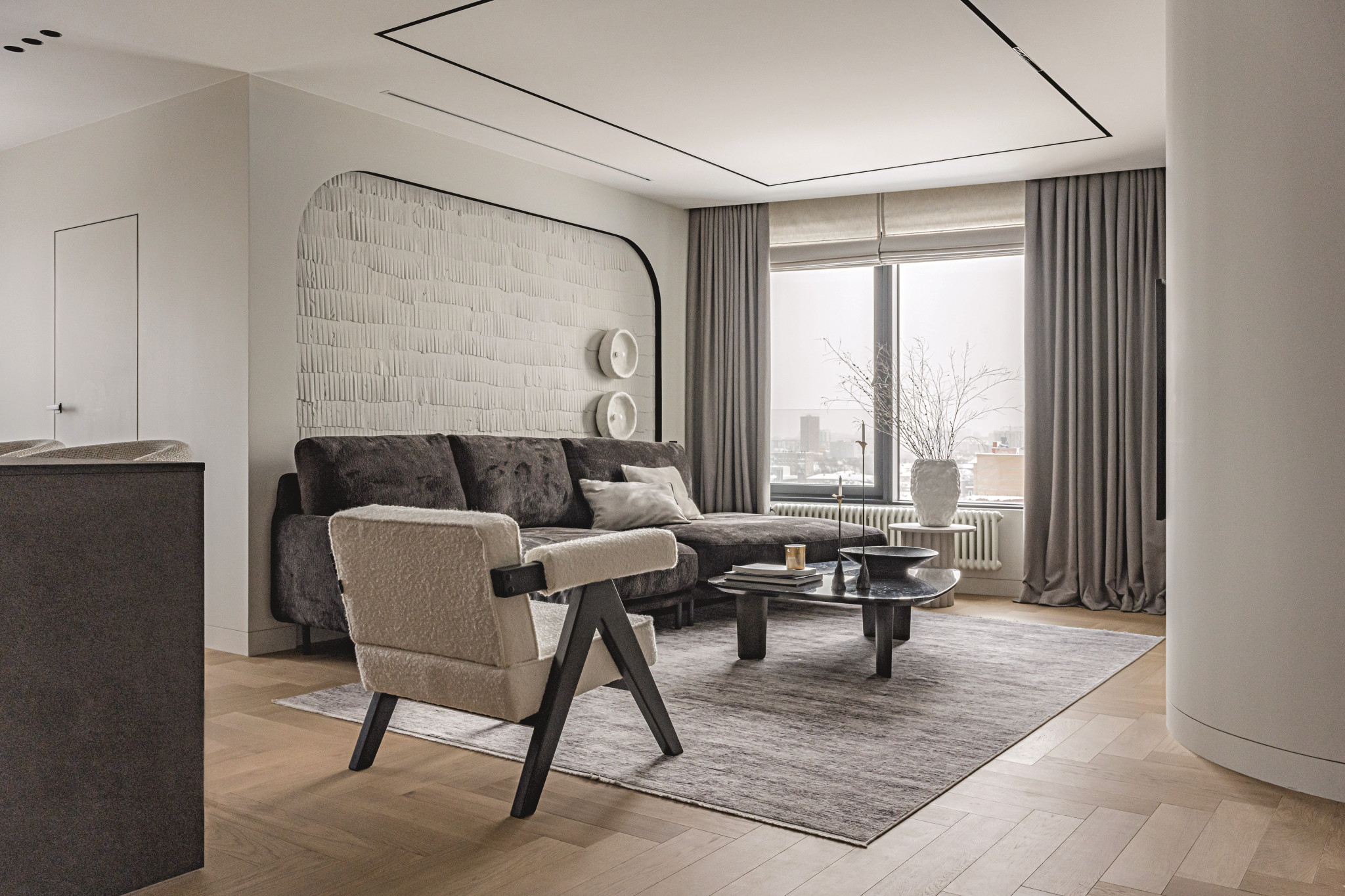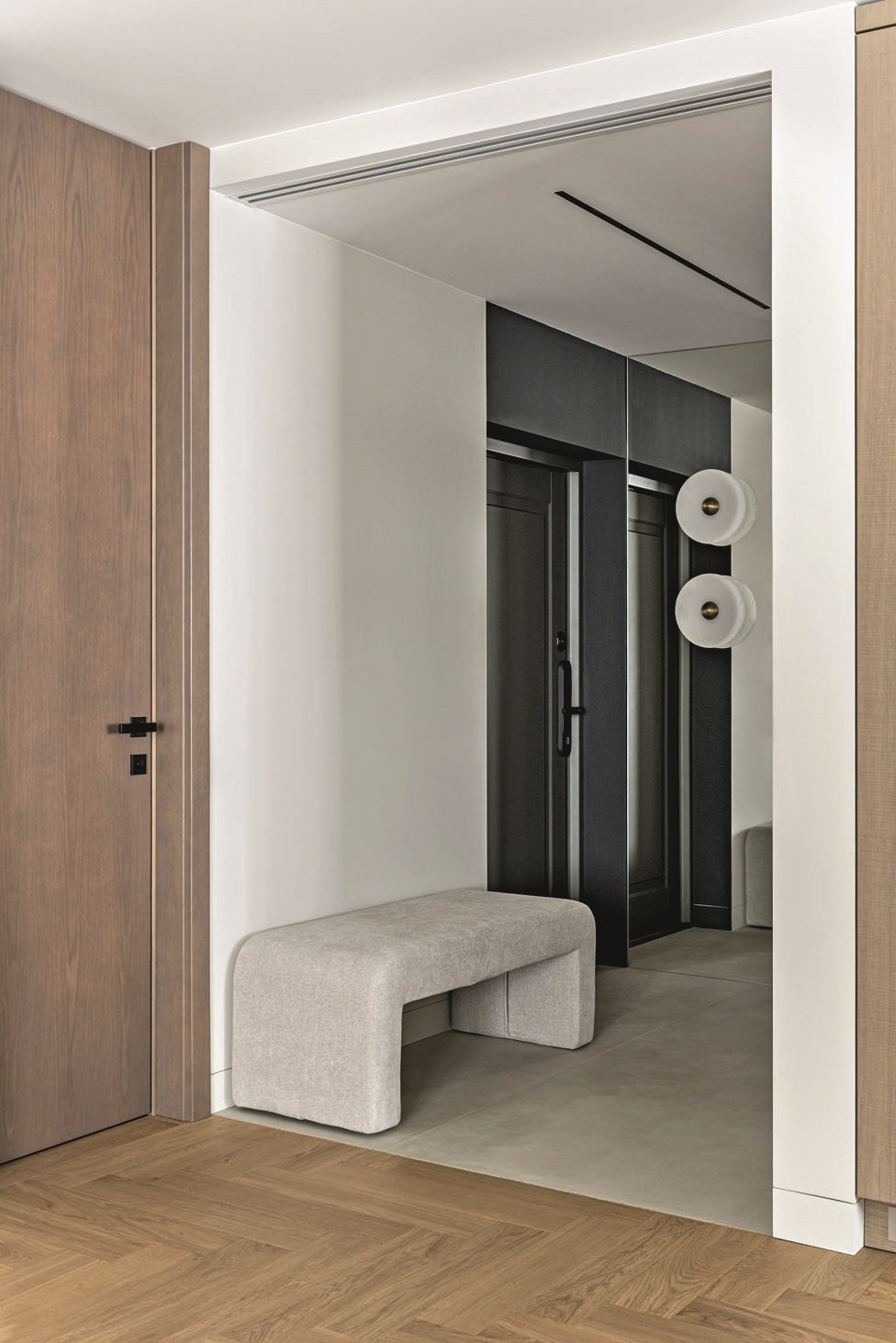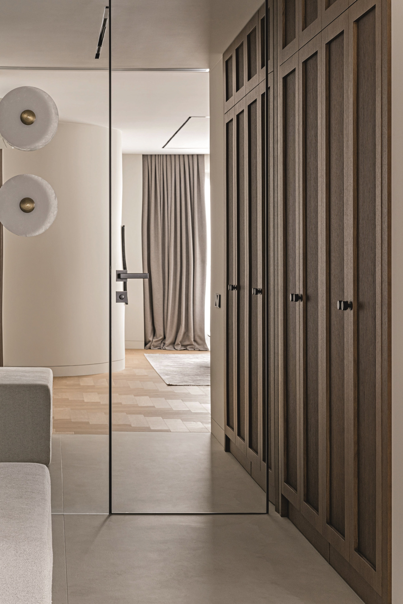 «В каждом проекте для нас важен продуманный функционал, удобство планировки и хранения. Мы всегда стремимся минимизировать площадь коридоров и оборудовать удобные пространства для стирки и глажки. Именно так получилось и в этом проекте», — рассказывает Маргарита. К зоне гостиной, которая стала сердцем дома, при мыкает комната дочери хозяйки, а также компактная постирочная и гостевой санузел. С противоположной стороны, рядом с обе денной зоной и курительной комнатой, находится вход в спальню хозяйки. Сложную форму всей квартиры формирует изо гнутая линия фасада здания, вдоль которой тянется галерея панорамных окон. Чтобы поддержать ее, в интерьере гостиной появилось декоративное панно со скругленными краями. «Главными акцентами интерьера стали объемные панно ручной работы в гостиной и в ванной комнате, — замечает Маргарита. — Природные мотивы подчеркивают идею квартиры как места для размеренного отдыха. Мы не стали выделять их цветом, чтобы сохранить общее спокойное настроение. Я очень люблю элементы ручного труда, они привлекают своей неидеальностью исполнения, выглядят слегка пожившими. Они привнесли ощущение монументальности и дали нам возможность избежать дробности». Вторят форме фасада здания и скругленные стены внутри квартиры, а также предметы мебели: масштабный обеденный стол и журнальный столик в диванной зоне. Сам диван, как и большая часть мягкой мебели, был сделан специально для этого интерьера на фабрике Cloud. Это позволило не только сделать его единственным в своем роде, но и превратить функциональный объект в визуальный якорь для интерьера. Его обивка насыщенного антрацитового оттенка перекликается с цветом натурального дерева, которым изобилует пространство: все двери, фасады шкафов и стеновые панели выполнены из шпона дуба, а полы обшиты дубовым паркетом от Coswick. Завершенность интерьеру придает текстильное оформление, которое команде Маргариты Мельниковой помогала делать компания Indigo во главе с Эльмирой Копосовой. Главным ориентиром стали натуральные оттенки и фактура природных материалов — льна и шерсти. «В оформлении окон мы стремились к чистой и свободной эстетике, поэтому отказались от использования тюля, а благодаря драпировке портьер образ интерьера получился элегантным», — подчеркивает автор проекта. В итоге городская квартира, оборудованная станциями голосовых помощников «Алиса» и оснащенная современными системами вентиляции и бытовой техники, стала идеальным пространством для отдыха. Мебель по индивидуальному проекту дизайнера в сочетании с аксессуарами и светильниками мировых брендов придала интерьеру статусность и выразительную элегантность.