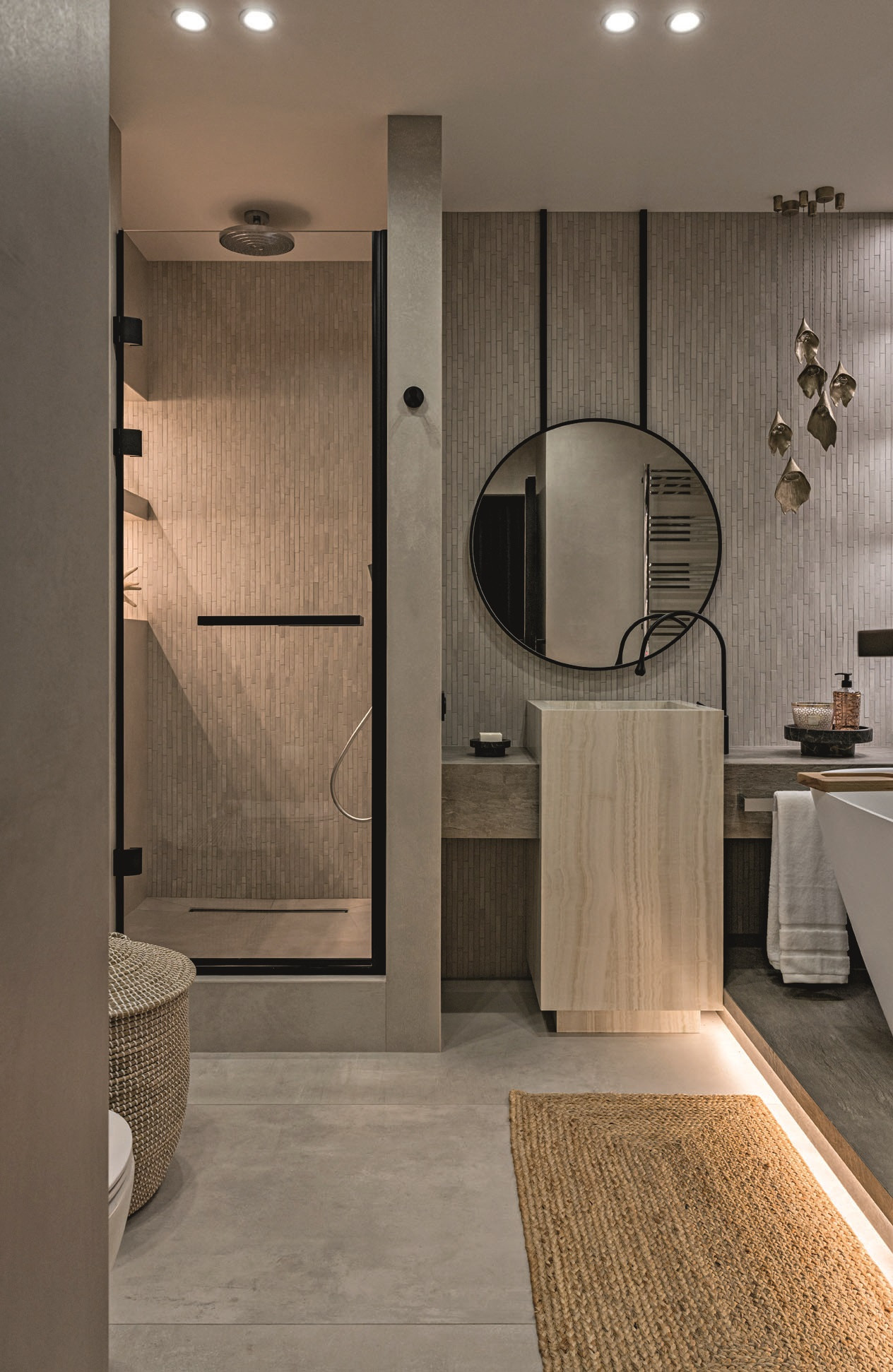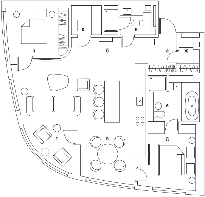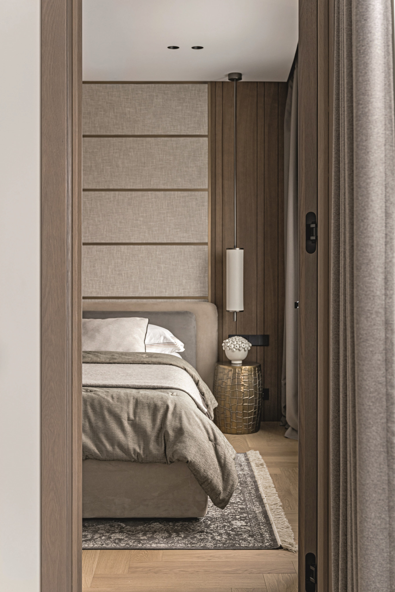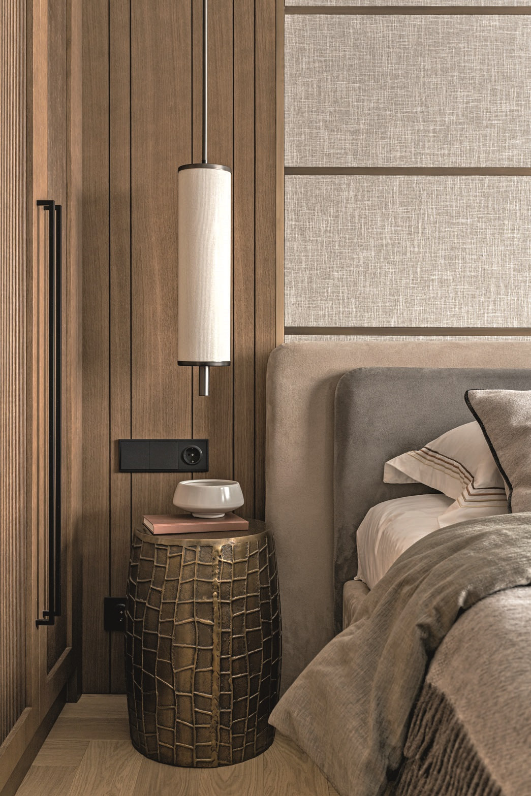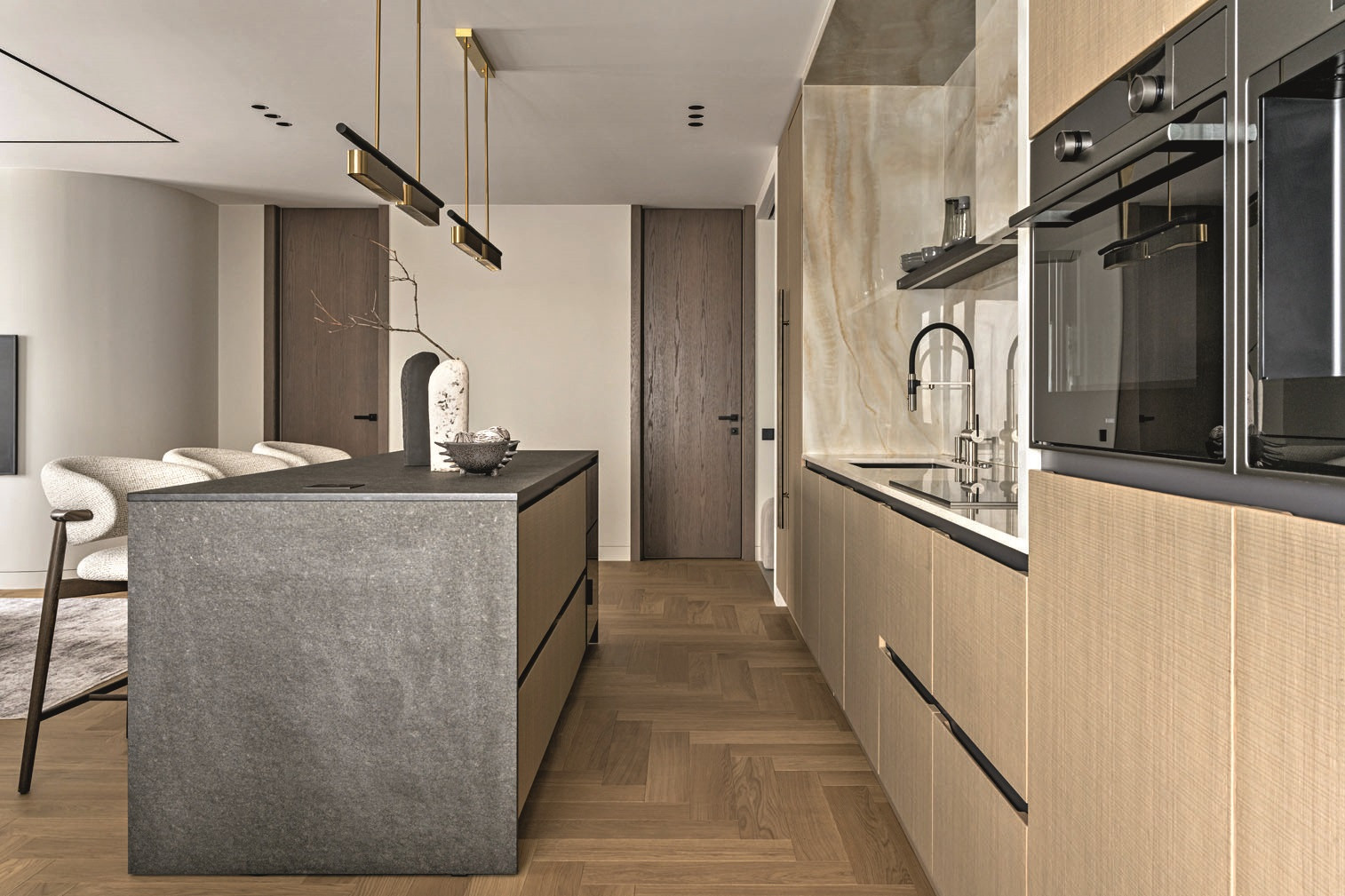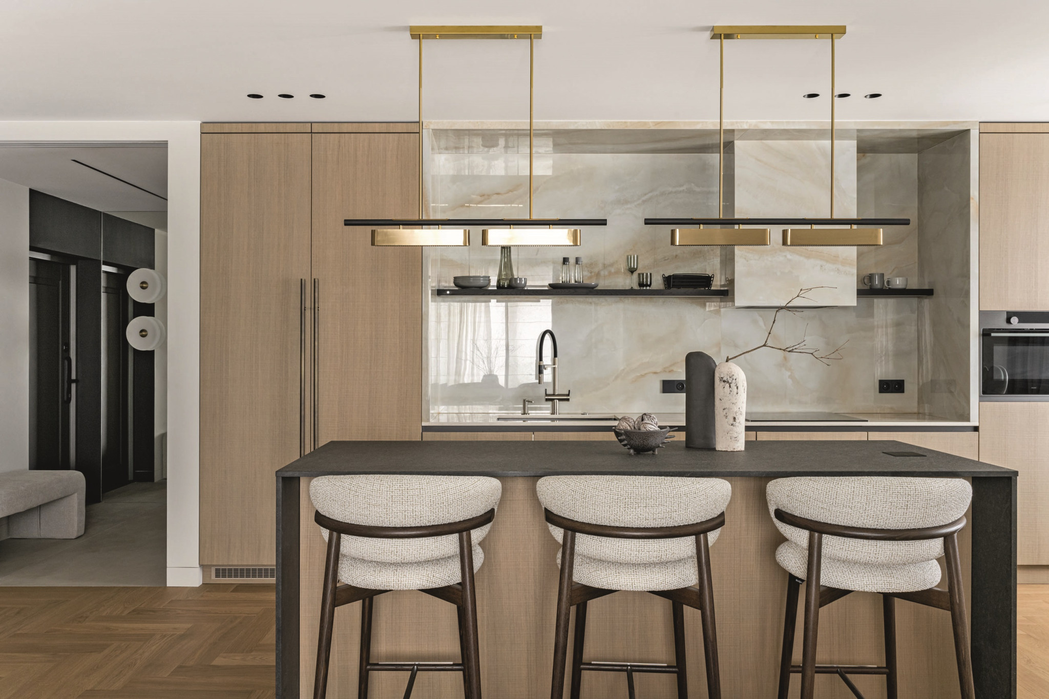 «В каждом проекте для нас важен продуманный функционал, удобство планировки и хранения. Мы всегда стремимся минимизировать площадь коридоров и оборудовать удобные пространства для стирки и глажки. Именно так получилось и в этом проекте», — рассказывает Маргарита. К зоне гостиной, которая стала сердцем дома, при мыкает комната дочери хозяйки, а также компактная постирочная и гостевой санузел. С противоположной стороны, рядом с обе денной зоной и курительной комнатой, находится вход в спальню хозяйки. Сложную форму всей квартиры формирует изо гнутая линия фасада здания, вдоль которой тянется галерея панорамных окон. Чтобы поддержать ее, в интерьере гостиной появилось декоративное панно со скругленными краями. «Главными акцентами интерьера стали объемные панно ручной работы в гостиной и в ванной комнате, — замечает Маргарита. — Природные мотивы подчеркивают идею квартиры как места для размеренного отдыха. Мы не стали выделять их цветом, чтобы сохранить общее спокойное настроение. Я очень люблю элементы ручного труда, они привлекают своей неидеальностью исполнения, выглядят слегка пожившими. Они привнесли ощущение монументальности и дали нам возможность избежать дробности». Вторят форме фасада здания и скругленные стены внутри квартиры, а также предметы мебели: масштабный обеденный стол и журнальный столик в диванной зоне. Сам диван, как и большая часть мягкой мебели, был сделан специально для этого интерьера на фабрике Cloud. Это позволило не только сделать его единственным в своем роде, но и превратить функциональный объект в визуальный якорь для интерьера. Его обивка насыщенного антрацитового оттенка перекликается с цветом натурального дерева, которым изобилует пространство: все двери, фасады шкафов и стеновые панели выполнены из шпона дуба, а полы обшиты дубовым паркетом от Coswick. Завершенность интерьеру придает текстильное оформление, которое команде Маргариты Мельниковой помогала делать компания Indigo во главе с Эльмирой Копосовой. Главным ориентиром стали натуральные оттенки и фактура природных материалов — льна и шерсти. «В оформлении окон мы стремились к чистой и свободной эстетике, поэтому отказались от использования тюля, а благодаря драпировке портьер образ интерьера получился элегантным», — подчеркивает автор проекта. В итоге городская квартира, оборудованная станциями голосовых помощников «Алиса» и оснащенная современными системами вентиляции и бытовой техники, стала идеальным пространством для отдыха. Мебель по индивидуальному проекту дизайнера в сочетании с аксессуарами и светильниками мировых брендов придала интерьеру статусность и выразительную элегантность.