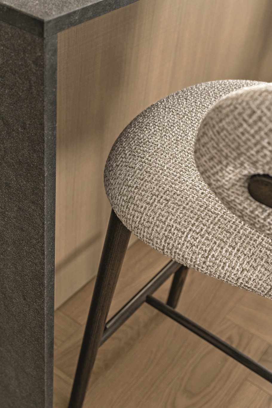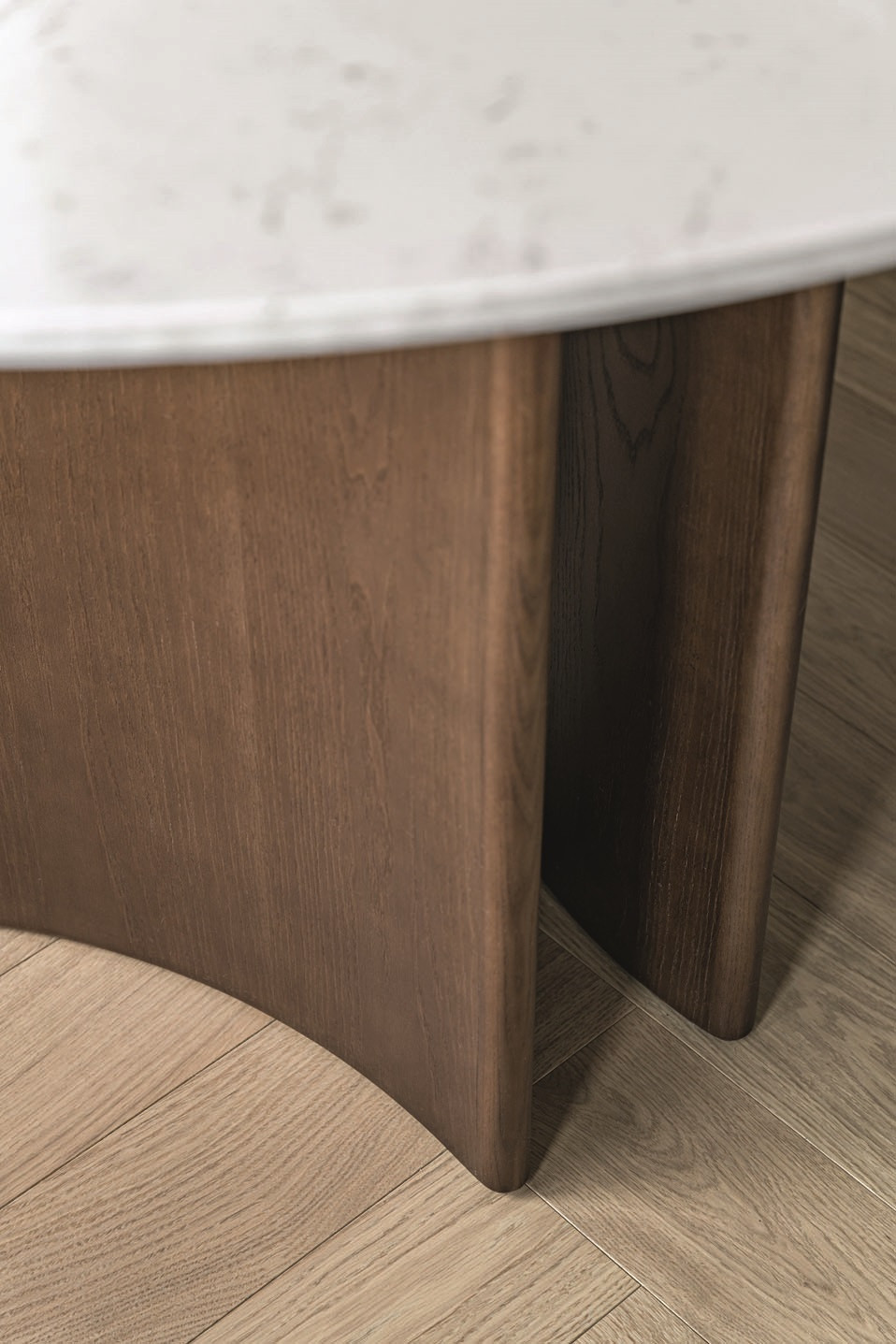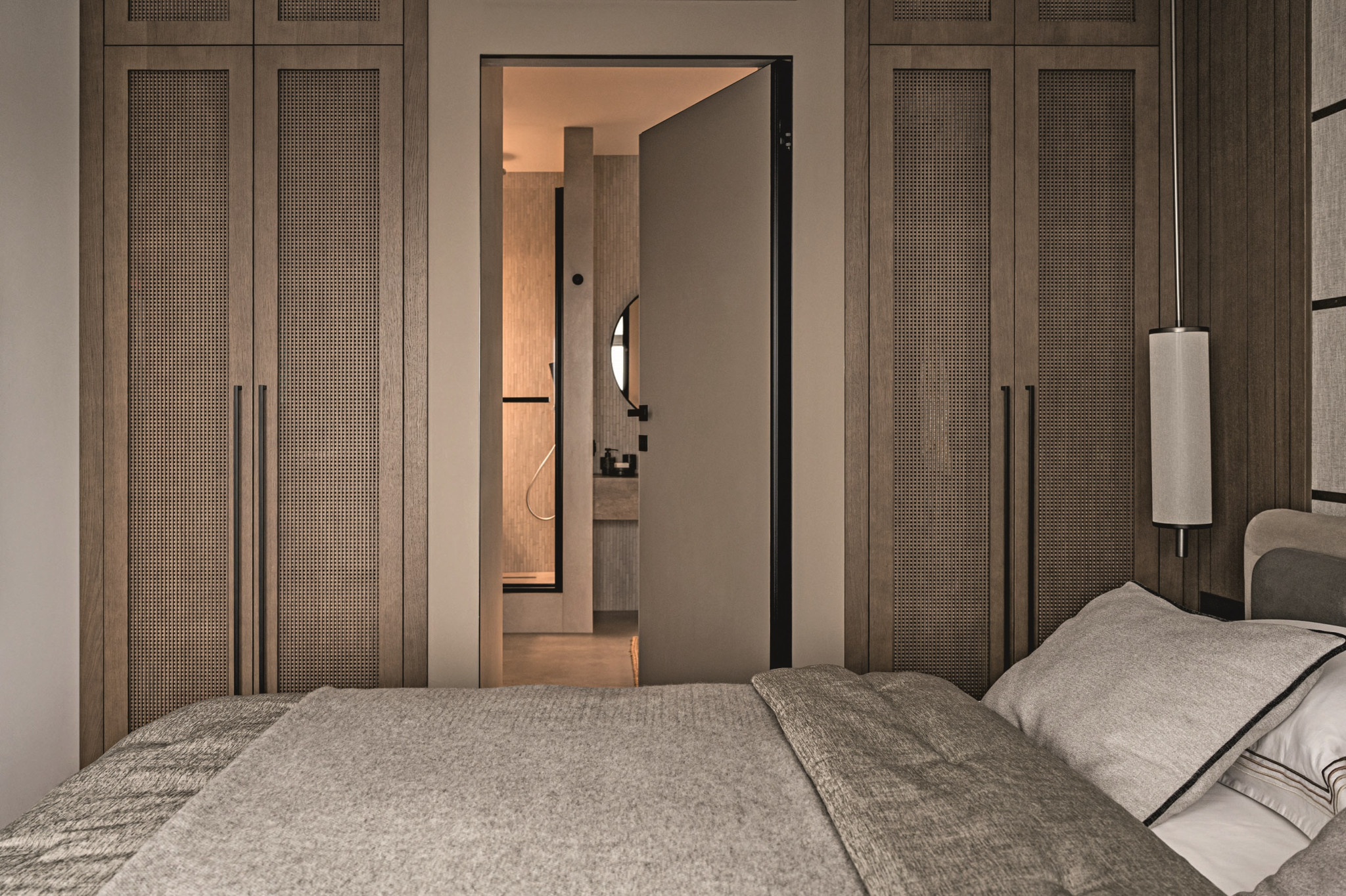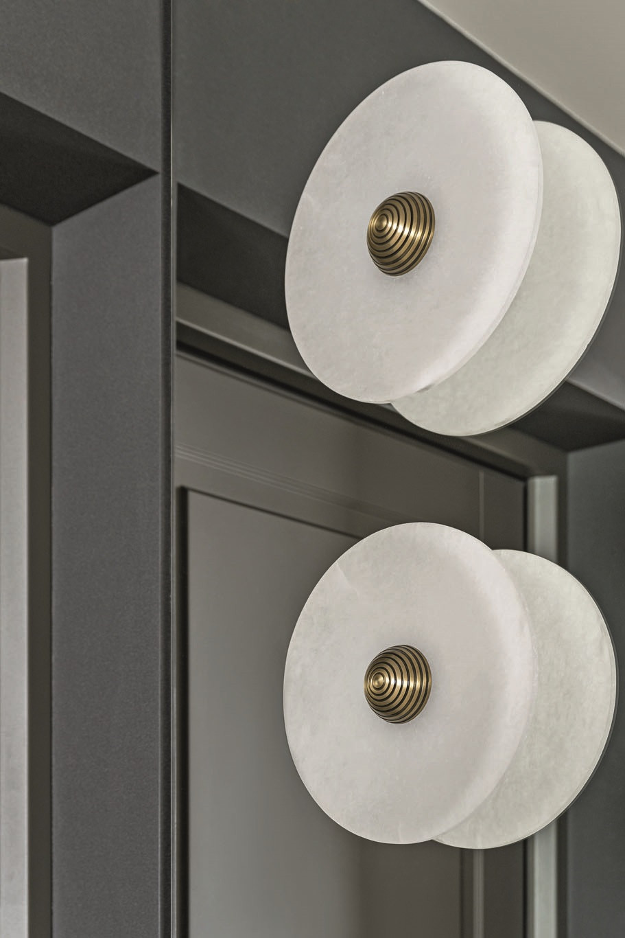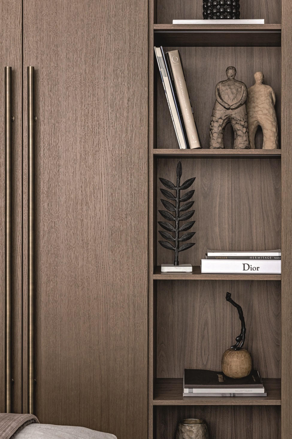 «В каждом проекте для нас важен продуманный функционал, удобство планировки и хранения. Мы всегда стремимся минимизировать площадь коридоров и оборудовать удобные пространства для стирки и глажки. Именно так получилось и в этом проекте», — рассказывает Маргарита. К зоне гостиной, которая стала сердцем дома, при мыкает комната дочери хозяйки, а также компактная постирочная и гостевой санузел. С противоположной стороны, рядом с обе денной зоной и курительной комнатой, находится вход в спальню хозяйки. Сложную форму всей квартиры формирует изо гнутая линия фасада здания, вдоль которой тянется галерея панорамных окон. Чтобы поддержать ее, в интерьере гостиной появилось декоративное панно со скругленными краями. «Главными акцентами интерьера стали объемные панно ручной работы в гостиной и в ванной комнате, — замечает Маргарита. — Природные мотивы подчеркивают идею квартиры как места для размеренного отдыха. Мы не стали выделять их цветом, чтобы сохранить общее спокойное настроение. Я очень люблю элементы ручного труда, они привлекают своей неидеальностью исполнения, выглядят слегка пожившими. Они привнесли ощущение монументальности и дали нам возможность избежать дробности». Вторят форме фасада здания и скругленные стены внутри квартиры, а также предметы мебели: масштабный обеденный стол и журнальный столик в диванной зоне. Сам диван, как и большая часть мягкой мебели, был сделан специально для этого интерьера на фабрике Cloud. Это позволило не только сделать его единственным в своем роде, но и превратить функциональный объект в визуальный якорь для интерьера. Его обивка насыщенного антрацитового оттенка перекликается с цветом натурального дерева, которым изобилует пространство: все двери, фасады шкафов и стеновые панели выполнены из шпона дуба, а полы обшиты дубовым паркетом от Coswick. Завершенность интерьеру придает текстильное оформление, которое команде Маргариты Мельниковой помогала делать компания Indigo во главе с Эльмирой Копосовой. Главным ориентиром стали натуральные оттенки и фактура природных материалов — льна и шерсти. «В оформлении окон мы стремились к чистой и свободной эстетике, поэтому отказались от использования тюля, а благодаря драпировке портьер образ интерьера получился элегантным», — подчеркивает автор проекта. В итоге городская квартира, оборудованная станциями голосовых помощников «Алиса» и оснащенная современными системами вентиляции и бытовой техники, стала идеальным пространством для отдыха. Мебель по индивидуальному проекту дизайнера в сочетании с аксессуарами и светильниками мировых брендов придала интерьеру статусность и выразительную элегантность.