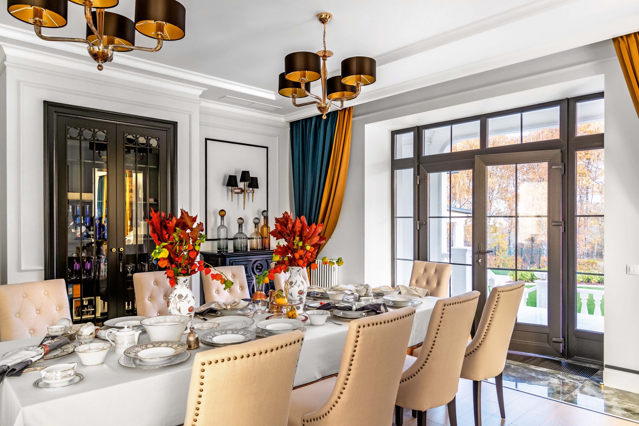 Парадная столовая. Заказчики любят принимать гостей и собираться большой компанией за общим столом. Планировка столовой с застеклёнными дверями и естественным освещением создаёт приподнятую атмосферу и располагает к приятной беседе. Комод, бра, Eichholtz. Люстра, Heathfield&Co. Встроенный шкаф выполнен по эскизам дизайнера