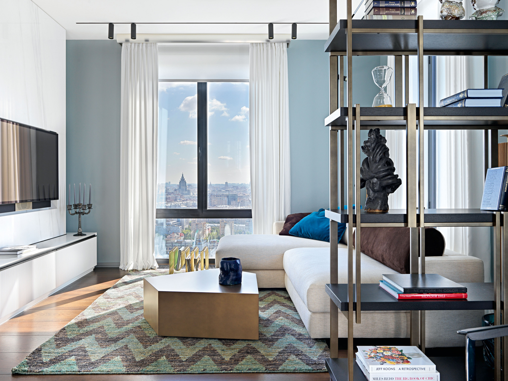 Интерьер этой небольшой квартиры завораживает видами из окон, вдохновляет визуальной лёгкостью лаконичных решений, впечатляет модными марками мебели и небесными оттенками в цветовой палитре