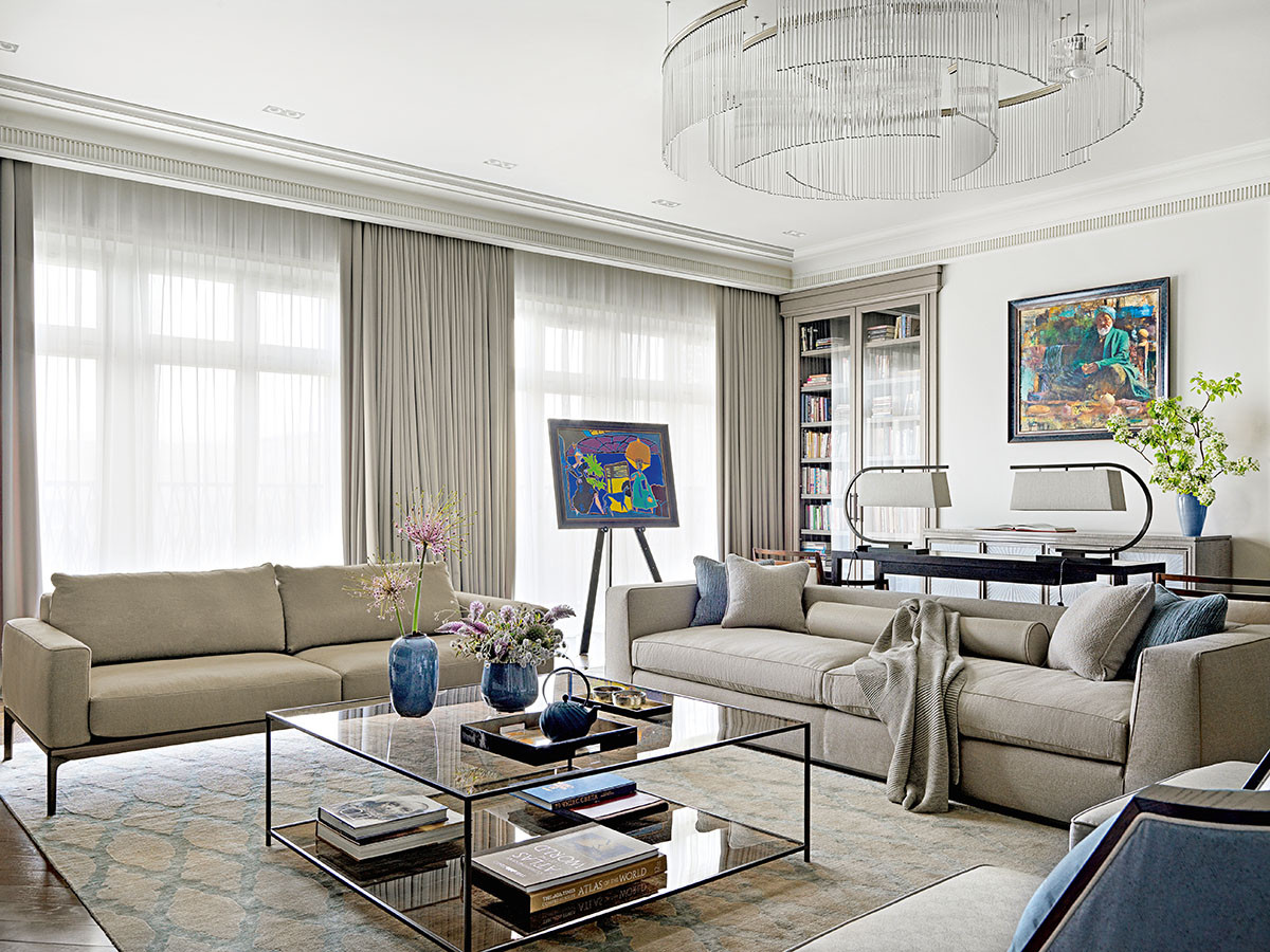 Интерьеры Олега и Анны, не классические и не современные, не перегруженные и не минималистичные, полны настоящей элегантной утончённости. И те, кто её уже вкусил, возвращаются к ним вновь и вновь. Заказчики этого деликатного, почти монохромного интерьера — семья с тремя детьми — знакомы с бюро Олега Клодта уже более четырнадцати лет, и это не первый их совместный проект. Купив три квартиры на одном этаже в современном доме на Фрунзенской набережной и объединив их одну большую, они обратились к Олегу и Анне за их фирменным дизайном, а главное — за продуманной и максимально удобной из возможных планировкой.