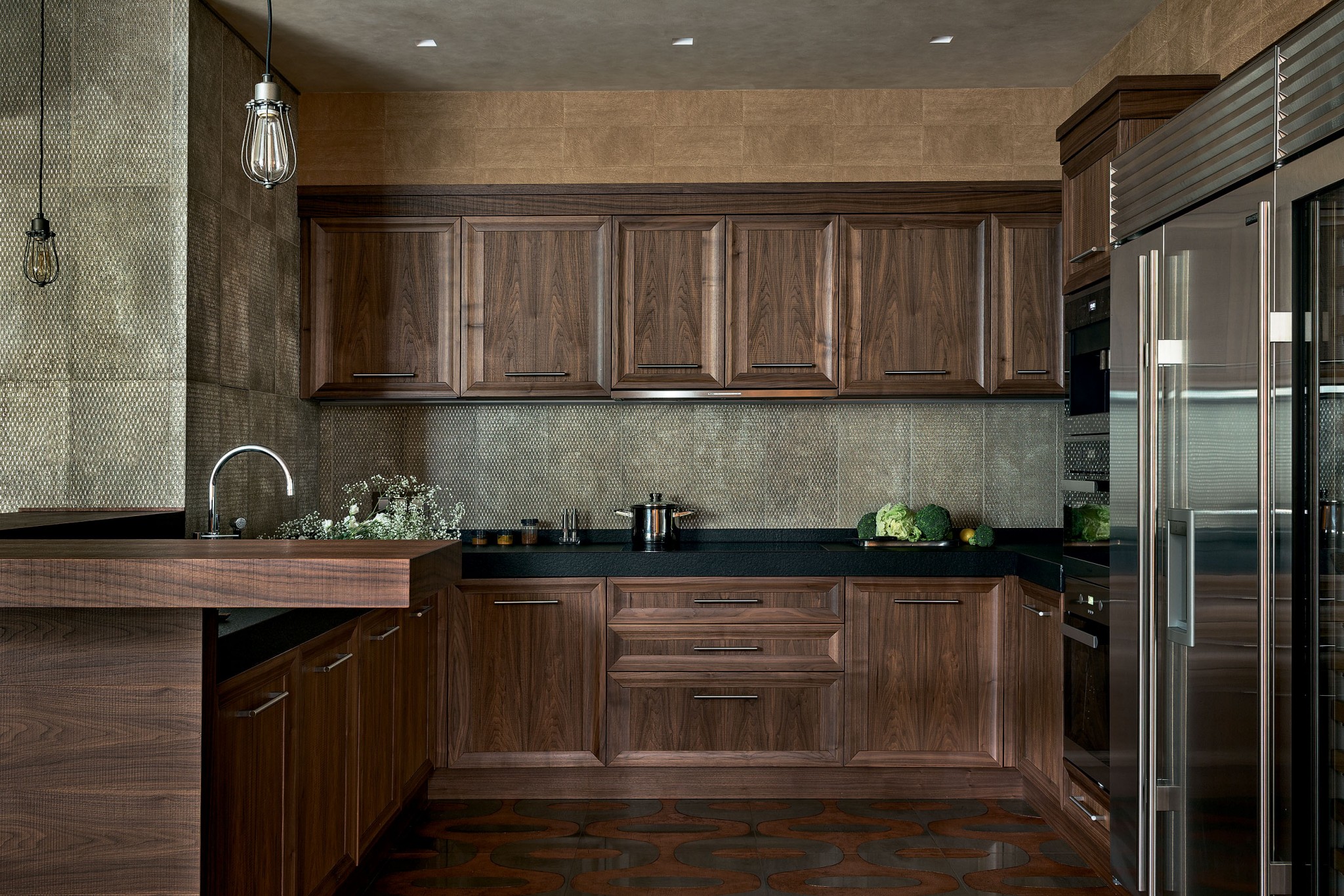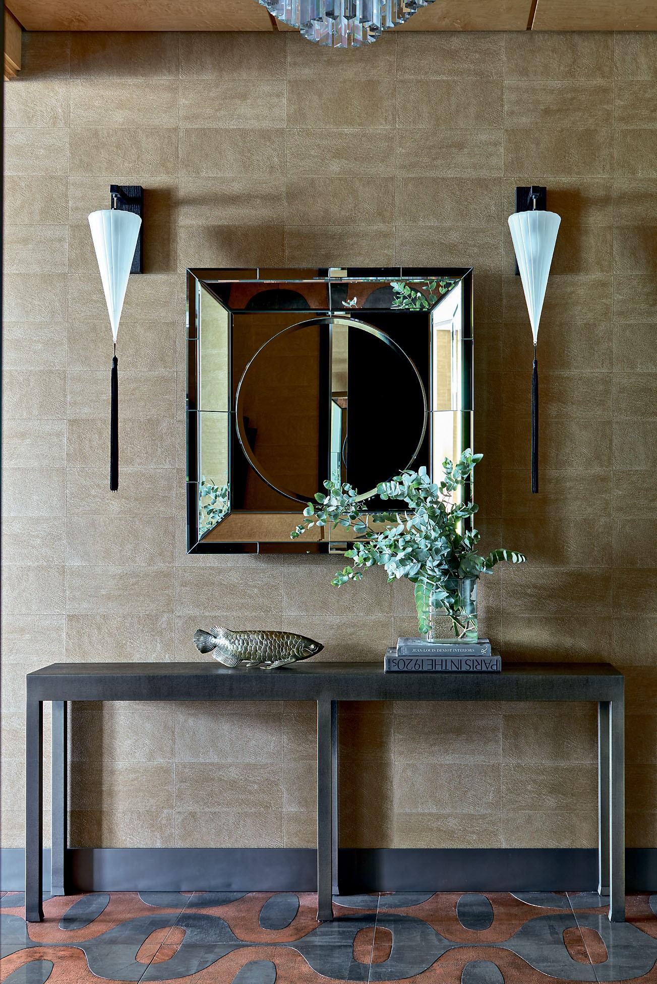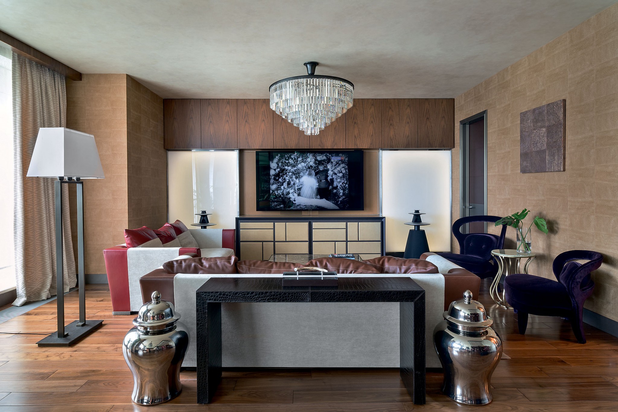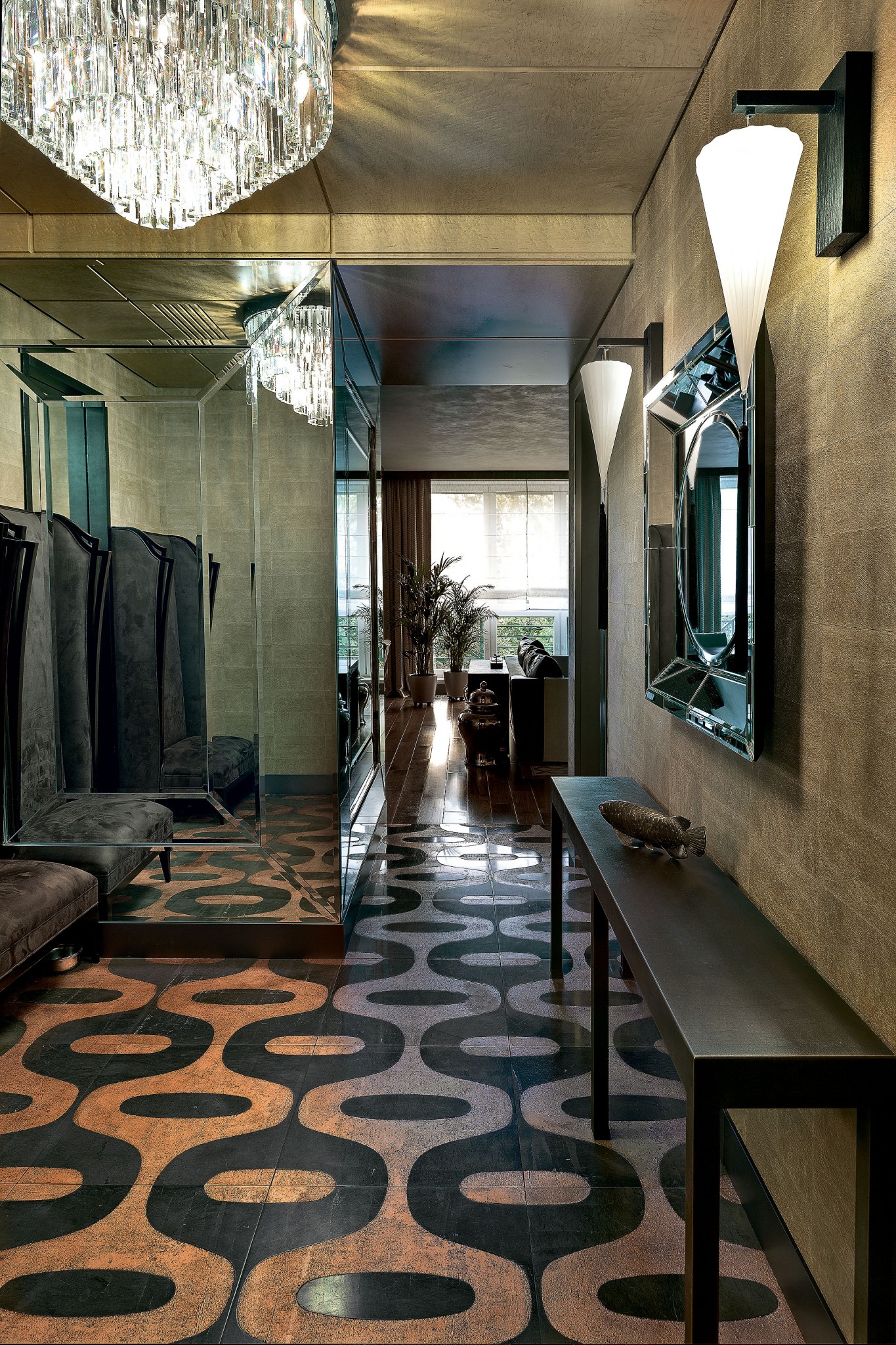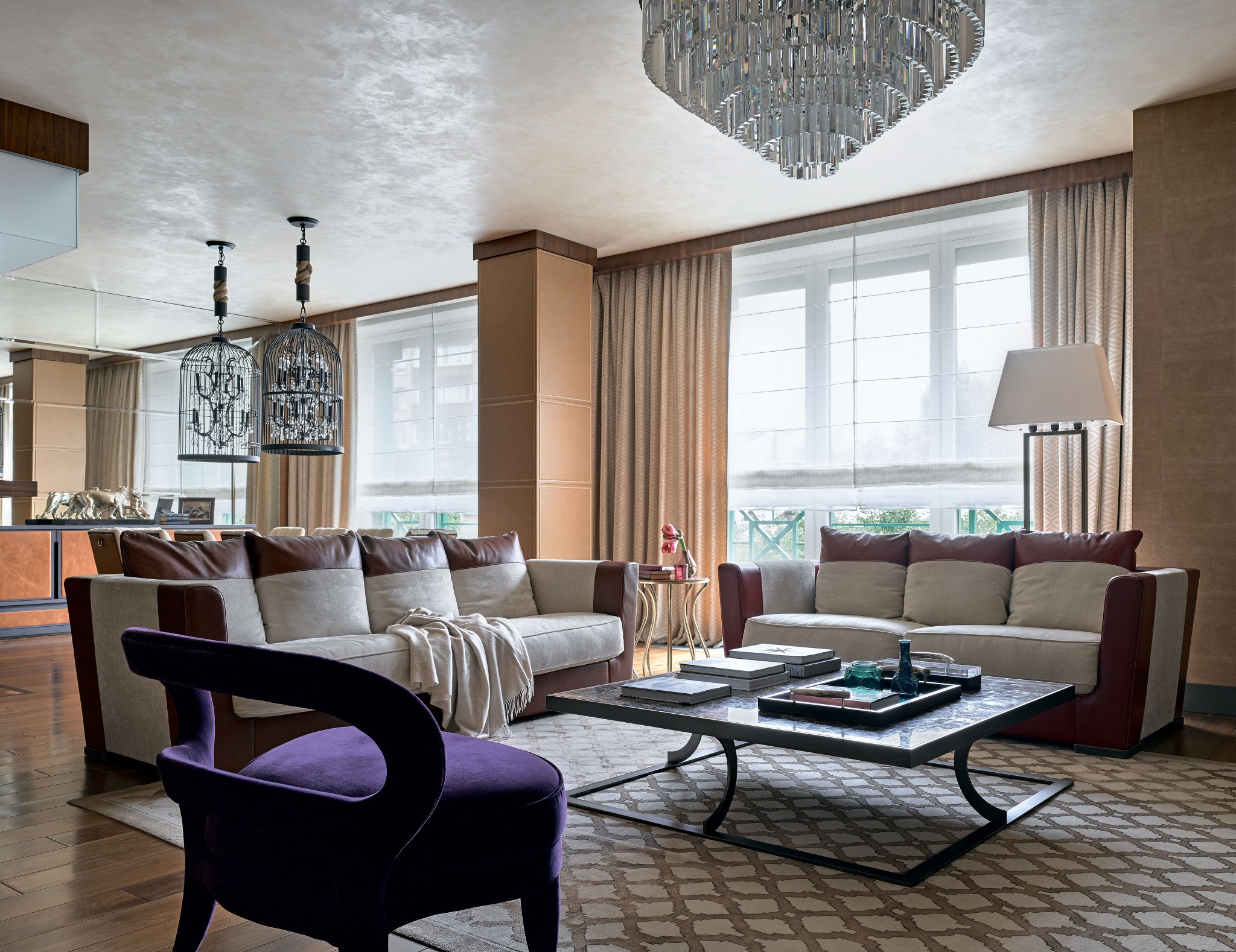 Заказчики, молодая семейная пара с двумя детьми, просили, чтобы интерьер их квартиры, расположенной в новом доме в центре Москвы, был решён в эффектном современном стиле. «Когда нам заказывают современный стиль, мы ищем какую‑то отдушину, на чём поиграть, чтобы не было скучно», — рассказывают авторы проекта Мария и Никита Бахаревы. Узнав, что хозяева квартиры ведут активный образ жизни и много путешествуют, архитекторы решили обыграть в оформлении этнические мотивы, привнести в современную стилистику лёгкие колониальные акценты. Основную роль здесь играют материалы с ярко выраженной фактурой: это и кожа, которой обтянуты двери современного дизайна, и панели «под замшу», которыми отделаны потолки, и текстурные обои в спальне и в гостиной, и тёплый бронзовый металл светильников, и кожаные панели на стенах прихожей. Цветовая гамма — тёплая, шоколадно-бронзовая — создаёт традиционную для этники атмосферу.