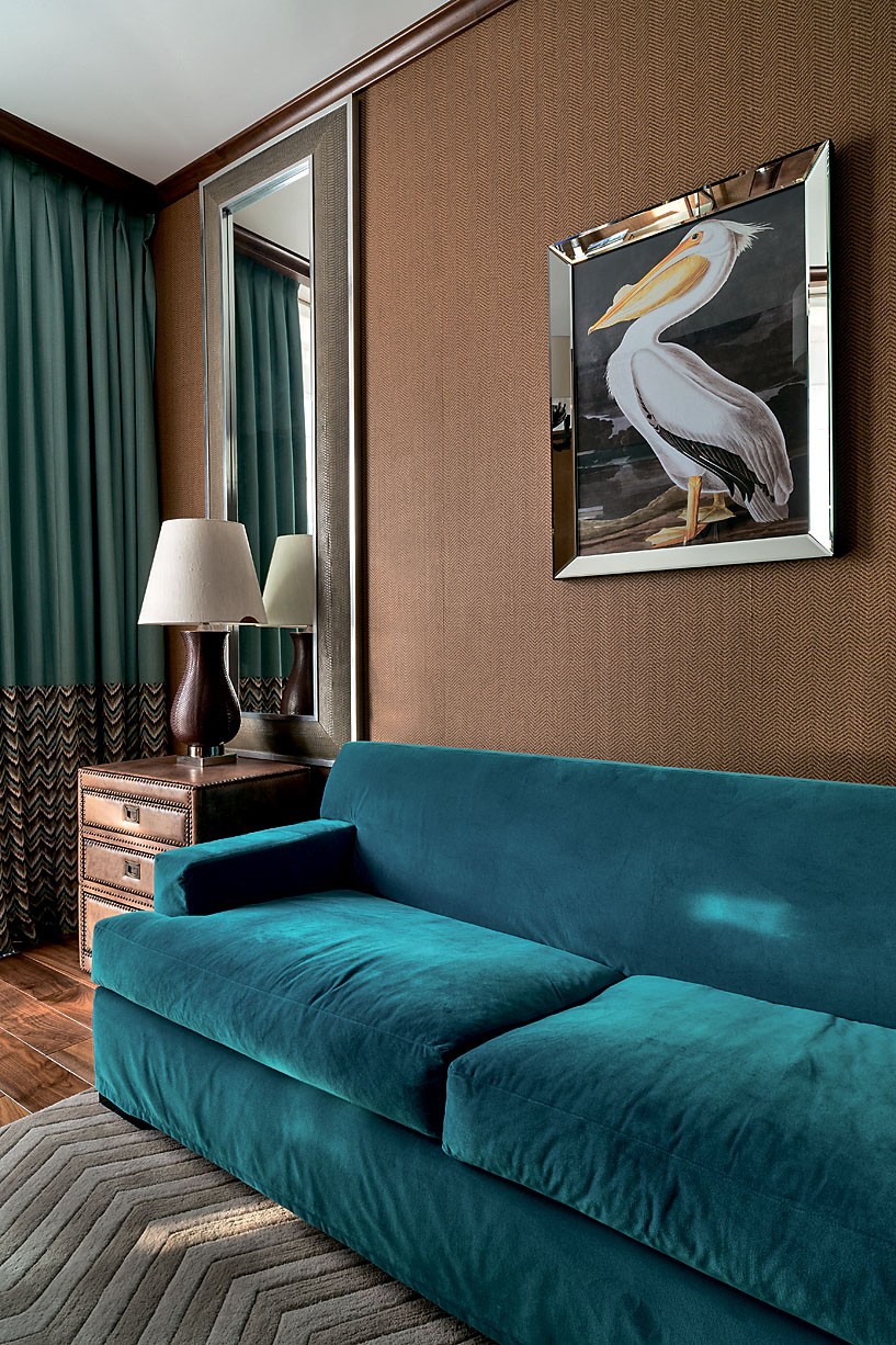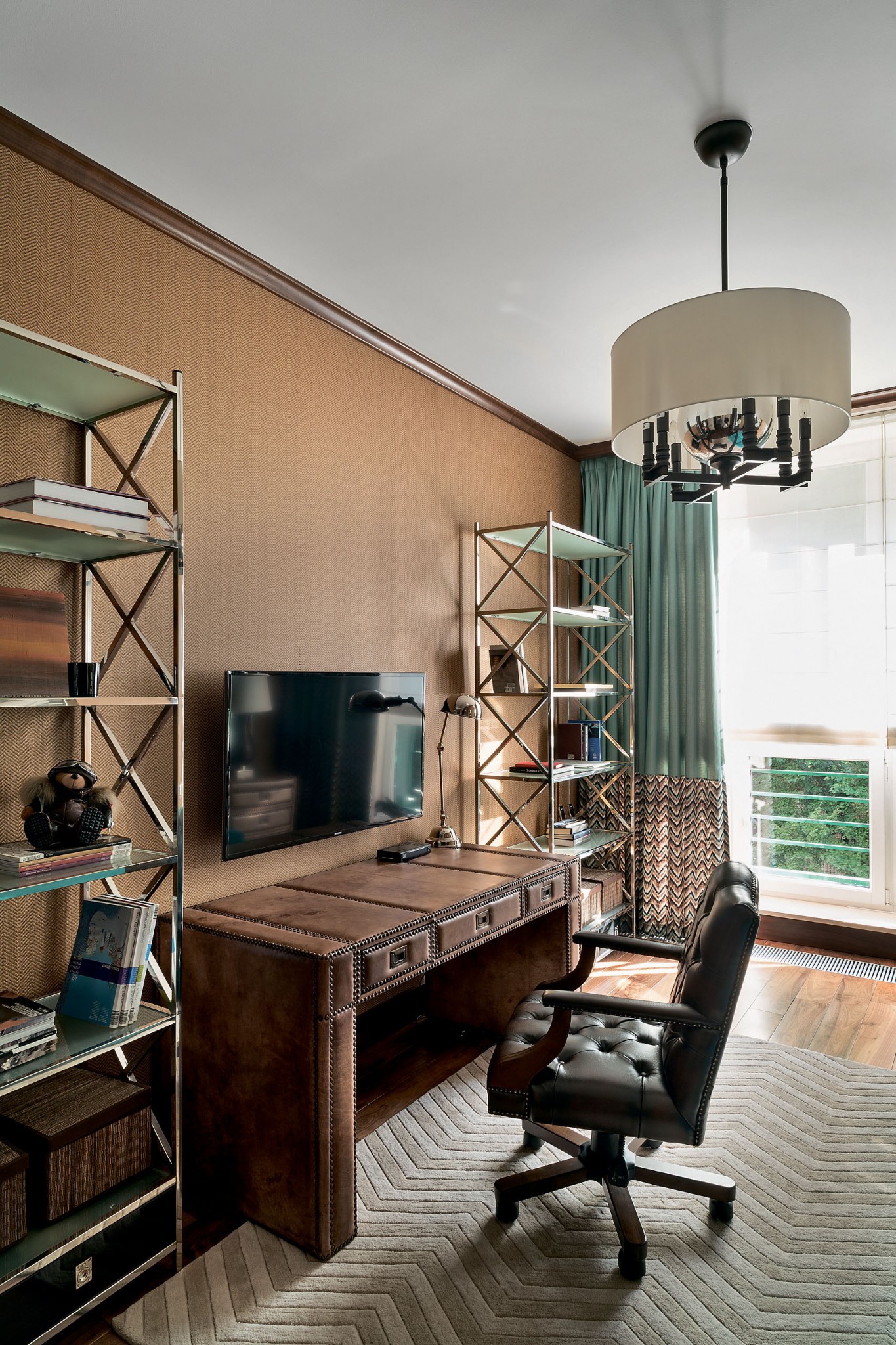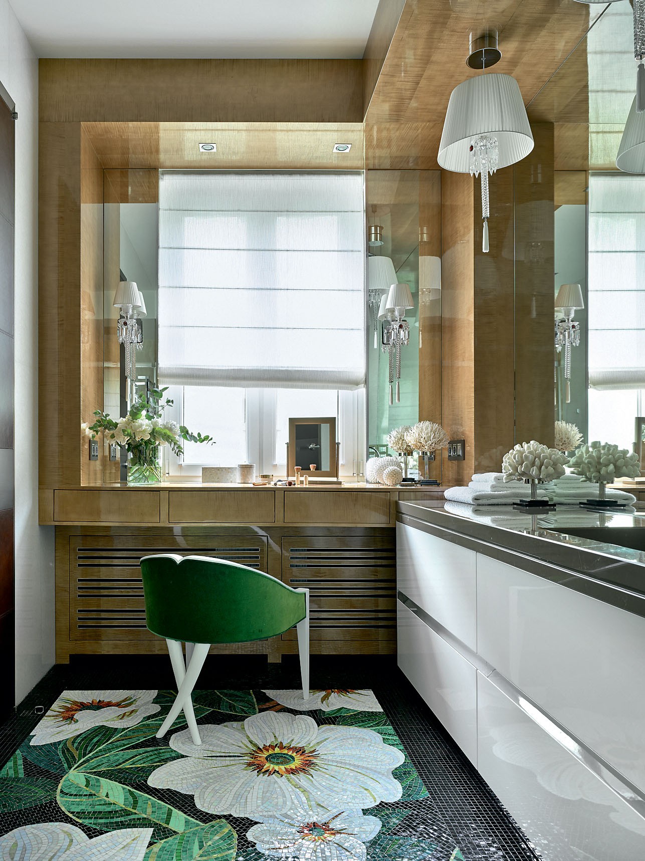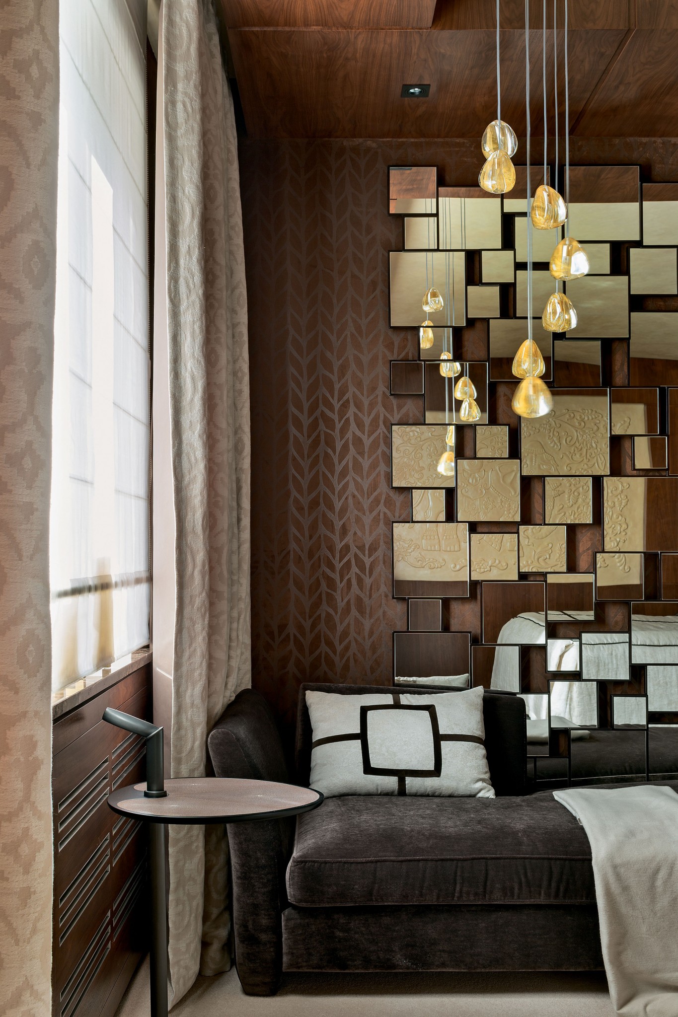 Среди других помещений квартиры особенно выделяется хозяйская спальня. «Я очень люблю, когда заказчики разрешают сделать тёмную спальню. Тёмная, бархатисто–шоколадная среда мне представляется очень расслабляющей, деликатной, здесь не нужны яркий свет и яркие акценты», — рассказывает Мария Бахарева. Детские комнаты в квартире получили нарядное, «ар-декошное», по выражению авторов проекта, оформление. В кабинете царит строгая деловая атмосфера: стол, обитый кожей, простые стеллажи и удобное кресло. Хозяйская ванная получилась очень женственной благодаря туалетному столику с ящичками, расположенному у окна и выполненному на заказ. Здесь вообще много авторских решений, интерьер, можно сказать, tailor-made — индивидуальный. Все столярные изделия, часть мебели, необычные фактуры в отделках — всё придумано и разработано авторами проекта специально для объекта.
