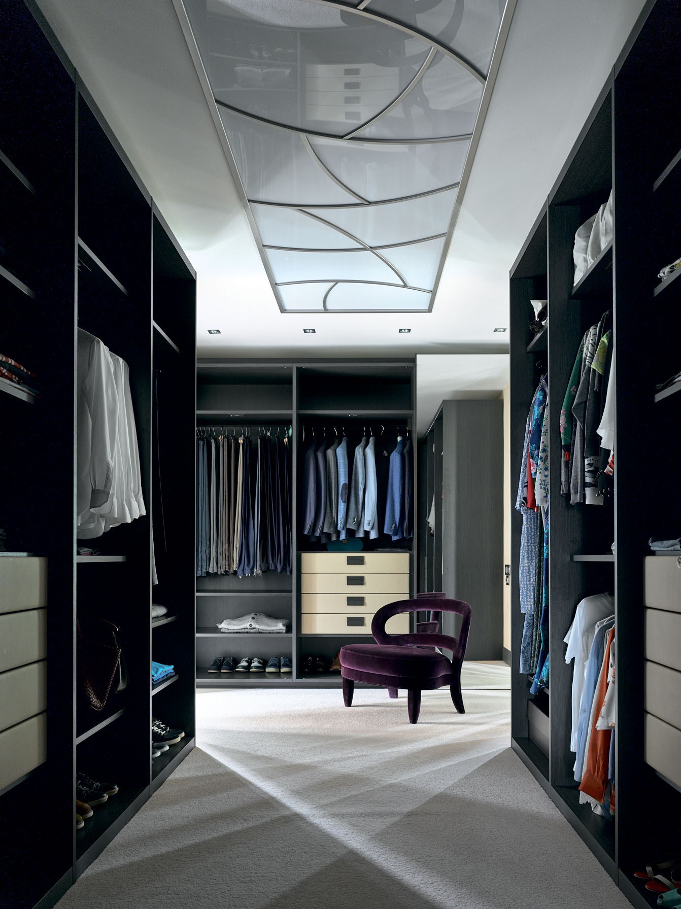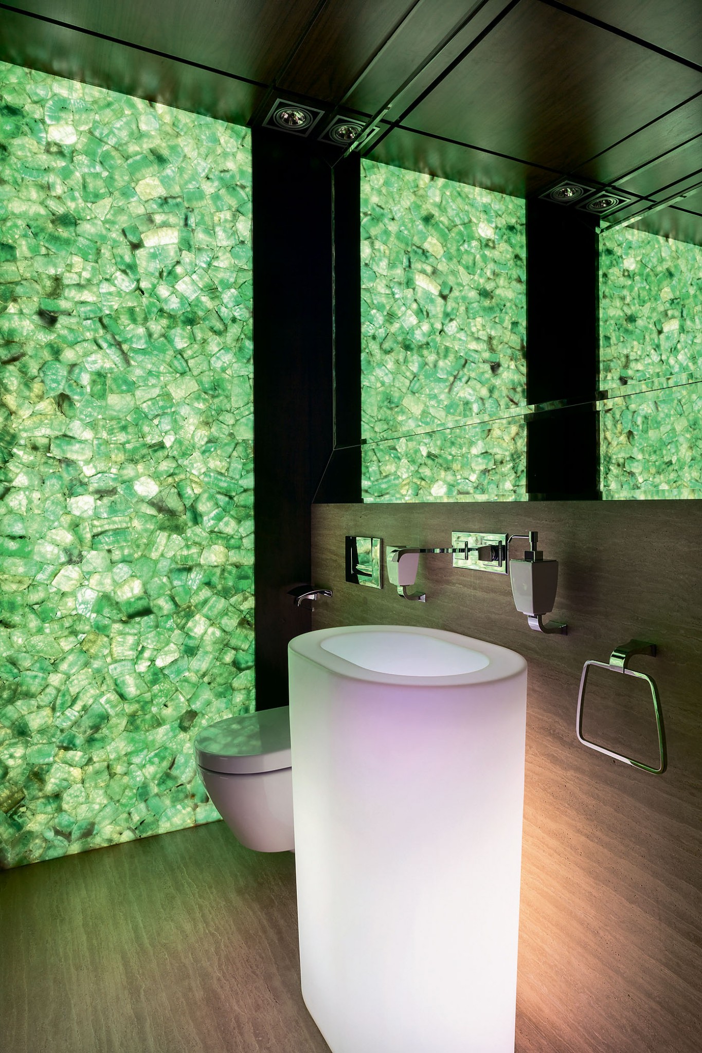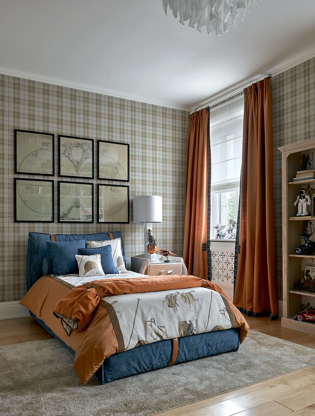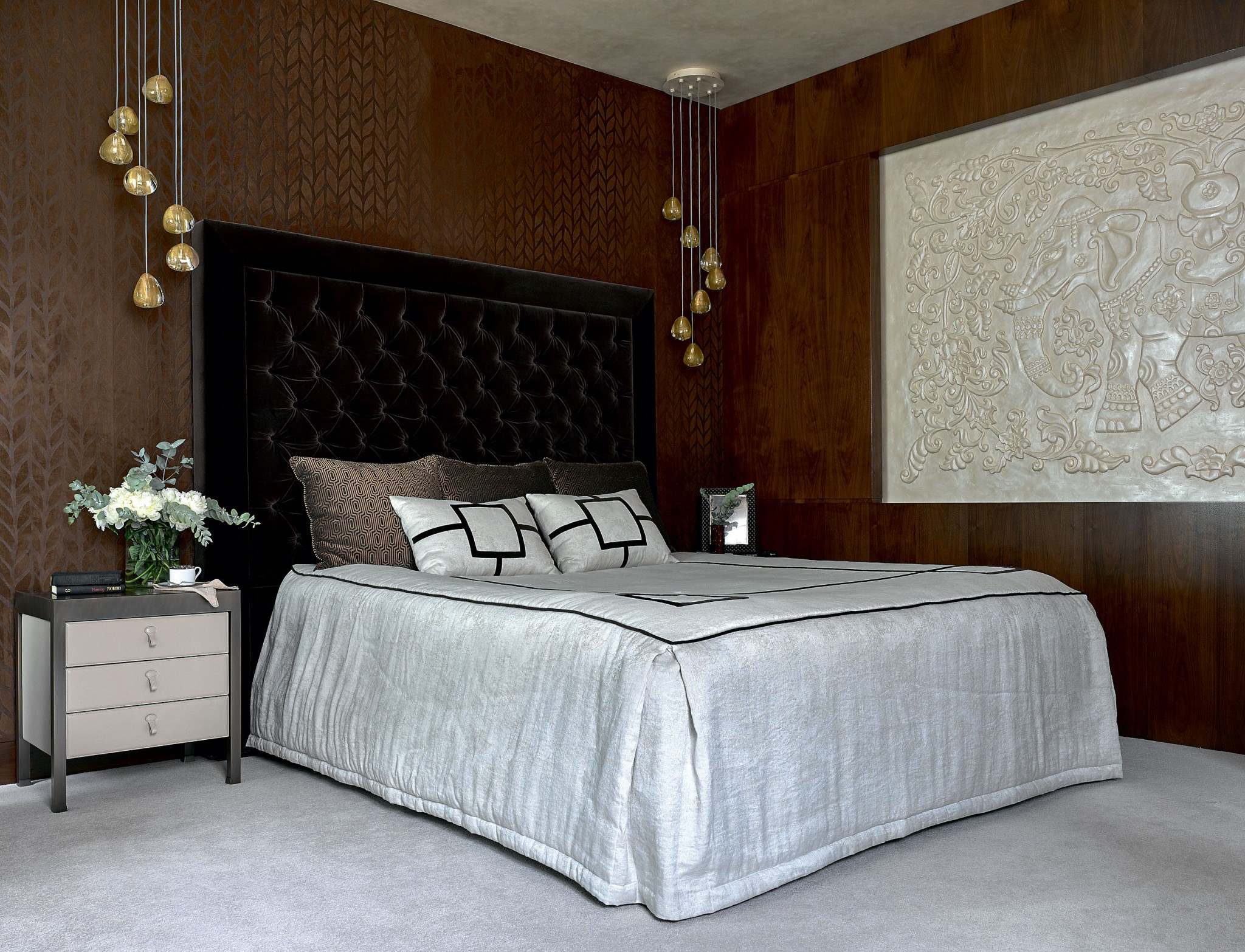 Среди других помещений квартиры особенно выделяется хозяйская спальня. «Я очень люблю, когда заказчики разрешают сделать тёмную спальню. Тёмная, бархатисто–шоколадная среда мне представляется очень расслабляющей, деликатной, здесь не нужны яркий свет и яркие акценты», — рассказывает Мария Бахарева. Детские комнаты в квартире получили нарядное, «ар-декошное», по выражению авторов проекта, оформление. В кабинете царит строгая деловая атмосфера: стол, обитый кожей, простые стеллажи и удобное кресло. Хозяйская ванная получилась очень женственной благодаря туалетному столику с ящичками, расположенному у окна и выполненному на заказ. Здесь вообще много авторских решений, интерьер, можно сказать, tailor-made — индивидуальный. Все столярные изделия, часть мебели, необычные фактуры в отделках — всё придумано и разработано авторами проекта специально для объекта.