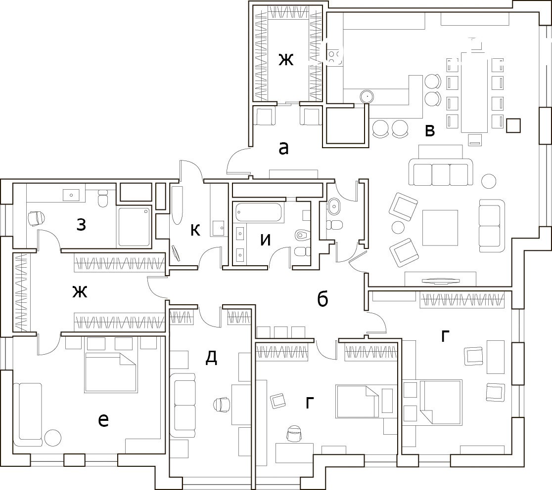 Как и хотели хозяева, квартира получилась очень функциональной. Здесь есть просторная гостиная-столовая — место встречи семьи и гостей. При желании же каждый может уединиться в своей отдельной комнате — для этого предназначены спальня, кабинет и две детские. К хозяйственной части относятся два санузла, постирочная и гардеробная.
