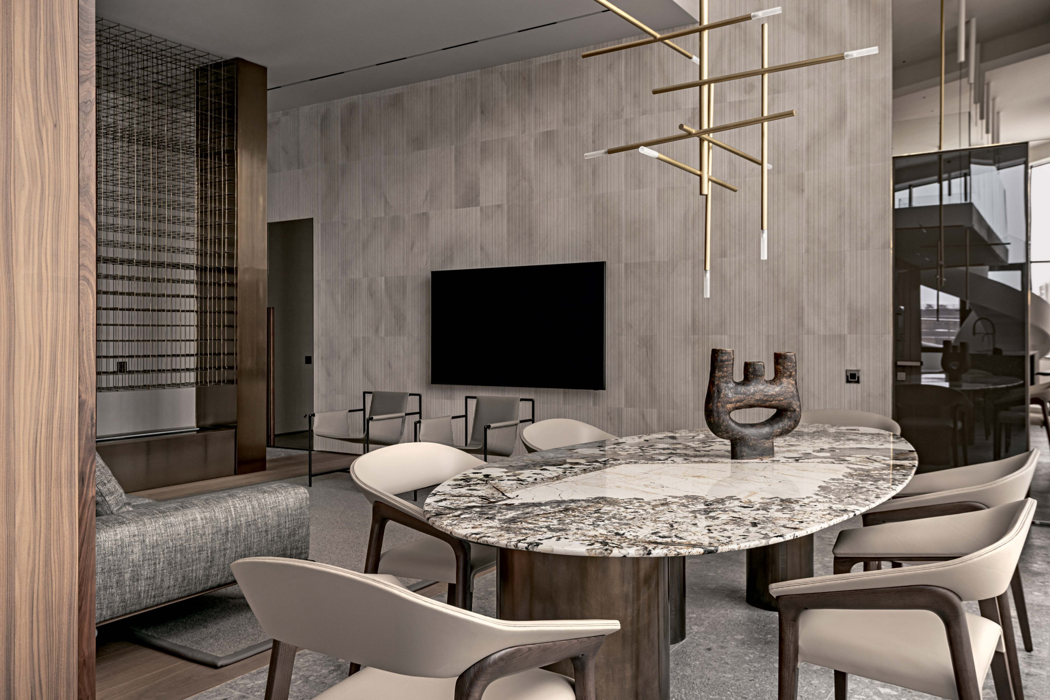 Главная особенность пентхауса — абсолютная свобода пространства и максимальная связь с окружающей средой. Интерьеру свойственна масштабность, усиленная живописными видами на прилегающий парк и реку. Используя благородные фактуры камня, дерева, металла, кожи и текстиля естественных тёплых оттенков в сочетании с шикарным панорамным остеклением, авторы проекта создали впечатление парадности и усилили связь природы с внутренним пространством. «Нам импонирует то, как развивается, меняется современный интерьер сегодня, — размышляет Михаил Кисенко. — Он становится мягче, легче, богаче за счёт разнообразия фактур. Наверное, это ведущая тенденция в дизайне, и она нам очень близка. Так, в оформлении гостиной доминируют натуральный