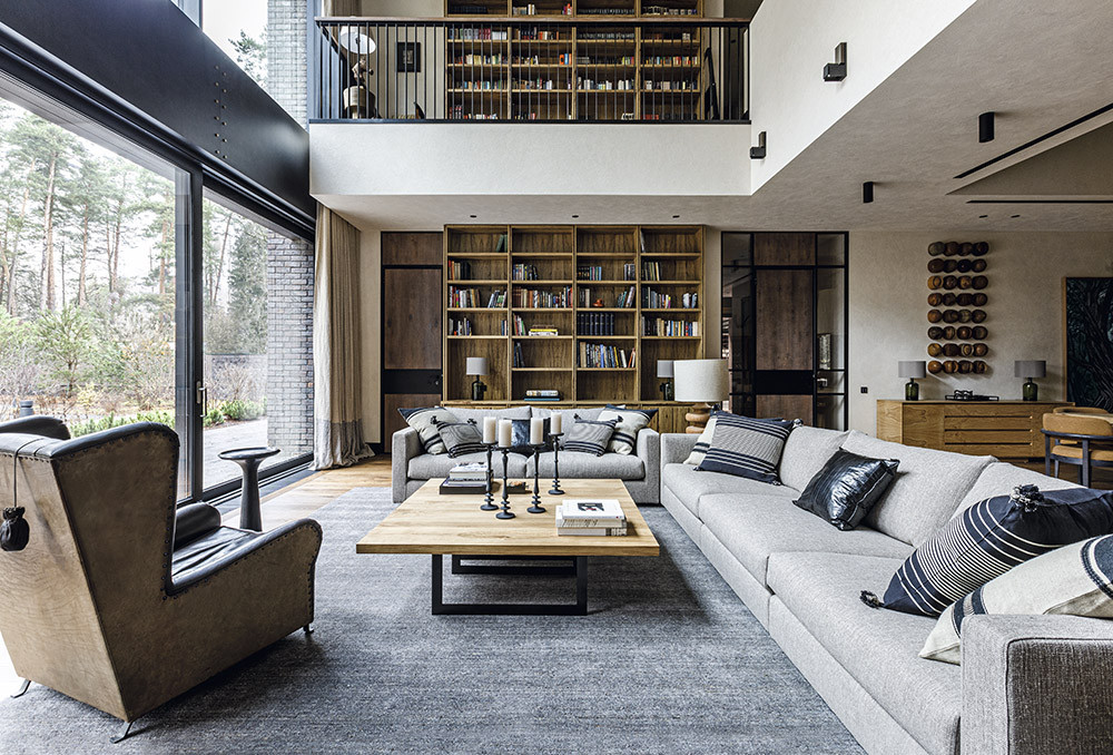 Дом расположен в живописной исторической части ближнего Подмосковья и окружен сосновым лесом. Благодаря высоким окнам в пол деревья становятся буквально частью открытого пространства единой общественной зоны. Ее разместили на первом этаже дома в двусветном объеме. Гостиная и столовая с камином стали центром правого крыла здания, где также оборудована просторная кухня и большая гардеробная. Слева к гостиной примыкает блок с более камерными общественными помещениями — рабочим кабинетом хозяина, медиазалом и детской игровой. Их отделяют стеклянные двери, дизайн которых был создан по авторским эскизам архитектора и воплощен в жизнь студией Floatech. Также в левом крыле дома оборудованы бассейн, спортивный зал и комнаты отдыха. Второй этаж традиционно отвели под приватный блок с главной спальней, детскими и гостевыми комнатами. Кроме того, в доме спроектировали несколько террас для семейных обедов и отдыха на свежем воздухе, а на крыше запланировали домашний огород. Интерьер и экстерьер дома объединены не только функционально, но и через декоративные решения. Например, для облицовки фасада использован кирпич ручной работы от компании Architile. Он же украшает часть стен в общественной зоне, что в сочетании с высокими окнами стирает границу между внутренним пространством и экстерьером. «В этом проекте есть определенный парадокс. Хотя интерьер очень сдержанный и построен на сочетании природной цветовой гаммы, серо-бежевых тонов и лаконичных предметов мебели, он неизменно производит вау-эффект. Достичь такого результата нам удалось благодаря работе с пространством и гармоничному расположению привлекающих внимание элементов», — продолжает Екатерина. В просторном двусветном объеме гостиной-столовой таких акцентов несколько, но главную роль играет семиметровый камин, который тянется во всю высоту потолка. Его фасад оформлен круглым выпуклым зеркалом, подложку для которого по авторским эскизам архитектора создал художник Денис Милованов из дизайн-студии SOHA. Он же изготовил масштабный обеденный стол из массива дерева, спроектированный Екатериной Серафимович. Также по спецзаказу спроектирован и светильник JNL с тремя огромными абажурами, которые выделяют обеденную зону. Поддерживает игру на привлечение внимания и декоративное панно в столовой зоне, которое состоит из 32 винтажных болванок, используемых в изготовлении шляп.