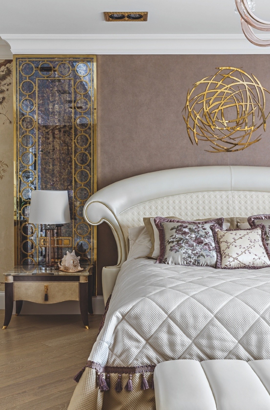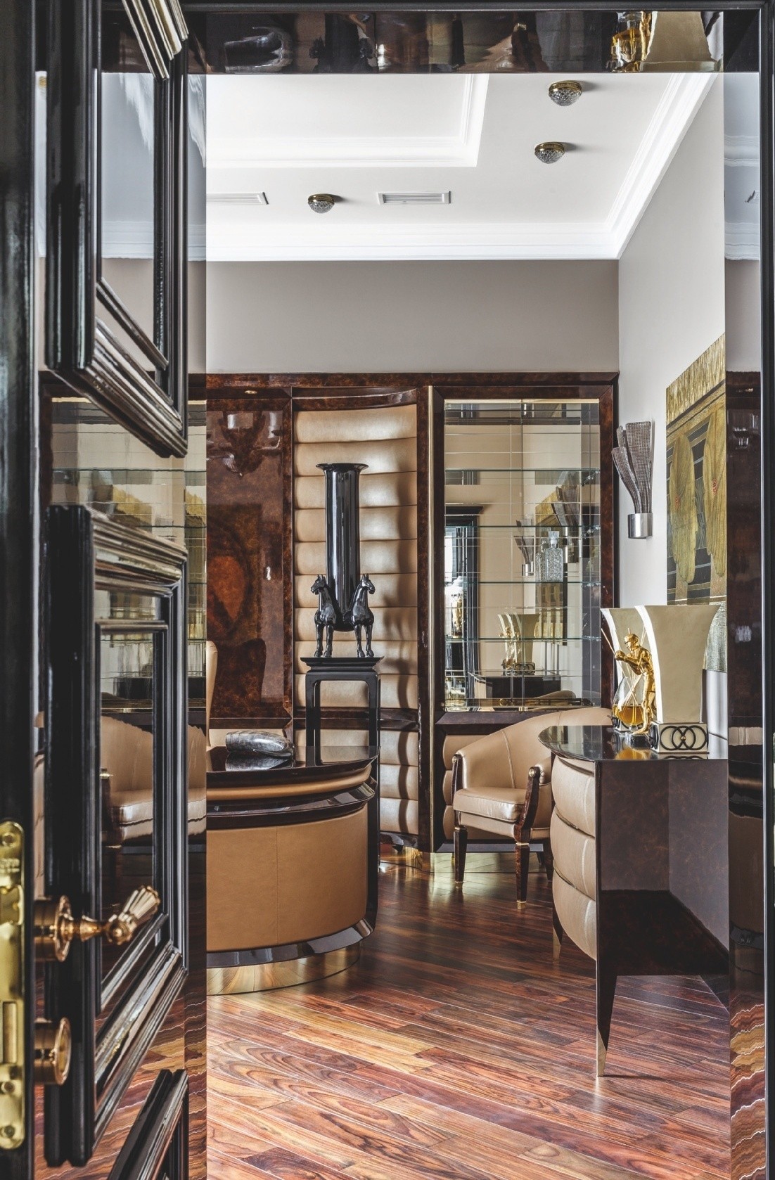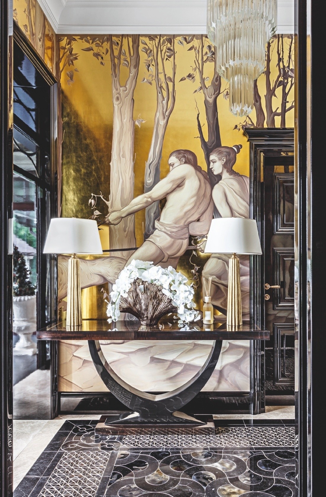 — Да, внутри всё совсем иначе. Владельцам хотелось получить дом мечты, создать то, чего у них ещё не было. Лоск, шик, блеск глянца, размах ар-деко, роскошь натуральных материалов — это то, что им нравится. Понятно, что выбранный стиль контрастирует с местностью, где мы собирались построить их будущий дом. И, конечно, это никак не вяжется с лесом, озером и дикими зверями. И тогда у меня появилась идея расписать стены входной группы, откуда и начинается погружение в стилистику центральной части дома. За основу темы росписи взят мифологический сюжет «Диана на охоте в окружении собак». Весь периметр входной группы покрыт золотой поталью, на которую нанесена в стиле гризайль тематическая роспись. Она выполнена в духе художников эпохи Возрождения и смотрится как икона на золотом фоне. Её автор — талантливый художник Максим Одаряев, который пишет иконы и расписывает храмы. Именно эта часть пространства и выбранный сюжет для росписи задают дому то самое уникальное настроение и индивидуальность.