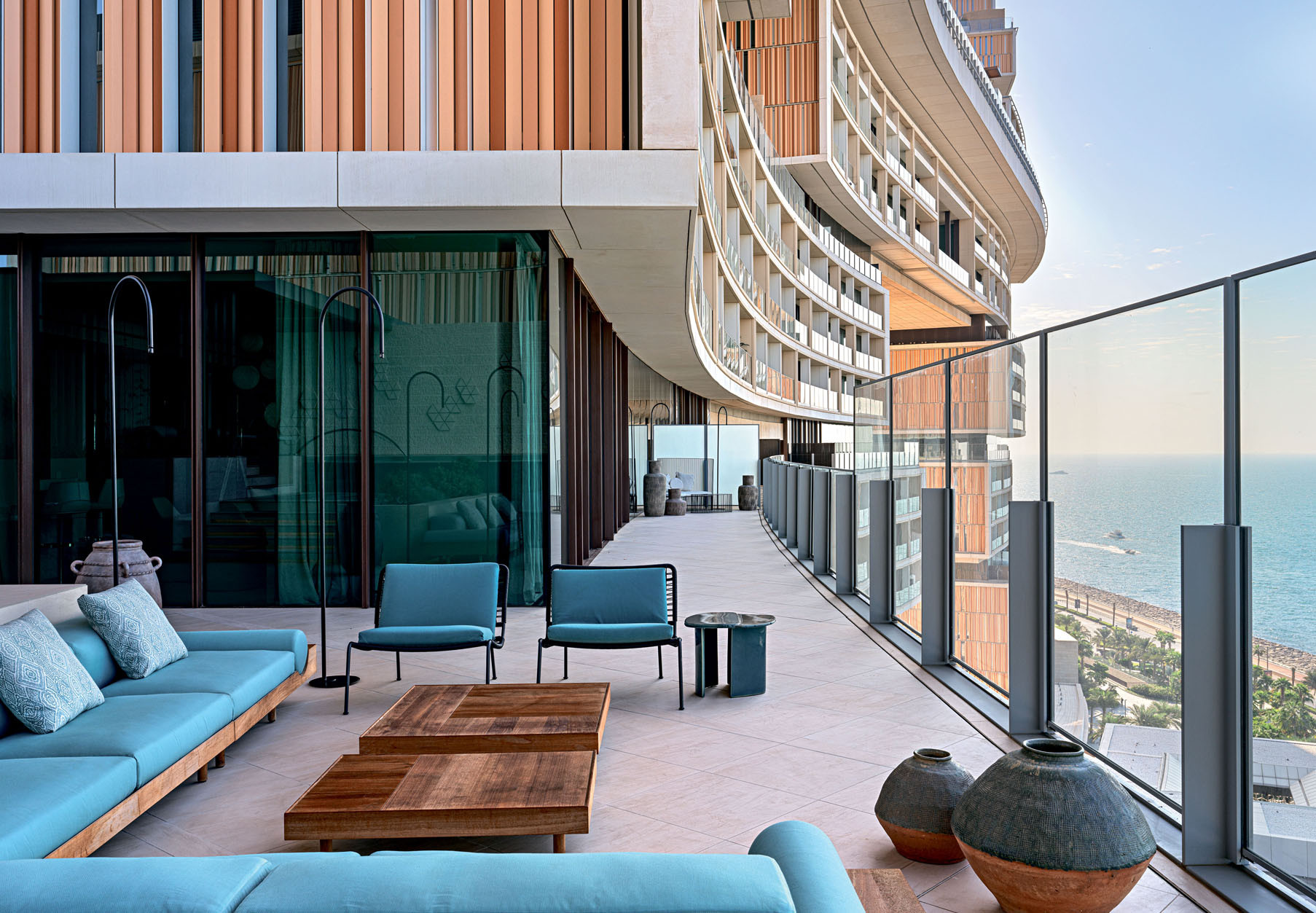 На 13-м этаже знакового комплекса Royal Atlantis на Пальме Джумейра дизайнеры «Арт и дизайн галереи Mobillissimi» создали интерьер для семейного отдыха. Здесь средиземноморская легкость встречается с приморской эстетикой, сдержанным европейским минимализмом и статусностью одного из самых роскошных проектов, созданных в Дубае. Заказчики — постоянные клиенты студии — пожелали отразить в интерьере дух курортного отдыха: лаконичные линии, природные оттенки бирюзы, песка и морской пены. Интересные фактуры, но без избытка декора, который характерен для восточных интерьеров.