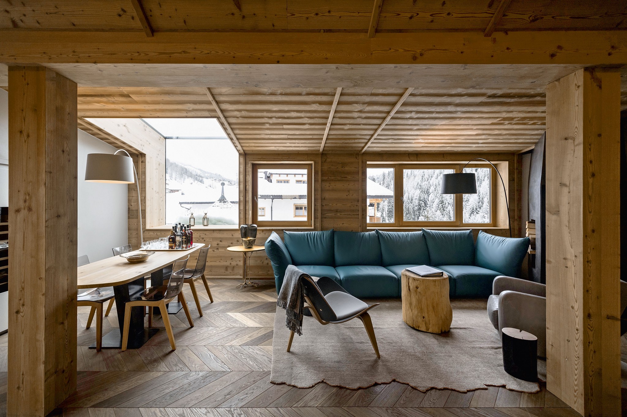 Итальянская часть Альп, Доломитовые горы или просто Доломиты, хороши уже из окна самолёта. А при ближайшем рассмотрении оказываются ещё краше: заснеженные пики утопают в бесконечных лесах. Пейзаж сколь сурово– монохромный, столь и завораживающе–притягательный. Здесь, конечно, есть и горнолыжные курорты, куда приезжают кататься. Но всё же, в отличие от соседней Швейцарии, главное развлечение Доломитов — медитативное любование окрестными пейзажами. А они без преувеличения исключительно роскошны! Этот пентхаус, например, строили с видом... на зиму. Архитекторы Тициано Вудафьери и Клаудио Саверино, а также вся команда Vudafieri–Saverino Partners признаются, что влюбились в это место, едва попав сюда. А было это зимой. И впоследствии, как они ни представляли себе жизнь проекта в дальнейшем, он всё равно ассоциировался у них исключительно с зимним настроением. Это