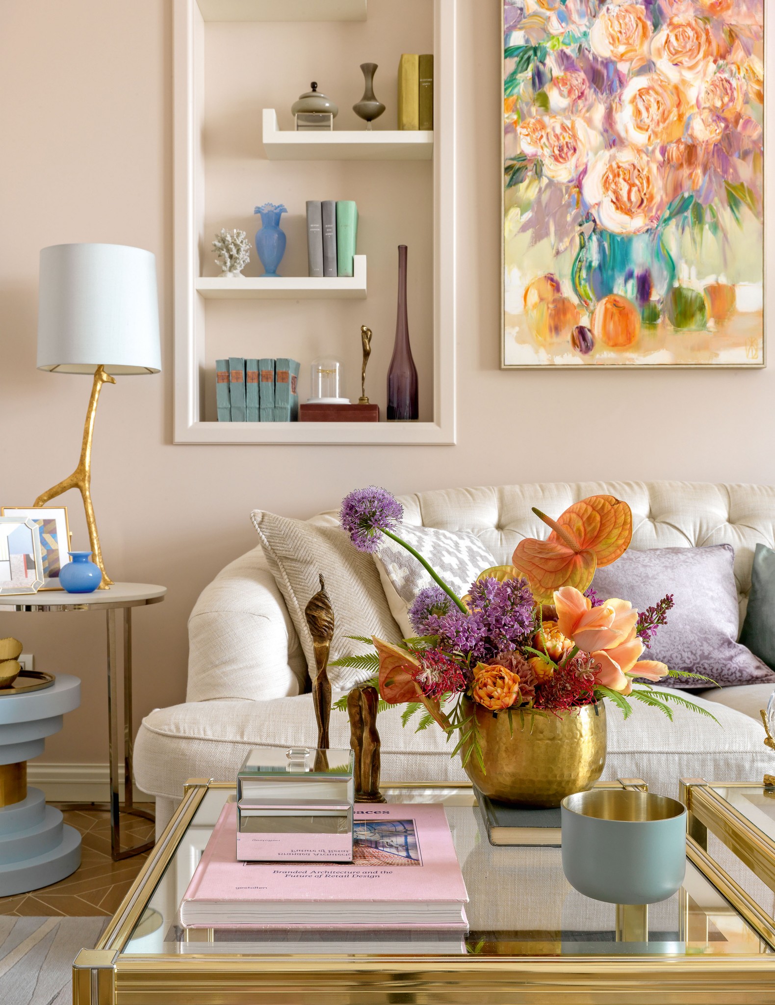 Заказчики обратились к Марине Поклонцевой, когда купили свою первую квартиру в новостройке. «Но дом ещё не был сдан, и работу над проектом мы отложили, — вспоминает дизайнер. — А примерно через полгода они купили квартиру большей площади в другой новостройке. Я начала работать над этим проектом и уже практически его сделала, когда клиенты сообщили мне, что теперь наконец-то нашли квартиру своей мечты». Это была недвижимость люксового уровня в новом ЖК в центре Москвы: во дворе фонтан, подъезды отделаны мрамором, в зоне ресепшена — камин с креслами. Квартира с гостиной, спальней, кухней и двумя санузлами была разумно спланирована, однако заказчики — супружеская пара с маленьким сыном — попросили сделать из двухкомнатной квартиры трёхкомнатную. Стилистически это должна была быть лёгкая классика в спокойных тонах. «Очень медленно и методично я меняла представление заказчиков о спокойных оттенках, вводя тонкие цветовые сочетания, разбавляя хромовые детали золотистыми», — рассказывает Марина. Персиковый тон стен оттенён, помимо золотистого, сливовым, сиреневым, оранжевым, цветом морской волны. Респектабельная, комфортная мебель в бархатных обивках, светлые тона, элементы стилистики ар–деко в дизайне зеркала, предметы современного искусства и отдельные вещи made in USA (как люстра над столом) — всё это считывается как «американский акцент», и это придаёт интерьеру неуловимый шарм. Однако главная тайна квартиры в том, что это интерьер, «сшитый» по индивидуальной мерке, насыщенный авторскими решениями на всех уровнях — от планировки до декора